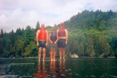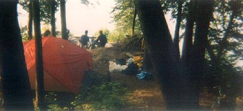 My partner and I walked back the 5k to our canoes and paddled to camp arriving at about 12:30 p.m. They were all glad to know that we had found a different way out. We swam right away and then ate lunch. At about 3:30 p.m. the other two came on the FRS radio to report they were back at their canoes and the operation was successful. When they got back to camp we realized that they had been into Dorset for lunch and a beer, but that they had brought back a chicken for dinner and a dozen eggs and bacon for breakfast tomorrow! We had chicken, noodles 'n sauce, and mashed-potatoes and gravy for dinner. I think it was the best interior dinner I have ever had!