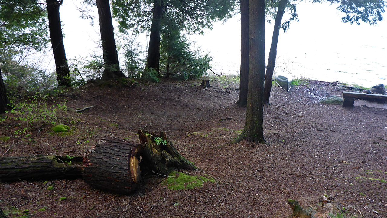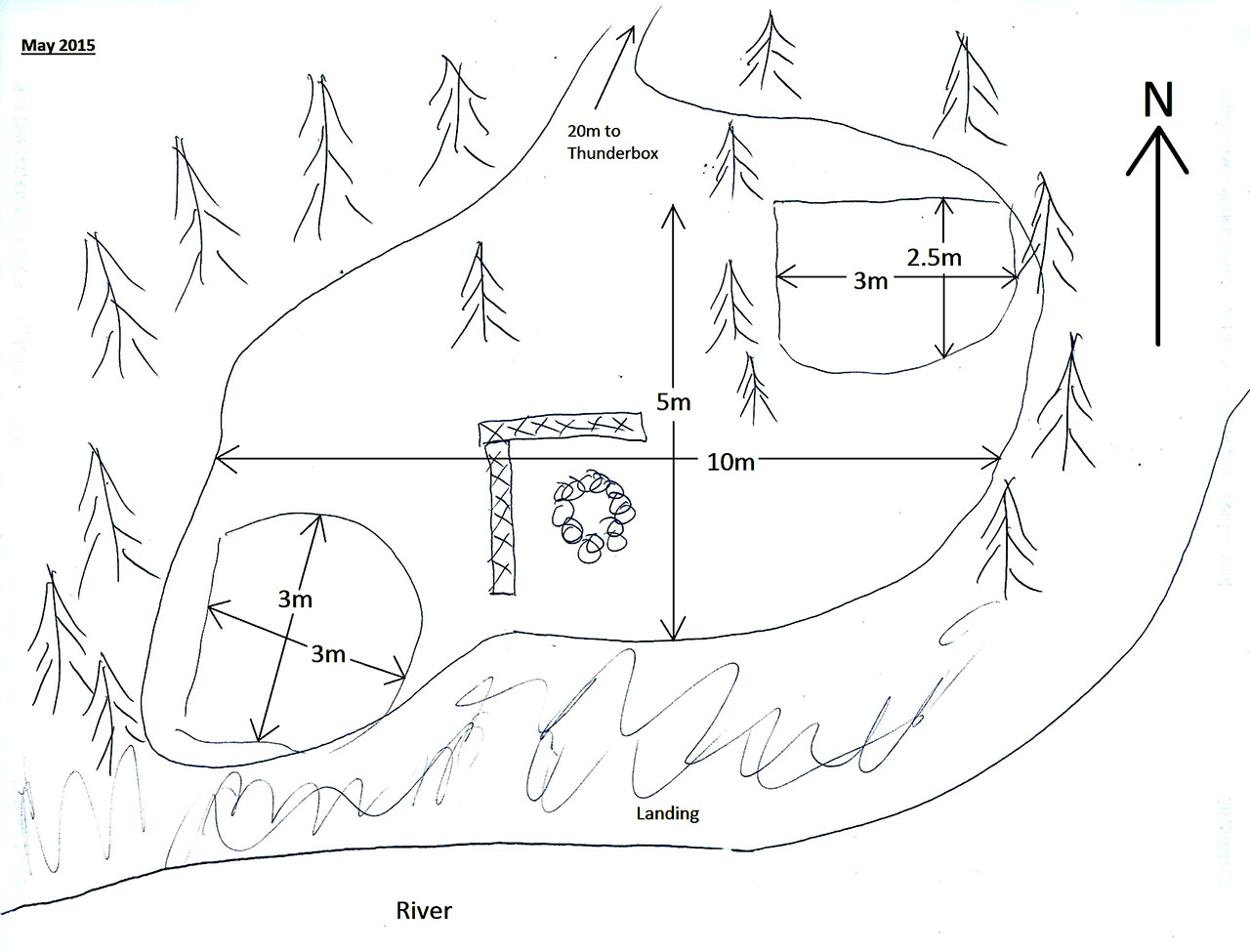 Campsite Regular or low-maintenance: Regular Size of open ground area: 10m x 5m. Extent of tree cover: 75% mostly at rear of site. Degree of levelness: Sloped slightly from back to front. Number of tent sites: 2 levelled sites. North exposure: Trees. East exposure: Trees. South exposure: Open view of river. West exposure: Good view of river from front of site, trees at back. General description: Small site, good for 2 x 3-man tents, there is another somewhat sloped and unlevel area could be used for a 3rd tent. Exposed to wind from the west and south. Front of site is open to sun for most of the morning and early aftermoon. Overall accessibility: No issues.