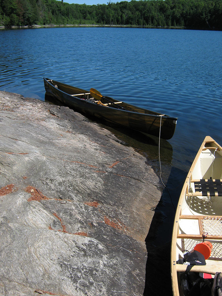 Landing Topography of under-water approach: North-east facing landing, large sloping rock down into water, with small area of 1' deep sand bottom. No obstructions to landing. Impediments to disembarking from and/or unloading a canoe: Take care when stepping out on to sloped rock if it's wet. Topography to tent sites: 15' rise to actual firepit and tentsite area, which is located way back into the trees.