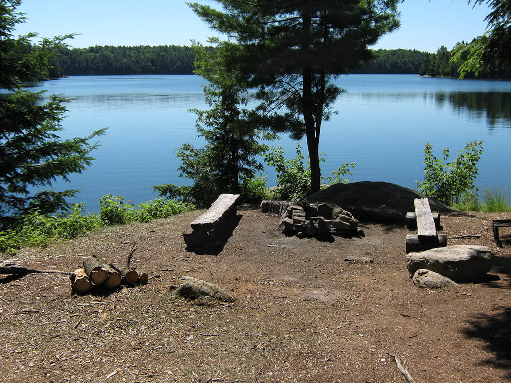 Landing Topography of under-water approach: Moderate rounded slabs with smaller rocks about. There's a soft landing area to the east. Impediments to disembarking from and/or unloading a canoe: Rocks could be slippery if wet. Adjacent rock slabs good for holding gear. Topography to tent sites: 12' rise to actual firepit area, which is located close to and overlooking the water.