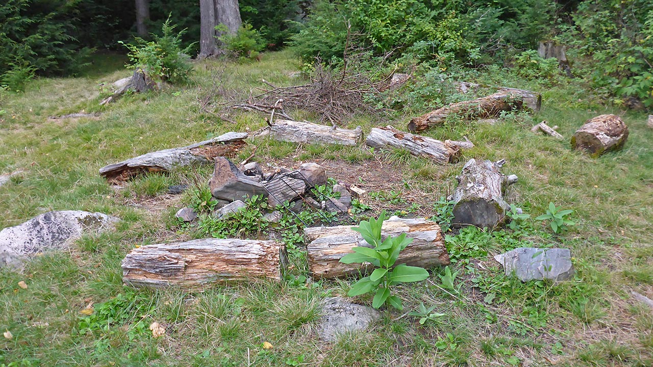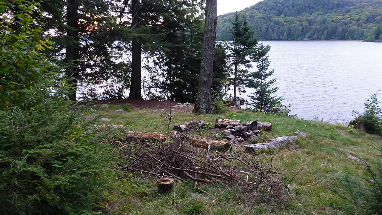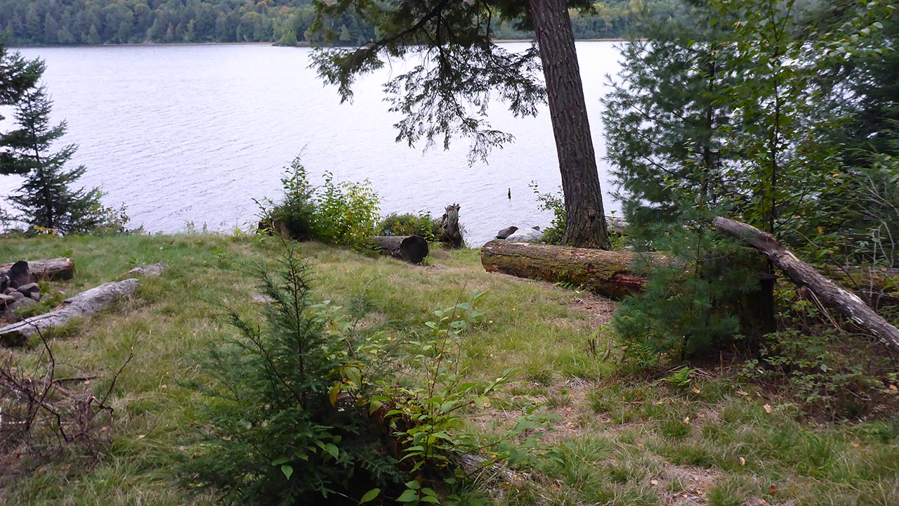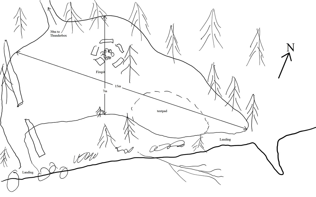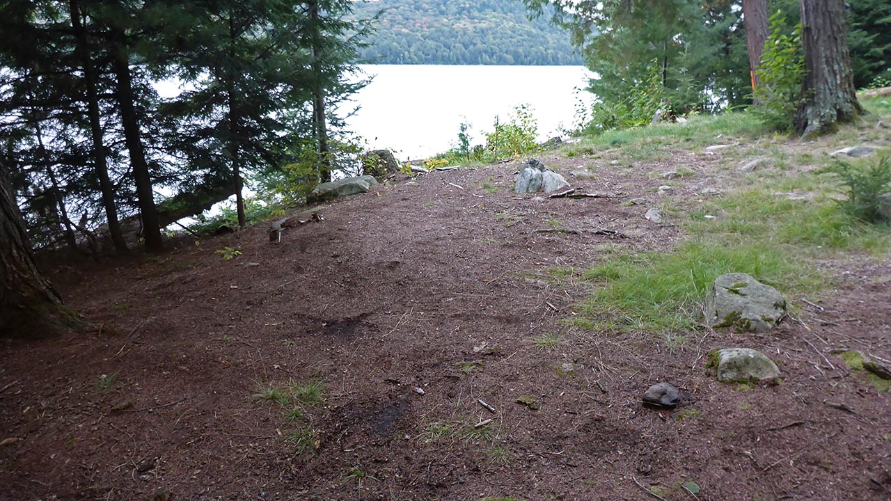 Campsite Campsite maintenance: Regular Open ground area: 15m x 7m. Extent of tree cover: 20% . Degree of levelness: Level only at tentpad. Number of tent sites: 1. North exposure: trees. East exposure: trees and view of lake. South exposure: view of lake. West exposure: trees. General description: Only 1 place level enough to tent on. Very significant slope throughout the site. Very open sunny site, well protected from any westerly wind. Overall accessibility: The slope from the west landing, and the rocks at the east landing make accessibility a slight concern.