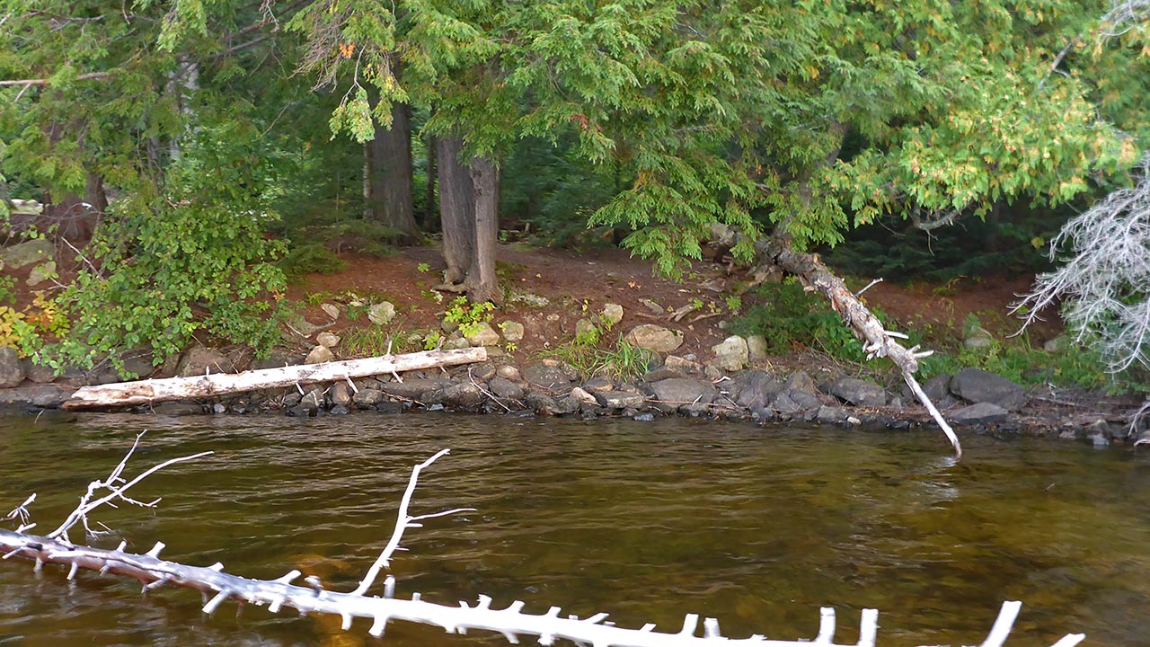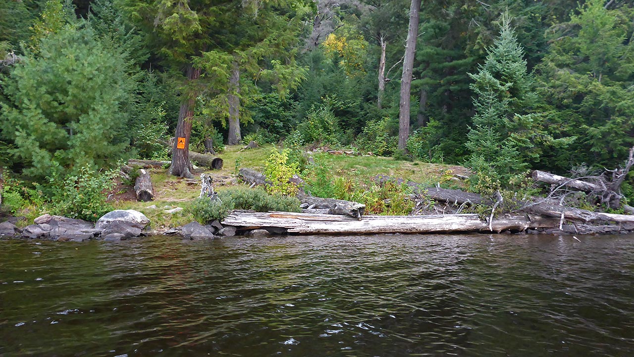 Landing Topography of under-water approach: : Rock and gravel. Impediments to disembarking from and/or unloading a canoe: 2 landing areas. Landing at west side of site can accomodate 1 canoe. Landing at east side is protected somewhat from wind but must load/unload over a rocky shore. Topography to tent sites: From west landing, a carry up and over of approx. 10m to firepit or tentpad. From east landing an easy carry to the tentpad.