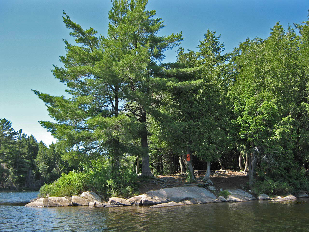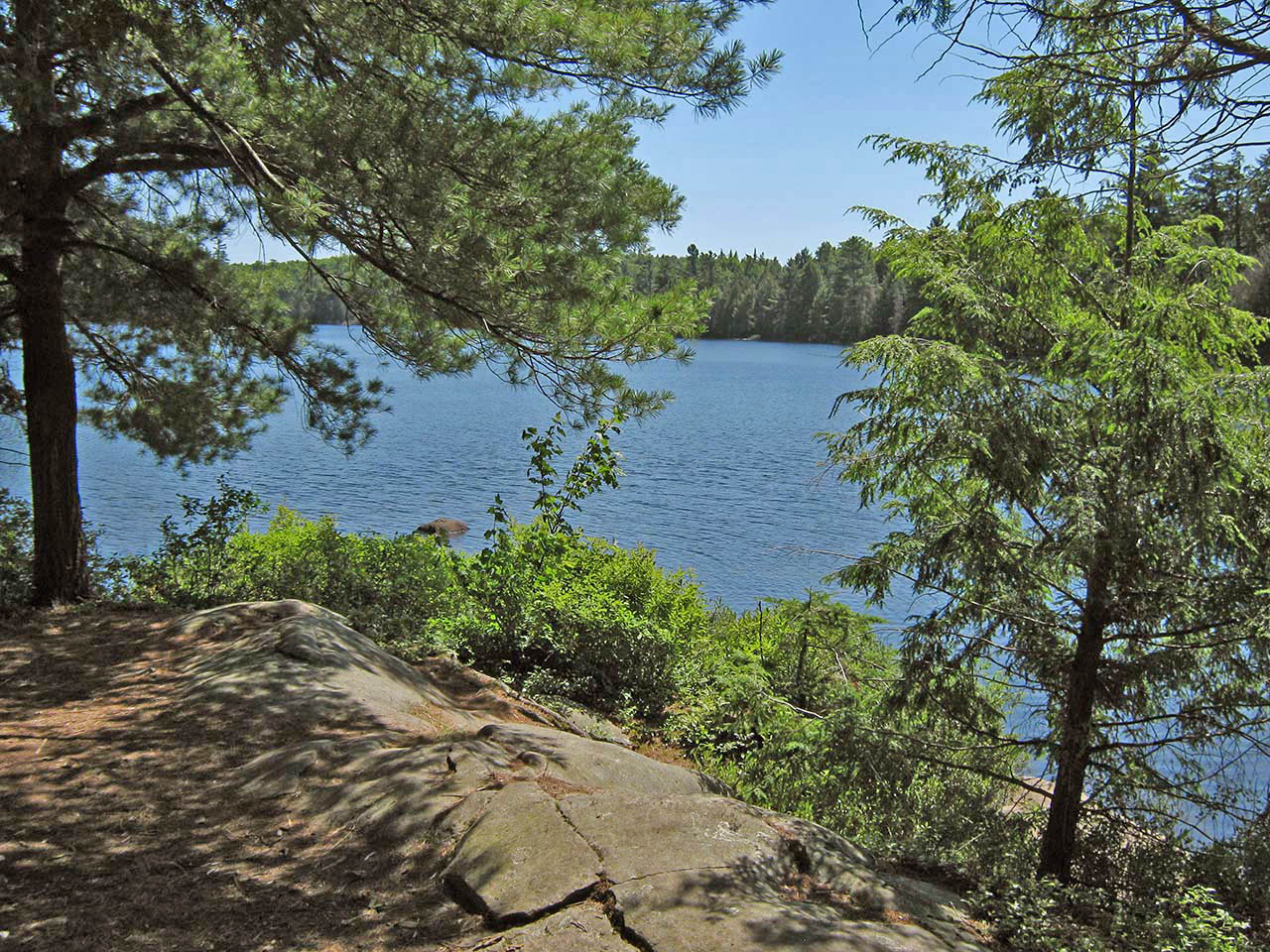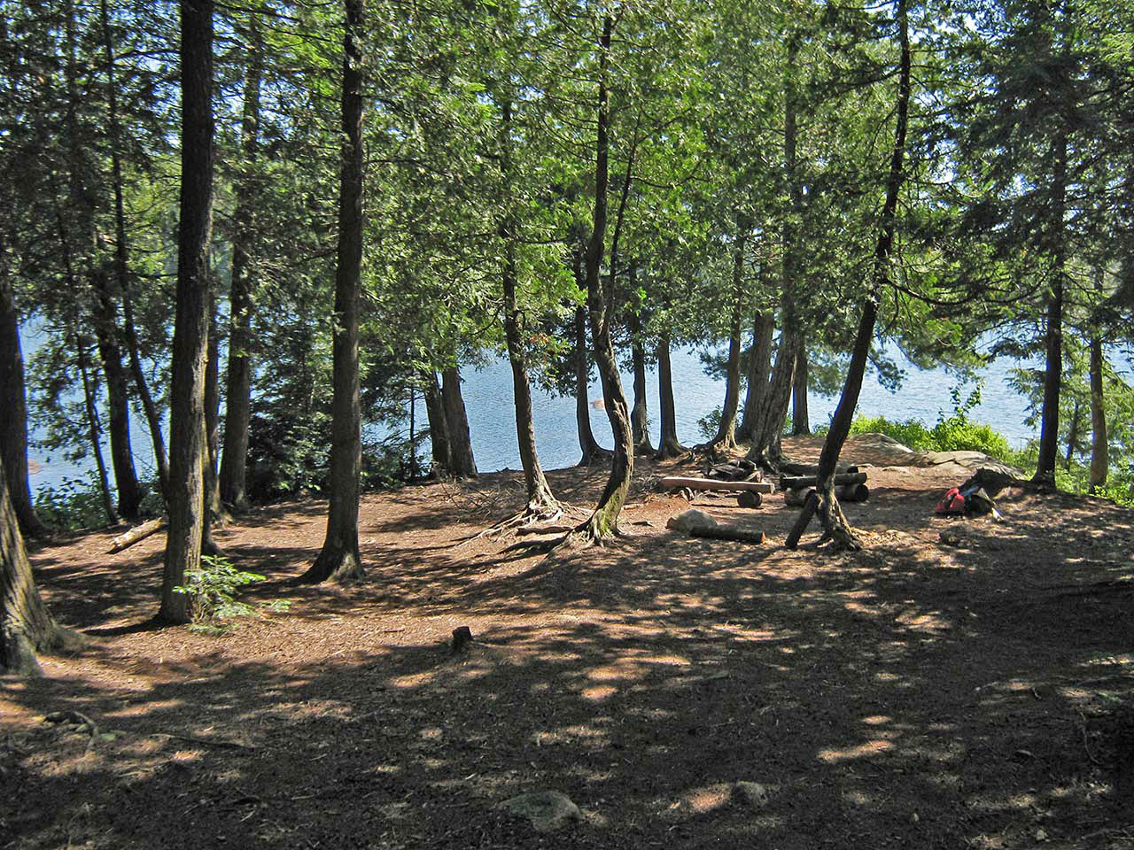 Landing Topography of under-water approach: The campsite's rock point slopes gradually into the water on its east side. Rocks form a couple of sandy-bottomed slots to bring canoes to shore. Impediments to disembarking from and/or unloading a canoe: None, but stepping out into shallow water to unload is to be expected. Topography to tent sites: 10' rise over distance of about 30' to the firepit area. Landing area is to the right of the point ... The landing rocks have a morning-through-mid-afternoon exposure... Looking down from the campsite to the landing ... Campsite Campsite maintenance: regular Size of open area: Cedar trees are quite dense over the actual campsite. Extent of tree cover: While there are two large white pines on the point, cedars shade the majority of the campsite. Degree of levelness: Campsite has a moderate slope from the north to south, toward the water. Number of level tent sites: Enough separate areas for at least three medium size tents. Firepit gets some cross-breeze only when the wind is blowing strongly ... Tentsites are located relatively close to the firepit... North exposure: Forested mainland comprises the north end of the point. East exposure: Forest is thick beyond firepit area. View along east shoreline from rocks by the water. South exposure: View from firepit area is limited by pine trees, cedars and shrubs. West exposure: Late afternoon sun works its way through shoreline trees and shrubs. Looking south from the firepit through the trees and across the lake ... General description: This campsite is somewhat confined. While it will provide shelter from cold shoulder-season winds, it won't allow much bug-clearing summer breeze or sunshine to get through. Overall accessibility: The shoreline rocks, slight climb from the landing, and the site's overall slope might deter children or seniors. ![]() Thanks to Jeffrey McMurtrie of Jeff'sMap for supplying the base-layer map component by Creative Commons licensing. Submission February, 2015 by Barry Bridgeford .. visited July, 2011 |