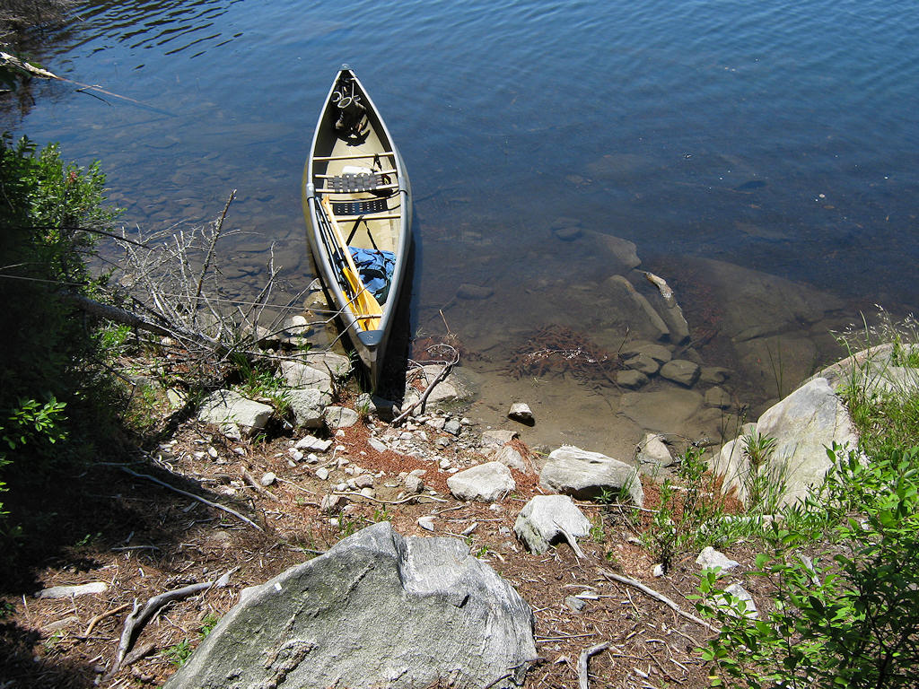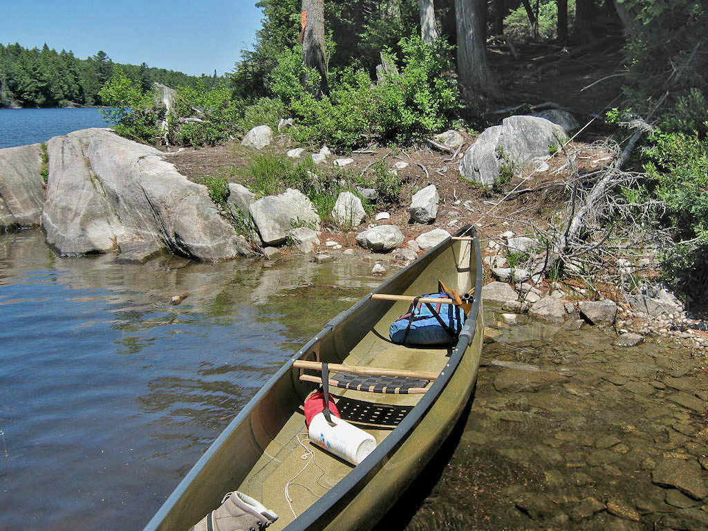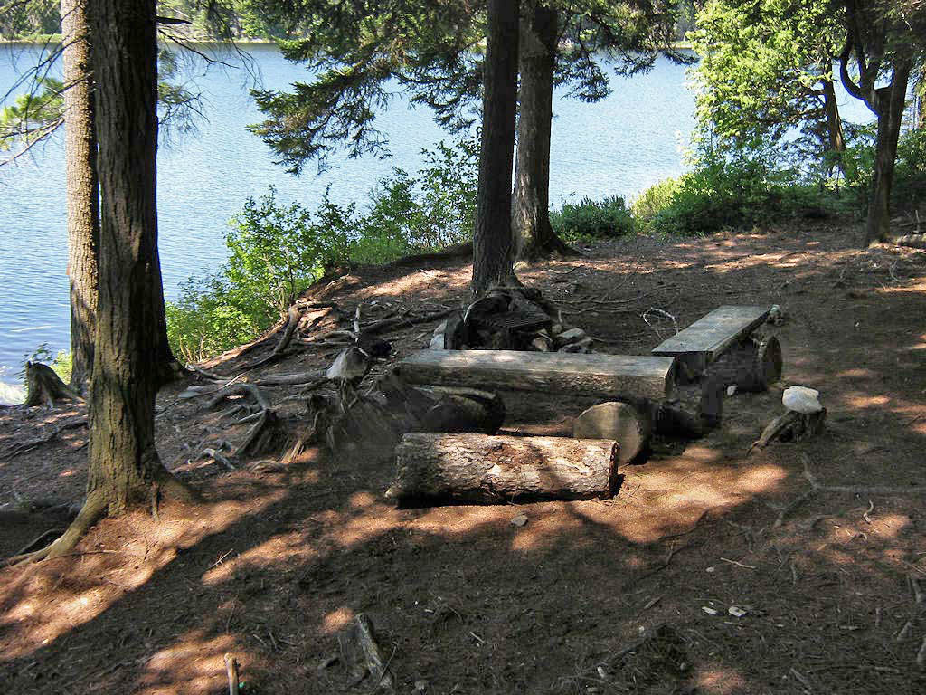 Landing Topography of under-water approach: Rocky beach beside some larger rocks. Impediments to disembarking from and/or unloading a canoe: Necessary to step out into water to unload. Topography to tent sites: 15' rough grade (at around 30 degrees) to the firepit area. Landing is a small rocky beach, with a rise to the firepit area ... Looking down from the firepit area to the landing ... Campsite Campsite maintenance: regular Size of open area: None Extent of tree cover: Entirely treed over. Degree of levelness: Small area around firepit is level enough for one tent close-by. There's a steep ascent to a second tentsite. Number of level tent sites: Limited area supports only two tents. North exposure: Treed shoreline severely limits view. However the north wind can slip in under the overhanging trees. East exposure: Solid forest. South exposure: Trees limit the view and block the sun. West exposure: Trees limit the view and block the sun. Firepit area which includes a single tentsite close-by ... Firepit area which includes a single tentsite close-by ... General description: This is a very shaded, small and rough campsite. And there's a steep rocky-gulch climp up to the thunderbox. The only full view of the lake is from one shoreline rock area. Being located at the south end of the lake, the view across isn't all that great. Overall accessibility: Considerable climbing up and down within the campsite. ![]() Thanks to Jeffrey McMurtrie of Jeff'sMap for supplying the base-layer map component by Creative Commons licensing. Submission April, 2012 by Barry Bridgeford .. visited July, 2011 |