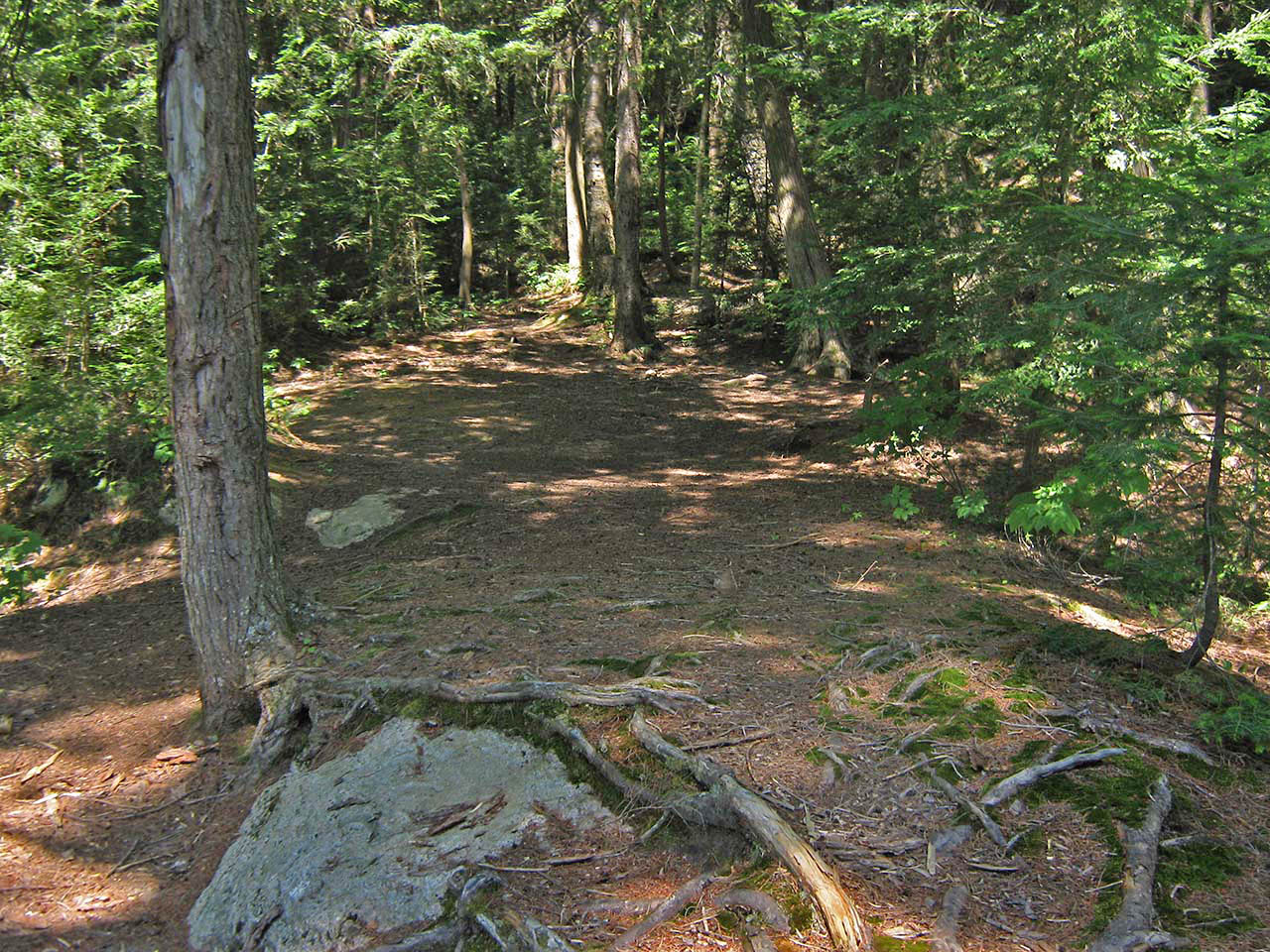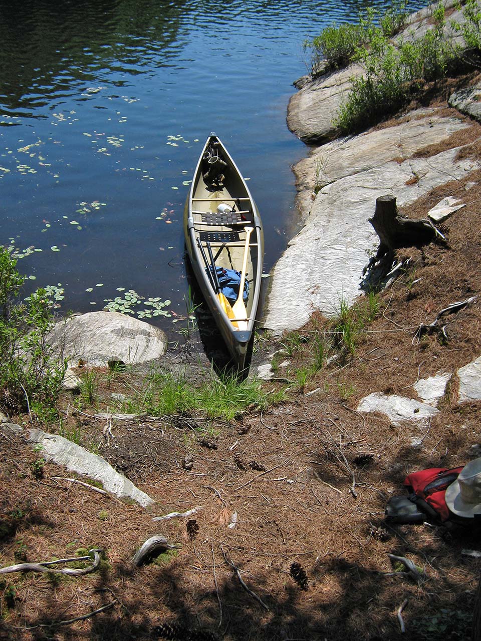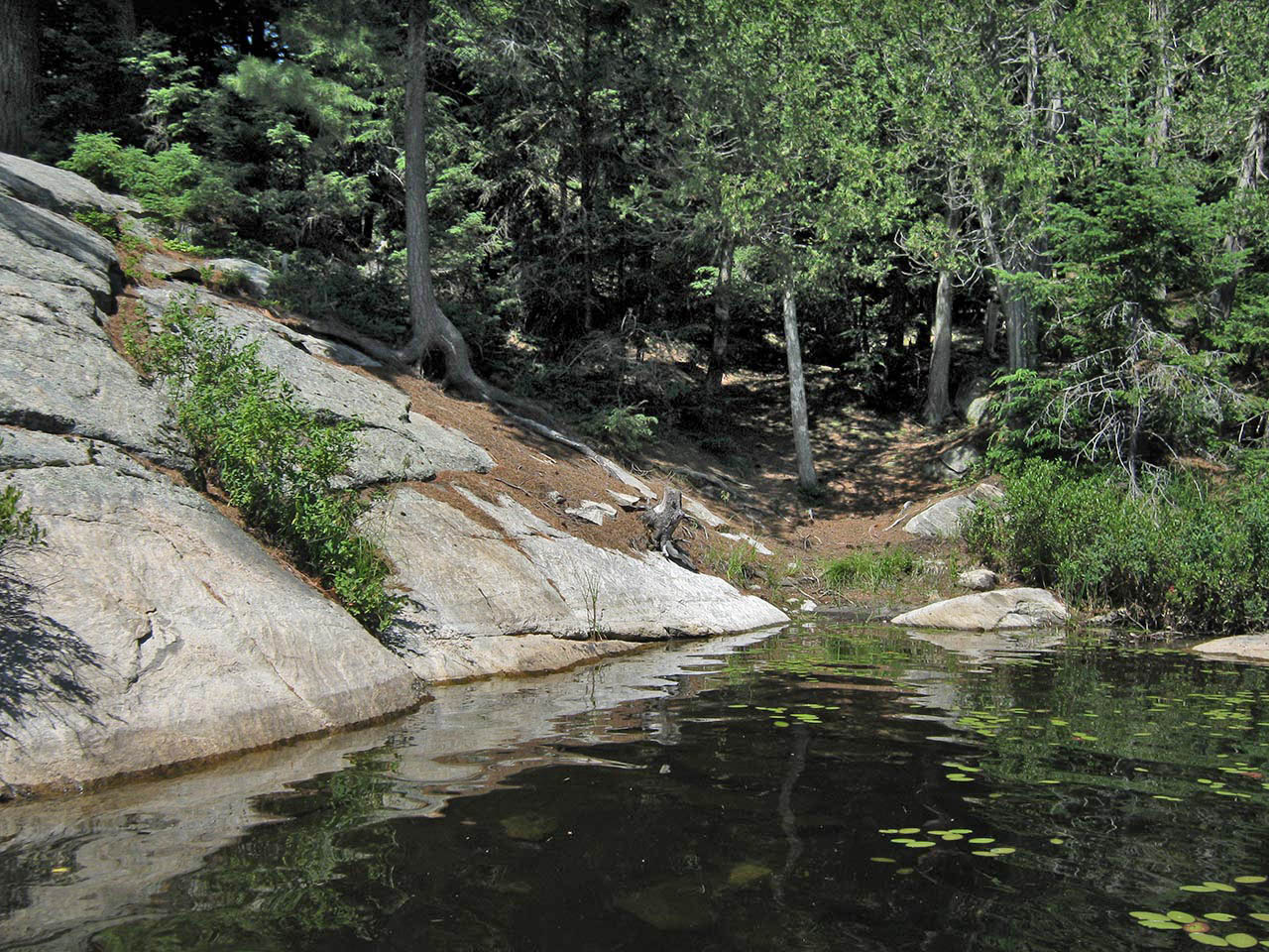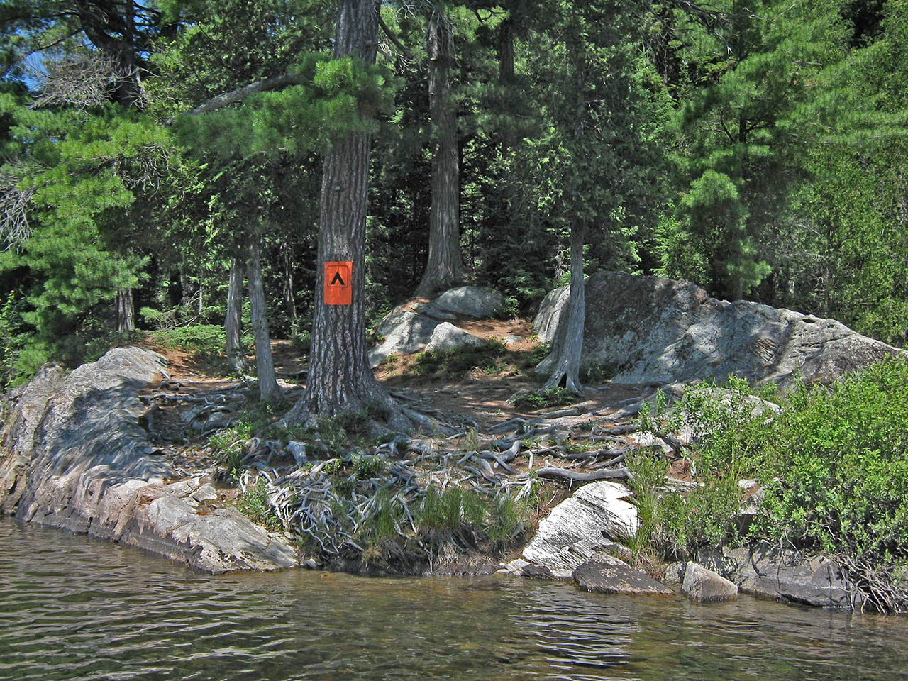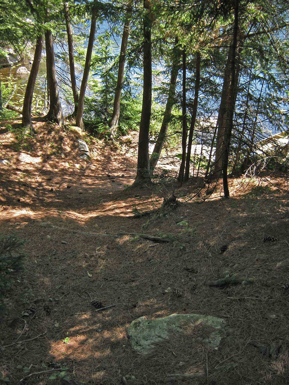 Landing Topography of under-water approach: The campsite's rock point slopes down to the water on the east side. There's an organic bottom to the small landing area. Impediments to disembarking from and/or unloading a canoe: Stepping out into mucky water to unload is to be expected. Grade immediately starts at water's edge. Topography to tent sites: 25' rise over distance of about 40' to the tentsite and firepit areas which are on different levels. Small landing area is behind the point ... Mucky landing area alongside sloping rocks... Ascending slope rises immediately from the water ... Campsite Campsite maintenance: regular Size of open area: Series of small open areas on different levels comprise the campsite. Extent of tree cover: Pine and cedar trees are quite dense over the entire campsite. Degree of levelness: Campsite has number of small level areas at different heights. Number of level tent sites: Separate level areas for three medium size tents. Trail up from the water to the campsite ... Small firepit area is blocked from the lake by trees ... Tentsites are deep within the trees, without a view of the lake ... North exposure: Forest is dense on the north end of the point. East exposure: Forest is dense. South exposure: View of the lake is blocked from firepit and tentsites by pines and cedars. A separate lower open area under the pines provides a view of the lake to the south. West exposure: One small elevated area gives a very limited view of the lake. Looking west through the trees and across the lake, from a single small vantage point ... General description: This campsite is extremely confined. While it definitely provides shelter from cold shoulder-season winds .. it will be a stuffy, buggy and unattractive during the summer. The only open breezy area is on a lower level closer to the water on the southwest side of the point. Overall accessibility: The mucky landing, steep ascent and multi-levels could be troublesome to young children and some seniors. ![]() Thanks to Jeffrey McMurtrie of Jeff'sMap for supplying the base-layer map component by Creative Commons licensing. Submission February, 2015 by Barry Bridgeford .. visited July, 2011 |