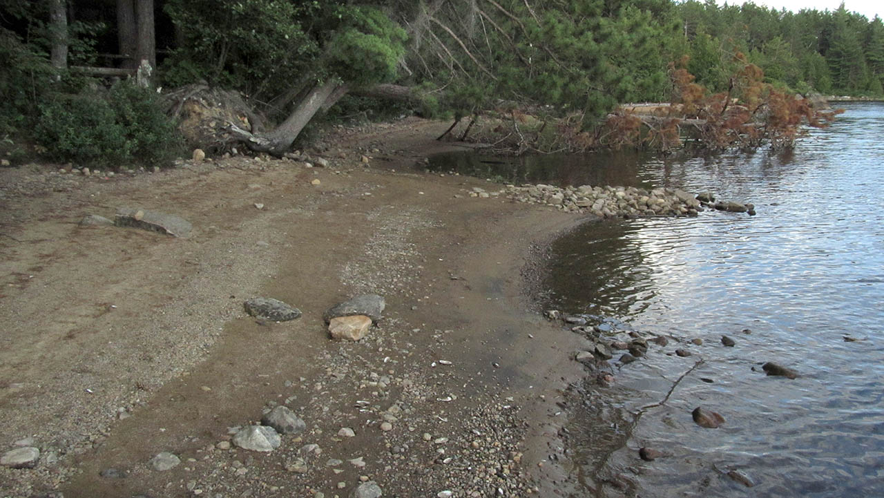 Landing Topography of under-water approach: Sand and gravel beach (spotted with rocks) extends far out from the campsite. Impediments to disembarking from and/or unloading a canoe: None. Topography to tent sites: A short climb up a sand and gravel slope to tentsites. Climb up to the actual campsite ... Campsite Campsite maintenance: regular Size of open area: It has a large open area which is an old abandonned road-bed. Extent of tree cover: Tree cover over most of the campsite. However, an open area bisects the site where the old roadbed runs. Degree of levelness: The tentsites, firepit and thunderbox are on a smooth level (the old roadbed), with a slight slope toward the lake. Number of level tent sites: Ample tentsite areas for many tents. North exposure: Solid forest blocks the north wind. East exposure: The forest blocks the view and east wind. South exposure: With the exception of a few view-breaking bushes, the south exposure is of the lake. West exposure: The northwest exposure is to the forest, with the exception of the open swath where the old roadway runs. The true-west exposure is along the shoreline. The firepit has a slight slope toward the drop down to the beach ... Tentsites east of the firepit have a slight slope toward the lake ... More tentsites on the old roadbed to the west, which are absolutely level ... General description: This campsite is good for large groups. However, it is not a particulary sunny site. In the busy season, it may have the odd camper hiking on the old roadbed and passing right through the campsite. Overall accessibility: The short slope up from the beach is this site's only accessibilty issue.