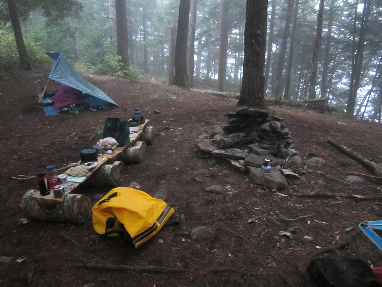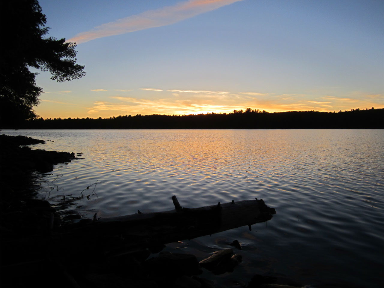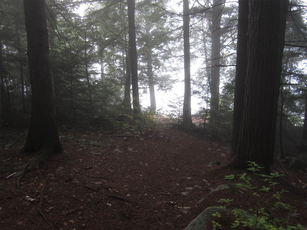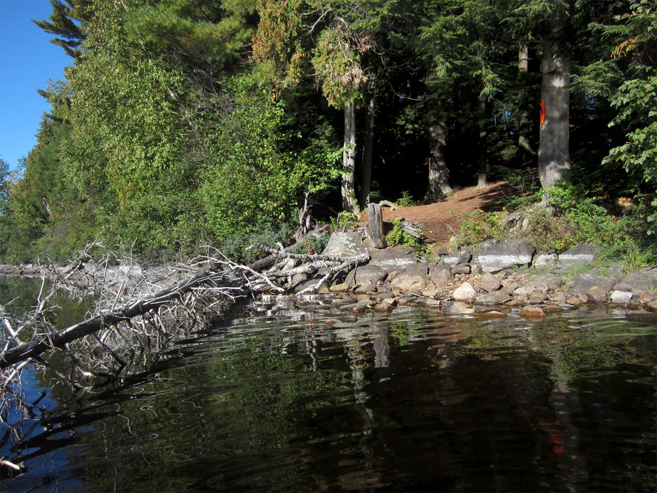 Landing Topography of under-water approach: Rocky, cobbled bottom with gradual shallowing. Impediments to disembarking from and/or unloading a canoe: Some awkward footing but mostly sound. Topography leading to tent sites: 10 to 15 meter climb from landing up to top of island where campsite is. Location of the point to disembark ... View from the top of the island down the hillside back down to the landing ... Campsite Regular or low-maintenance: regular Size of open area: Substantial open area, approximately 10 meters by 30 meters./p> Extent of tree cover: Nearly complete - 90% with only dappled sunlight getting through Degree of levelness: Crowned, but with a relatively broad (5 meter) level area on top of the island. Number of tent sites: At least two large ones - many smaller possibilities. North exposure: Very limited - heavily forested to the north. East exposure: Some exposure. While forested, it is an elevated area that can still have some exposure although it would be lessened somewhat. South exposure: Very limited and heavily forested to the south. West exposure: Some exposure. While forested, it is an elevated area that can still catch the wind from the west. Southwest over the firepit and beyond ... View north from the southern end of the open area, of the open layout of the tenting area and firepit ... View south, with the fire pit immediately behind you, the thunderbox is another 15 meters through the woods ... Looking northeast from firepit, a second view of the northern half of the site ... A pleasant and somewhat obstructed view from the thunderbox, of the lake and mature white pines ... General description: While this island is smack dab in the middle of the lake, this site offers a rather private setting with little visibility of the water from the fire pit and tentsite area. The landing is somewhat rugged and small, so that more than one canoe would pose a minor delay. There is ample room to store a beached canoe on the shoreline. The climb is short and steep up to a large, wooded but generally level and open area. Views from the top of the island are hindered by the forested hillside but a walk down either side allows access to pleasant areas to sit and relax by the water's edge. The path to the thunderbox is to the south and is an adequate distance from the tenting area and from the other campsite on the island to offer privacy. Overall accessibility: Average to good. Does not offer the majestic views of this beautiful lake but is a nice, roomy and secluded spot. View of the morning sun from the campsite's landing or "porch" ... Sunset from the western "porch" of the campsite ... ![]() Thanks to Jeffrey McMurtrie of Jeff'sMap for supplying the base-layer map component by Creative Commons licensing. Submitted by Joe Zaleski, October 21, 2013 .. visited October 2013. |