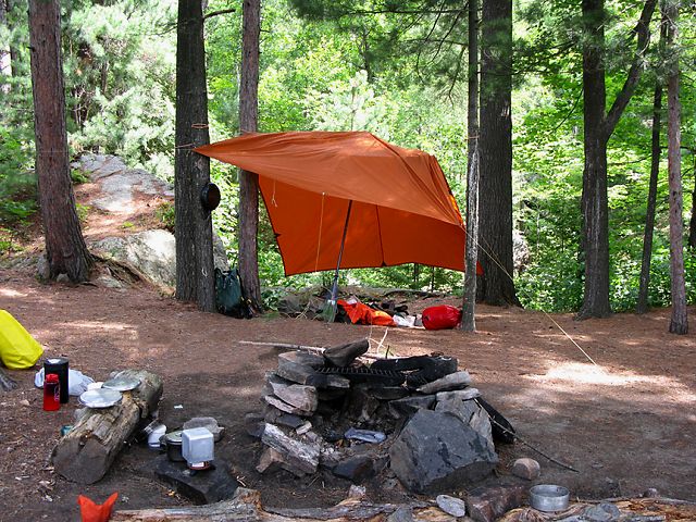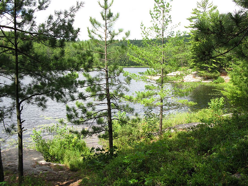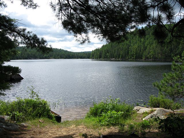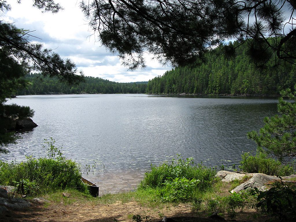Landing Topography of under-water approach: Small sandy beach landing on the south shoreline of this campsite, framed by water lily weedbed and emergent pickerel weeds. Impediments to disembarking from and/or unloading a canoe: None - all sandy, no emergent rocks nearby, shallow footing. Topography leading to tent sites: There's a 10 foot rise, all sandy with some grass, towards campsite, 30 degree angle up from the sandy canoe landing. It's good footing and the campsite itself is all flat with hard packed earth. Photo: Campsite's landing area, south-shoreline, vista is south down Carcajou Bay towards High Falls ... Photo: Northwest vista from campsite, looking up towards narrow channel back towards Grand Lake. Campsite Regular Maintenance Size of open area: 90' x 90'. Extent of tree co: 70% level - campsite gradually slopes to the east. Number of level tent sites: At least two 3-person tents. North exposure: Decent protection from the north winds, as campsite is protected by narrow channel to Grand Lake. East exposure: Protected from eastern winds due to mature forest behind campsite. South exposure: Southern exposure from canoe landing only. Nice lounging (although angled) sunny sandy/grassy area between campsite and canoe landing in that direction. West exposure: Limited western exposure due to proximity to narrow channel - horizon is narrow but would be adequately protected from strong westerly winds as a result. General description: OK campsite in terms of kitchen/tenting area. Seating around the firepit is cut logs on ground, without a table. But there is a grill for the firepit (oven rack, lol). Some nice rock outcrops to the east of the campsite proved fun for the kids to climb. Firepit well protected from any wind direction, as is the selected tenting site. Not a lot of sun exposure areas outside of the canoe landing, although there were a few rocky extensions facing west on the campsite w/o tree cover. OK sunset view, no sunrise vista. Crapper is a squat box behind campsite located in a shallow depression. Overall accessibility: Good despite the short rise to campsite from landing. Photo: South-east view from campsite - backs on to mature evergreen forest - mostly cedars and red/white pines. Tenting area is to the right of tarp ... ![]() Thanks to Jeffrey McMurtrie of Jeff'sMap for supplying the base-layer map component by Creative Commons licensing. Submitted by Stephen M. ... on August 6th 2009 |