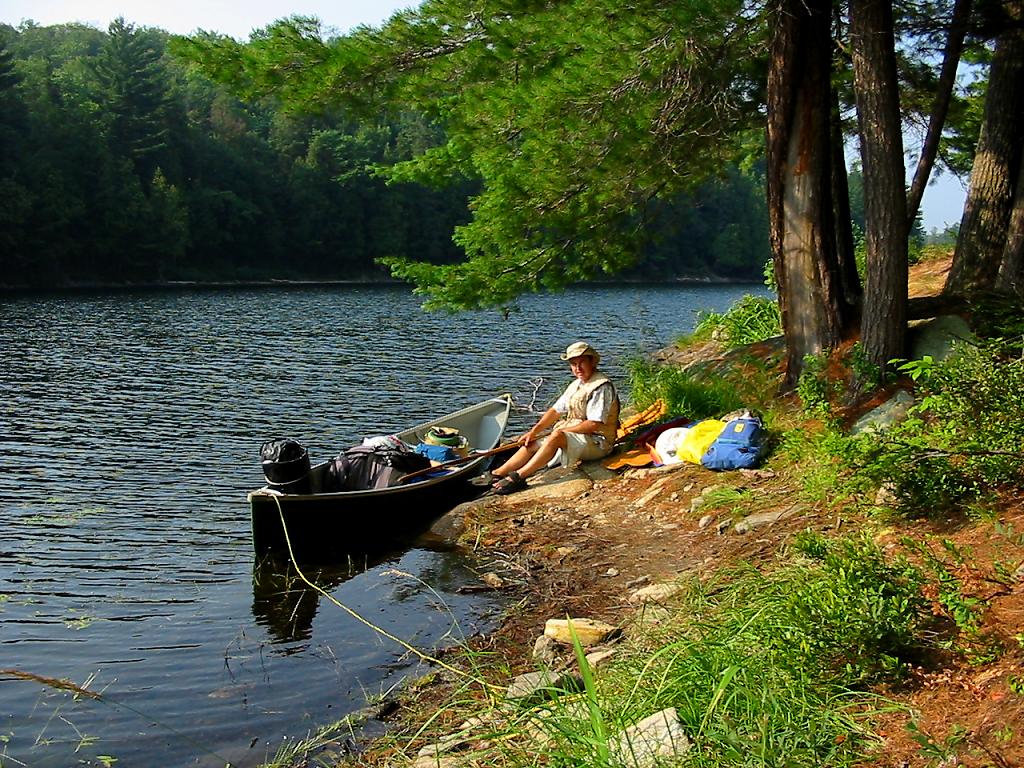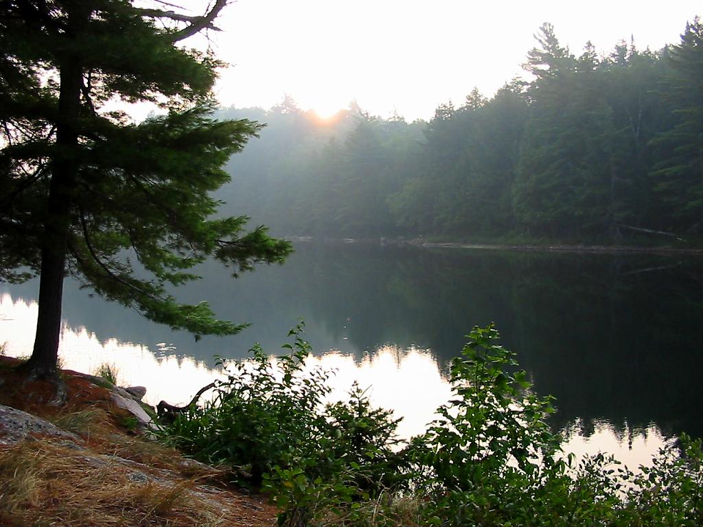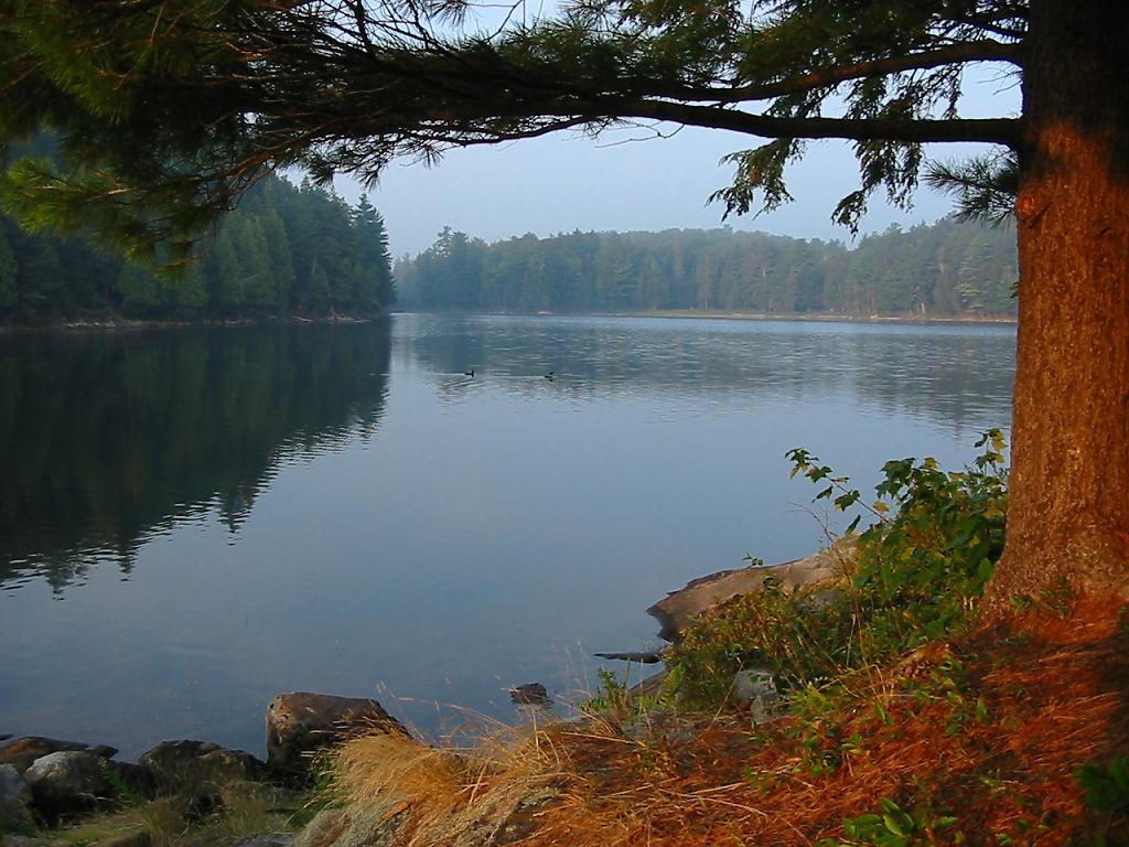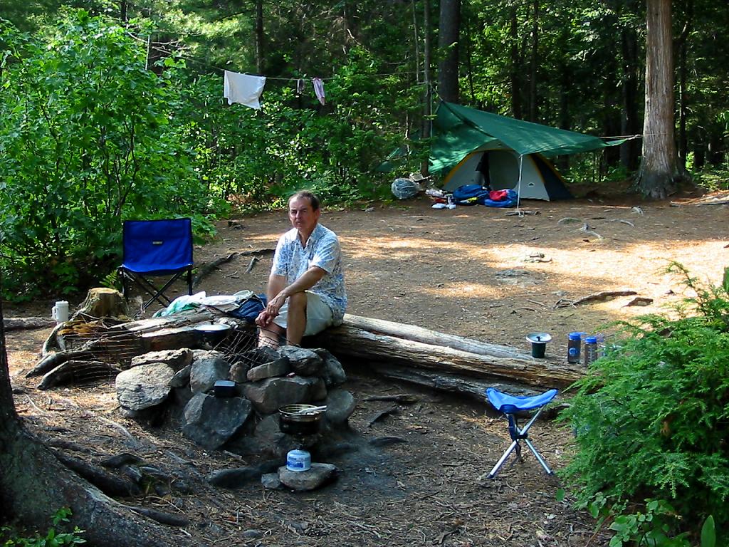 Landing Topography of under-water approach: Central area of sloping muck with small rocks, plus sloping rocks to either side. Impediments to disembarking from and/or unloading a canoe: Choice of stepping into mucky 'beach' or stepping onto gunwale-height rock. Topography to tent sites: Slight and manageable slope up to tentsite. Looking east to the rising sun ... Looking west down the far bay ... Campsite Campsite maintenance: regular Size of open area: 50' x 50' . Extent of tree cover: 35% canopied toward the rear. Seating/firepit area would benefit from tarp if it was rainy. Degree of levelness: Tentsite area is level. Kitchen area has some grade change, but not terrible. Kitchen area and tentsites behind ... Number of level tent sites: Easily three large tents. North exposure: Tent area protected from north winds. East exposure: Somewhat open to easterly winds. South exposure: Good southerly exposure. West exposure: West view is across the lake. Late afternoon sun disappears behind trees. General description: A good sized site, but not particularly attractive. Its located in a small 'confined' bay of a small lake, resulting in a limited view. A decent one-night stop-over. Overall accessibility: Good. ![]() Thanks to Jeffrey McMurtrie of Jeff'sMap for supplying the base-layer map component by Creative Commons licensing. Submitted by Barry Bridgeford .. Visited Summer 2004 .. Submission January 2, 2009 |