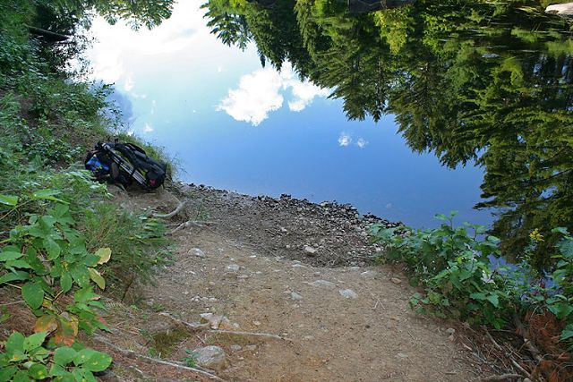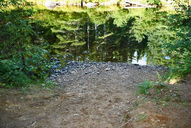 Impediments to disembarking from and/or unloading a canoe: Portage ends in a grassy area with a small step down to a gravel patch where you land/launch at. Far view ...