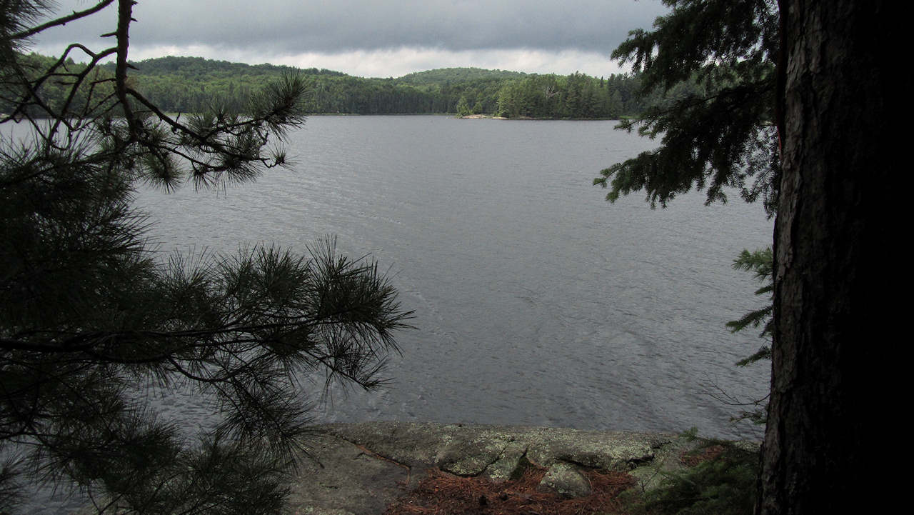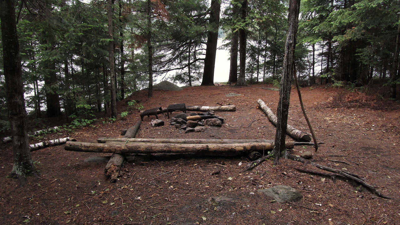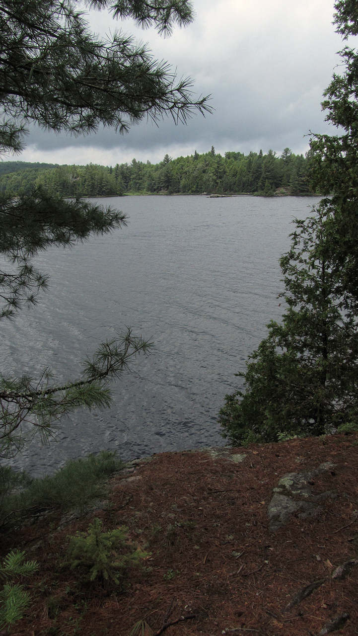 Landing Topography of under-water approach: Small sandy beach approaches from the south, tucked around behind rock face on campsite's west side. Impediments to disembarking from and/or unloading a canoe: Very narrow area open between the trees which come close to the water. Topography to tent sites: Considerable narrow trail climbs amidst the trees to the campsite. One has to approach from the south through the waterweeds to a small clearing amidst the shore's trees ... The narrow confines of the landing would make unloading multiple canoes a bit awkward ... While unloading isn't difficult, stowing more than one canoe onshore could be ... The climb to the campsite is this narrow slippery trail (looking down) amidst the trees ... Campsite Campsite maintenance: regular Size of open area: Small and confined. Extent of tree cover: Substantial overhang and shade all around the campsite. Degree of levelness: Firepit and tentsite areas are level. Number of level tent sites: Tentsite areas for three medium-sized tents. North exposure: Solid trees block the north wind. East exposure: Solid trees block the east wind.. South exposure: Numerous trees block both the south wind and any view. West exposure: A substantial line of trees block the view. A small gap in the trees and rock ledge due west of the firepit provides a view to the west. The first tentsite is between the top of the trail and the firepit ... The second tentsite is immediately north of the firepit and the third is beyond it ... General description: This campsite is surrounded and shaded by trees, to the point of being dismal and 'buggy'. The overgrowth of the trees and the state of the firepit benches indicate that it gets little use and/or maintenance. I suggest that the state of the thunderbox be checked before committing to using this campsite. Overall accessibility: The confined nature of the landing and the long grade of the trail to the campsite are both negative accessibility issues. This campsite could serve as a one-night stopover in a pinch. However, it wouldn't make a good destination campsite. Nor is it good for travelling with young children or "sun-worshippers". This view is to the northwest, from a rock ledge between two pines west of the firepit ... This view is from a small clearing part way up the trail to the campsite, looking west ...