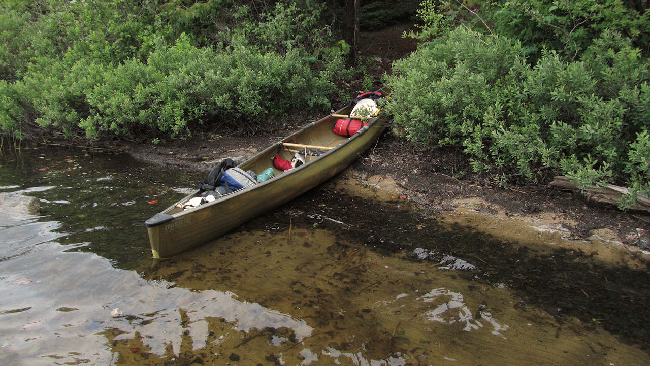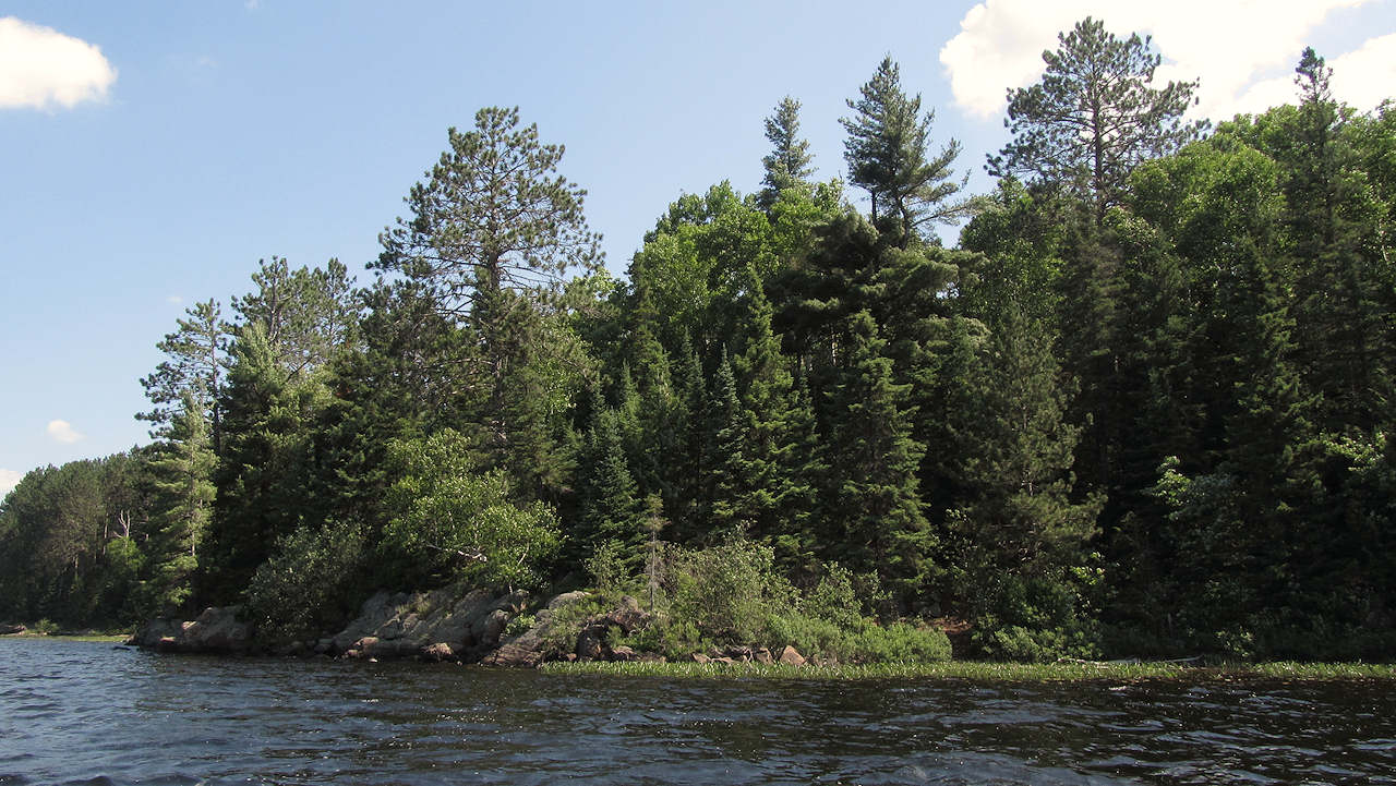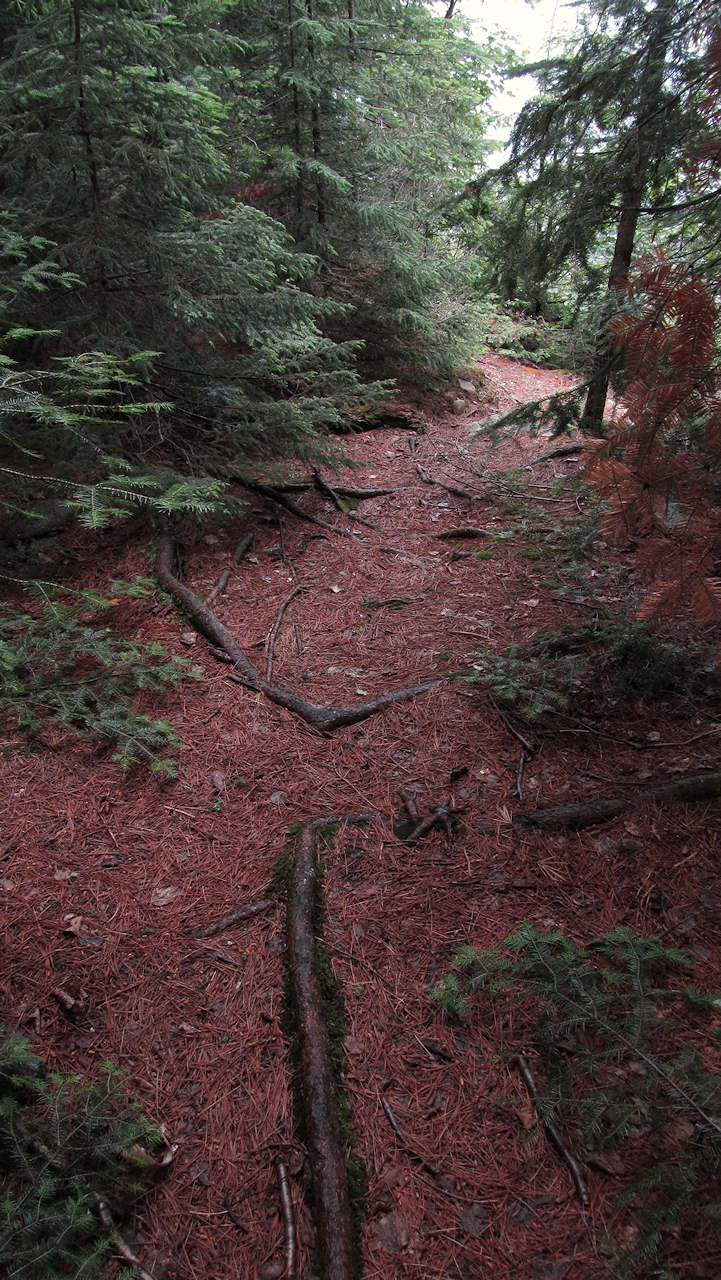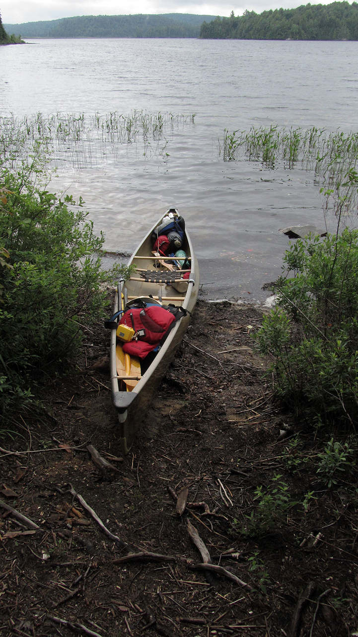 Landing Topography of under-water approach: Small sandy beach approaches from the south, tucked around behind rock face on campsite's west side. Impediments to disembarking from and/or unloading a canoe: Very narrow area open between the trees which come close to the water. Topography to tent sites: Considerable narrow trail climbs amidst the trees to the campsite. One has to approach from the south through the waterweeds to a small clearing amidst the shore's trees ... The narrow confines of the landing would make unloading multiple canoes a bit awkward ... While unloading isn't difficult, stowing more than one canoe onshore could be ... The climb to the campsite is this narrow slippery trail (looking down) amidst the trees ... Campsite Campsite maintenance: regular Size of open area: Small and confined. Extent of tree cover: Substantial overhang and shade all around the campsite. Degree of levelness: Firepit and tentsite areas are level. Number of level tent sites: Tentsite areas for three medium-sized tents. North exposure: Solid trees block the north wind. East exposure: Solid trees block the east wind.. South exposure: Numerous trees block both the south wind and any view. West exposure: A substantial line of trees block the view. A small gap in the trees and rock ledge due west of the firepit provides a view to the west. The first tentsite is between the top of the trail and the firepit ... The second tentsite is immediately north of the firepit and the third is beyond it ... General description: This campsite is surrounded and shaded by trees, to the point of being dismal and 'buggy'. The overgrowth of the trees and the state of the firepit benches indicate that it gets little use and/or maintenance. I suggest that the state of the thunderbox be checked before committing to using this campsite. Overall accessibility: The confined nature of the landing and the long grade of the trail to the campsite are both negative accessibility issues. This campsite could serve as a one-night stopover in a pinch. However, it wouldn't make a good destination campsite. Nor is it good for travelling with young children or "sun-worshippers". This view is to the northwest, from a rock ledge between two pines west of the firepit ... This view is from a small clearing part way up the trail to the campsite, looking west ...