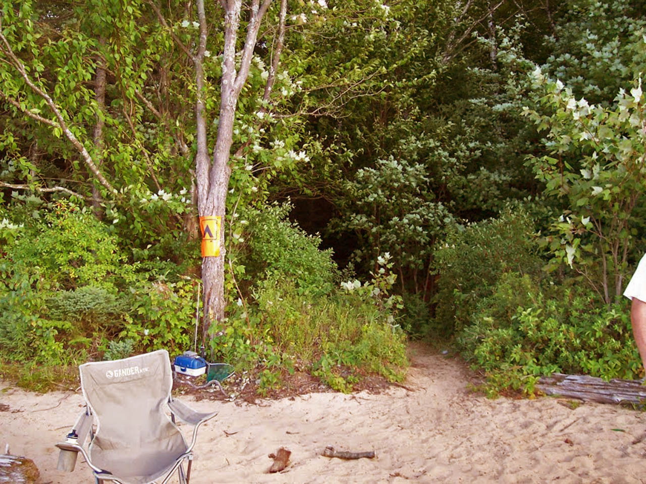 Landing Topography of under-water approach: Sandy beach. Impediments to disembarking from and/or unloading a canoe: None. Topography to tent sites: Basically flat. Landing area, looking west ... Landing area, looking east ... Campsite Campsite maintenance: Regular. Size of open area: small. Extent of tree cover: Partial over fire pit. Full cover over tent sites. Degree of levelness: Very level. Number of level tent sites: 2. North exposure: None from fire pit – full from beach. East exposure: Trees. South exposure: Trees. West exposure: Trees. General description: Basic site (close to access point). Overall accessibility: Very easy. No portages. Good for day tripping. ![]() Thanks to Jeffrey McMurtrie of Jeff'sMap for supplying the base-layer map component by Creative Commons licensing. Submitted by Tom Yates .. Visited August 2007 .. Submission July, 2016 |