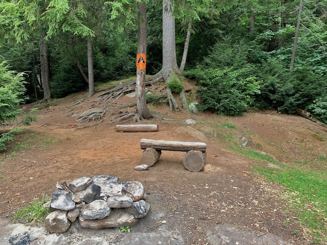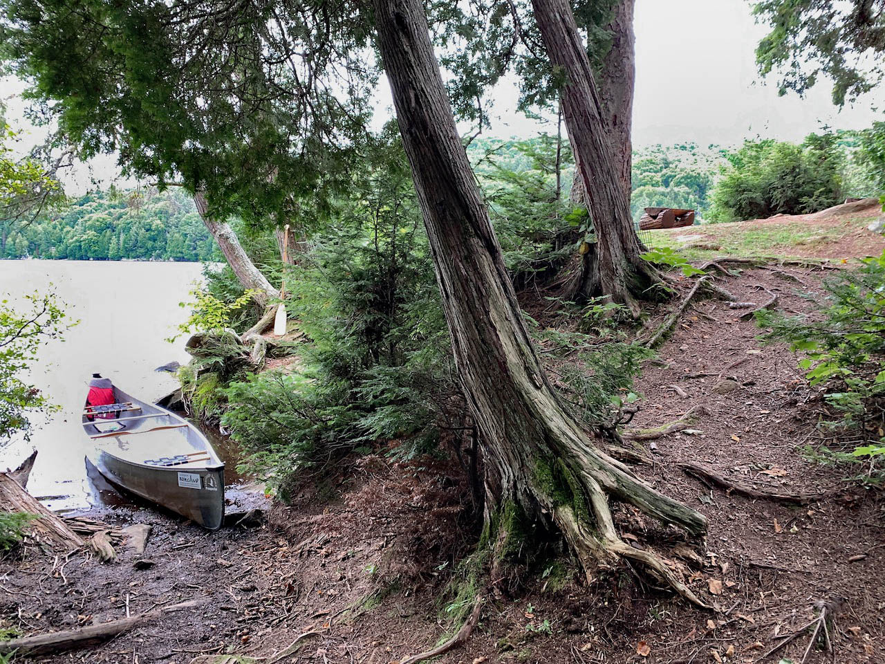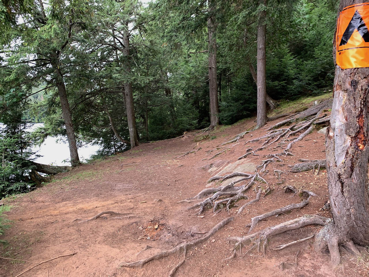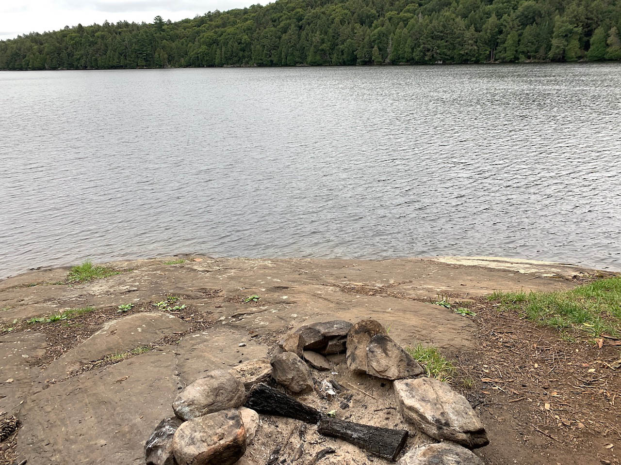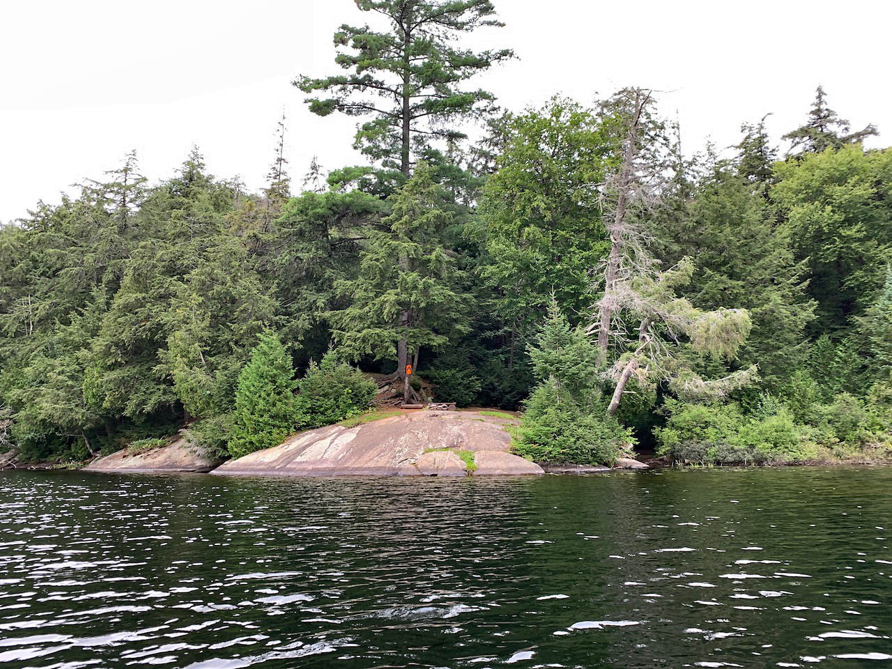 Landing Topography of under-water approach: Shallow slope, with a few paint-scaper rocks. Impediments to disembarking from and/or unloading a canoe: Shallow in-water "beach" is narrow. Side-ways unload is on to a steep grade of solid rocks. Topography to tent sites: Trail with moderate grade curves up behind rock point, to the fire-pit area.