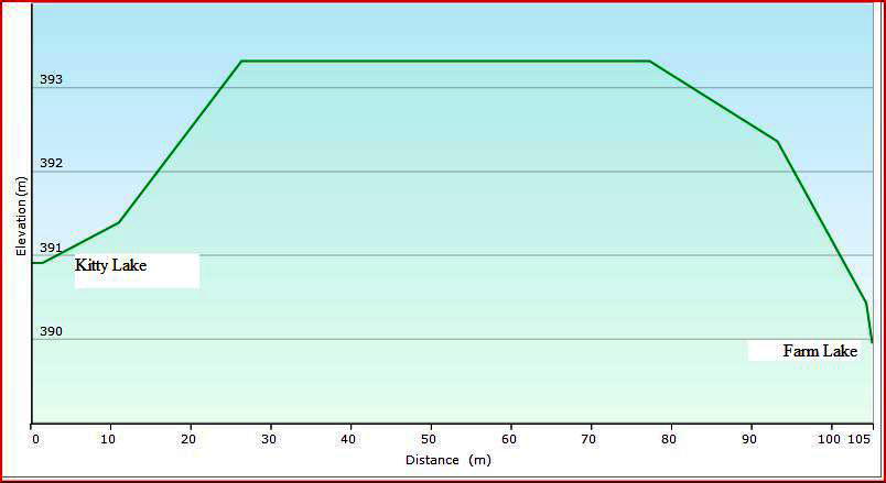 Length of portage: 90 meters. Portage maintenance regular or low: Regular. Elevation above Sea Level @ Farm Lake is 390 meters. Elevation above Sea Level @ Kitty Lake is 391 meters. Difference in elevation: 1 meters. Elevation of highest point: 393 meters. Overall rise/fall: 3 meters. Portage cross-section profile ...