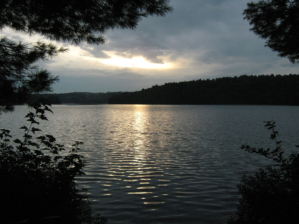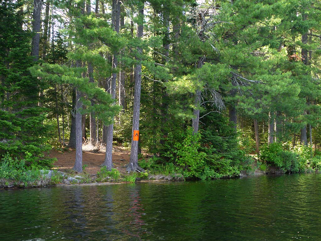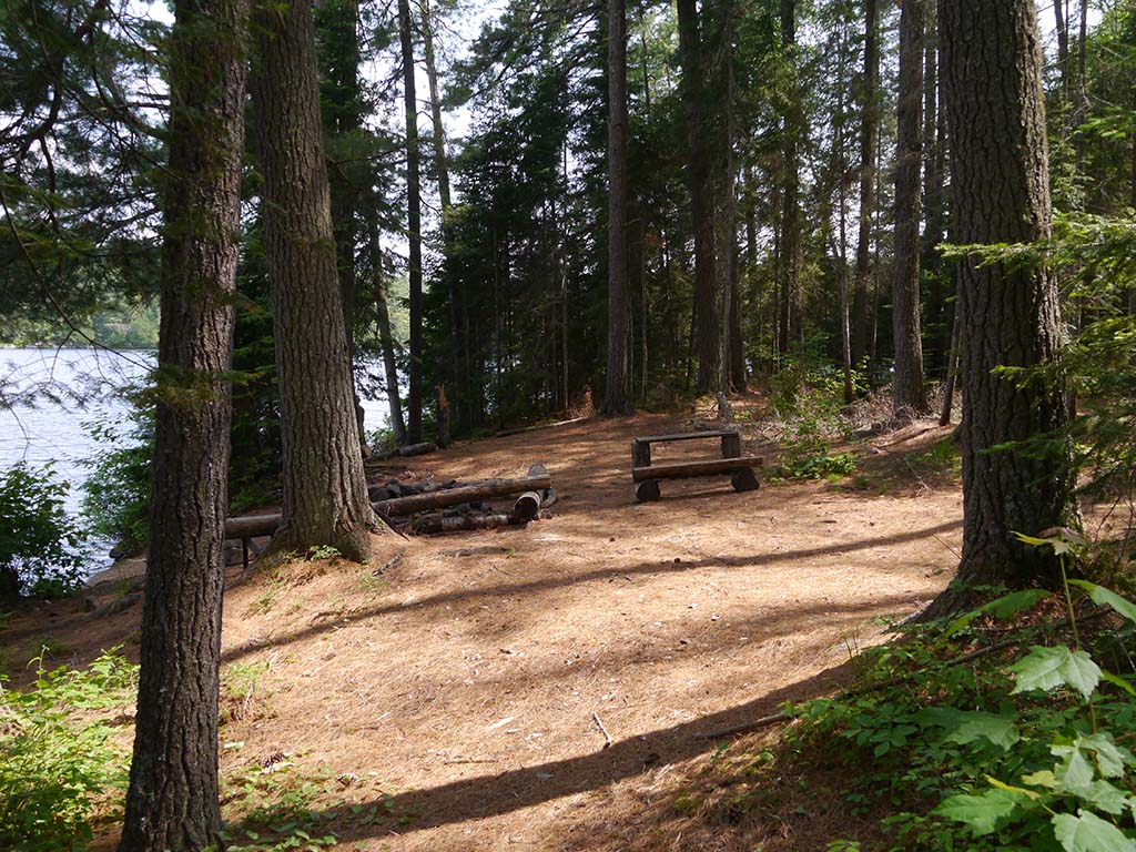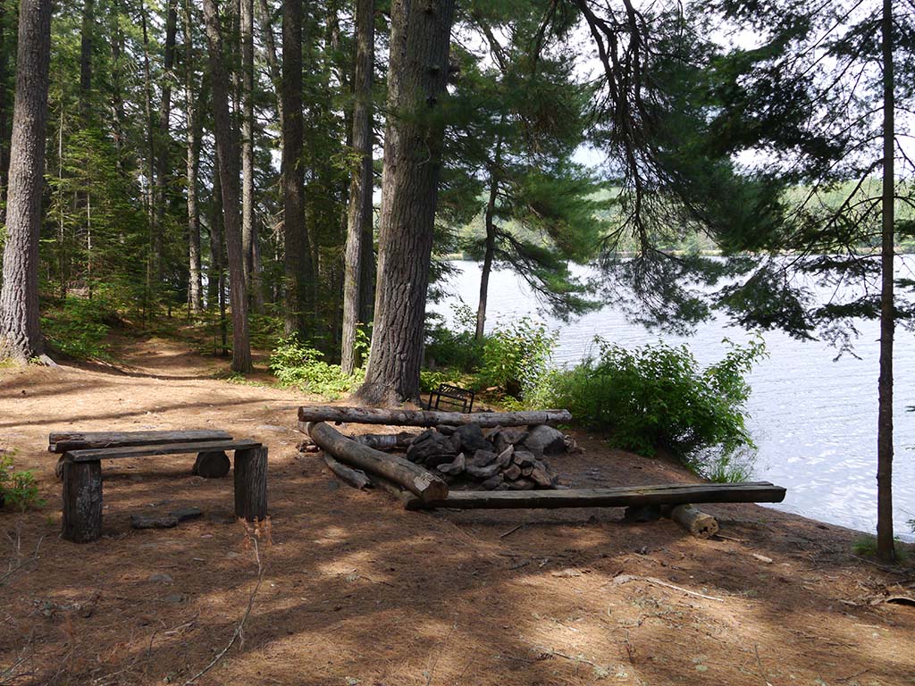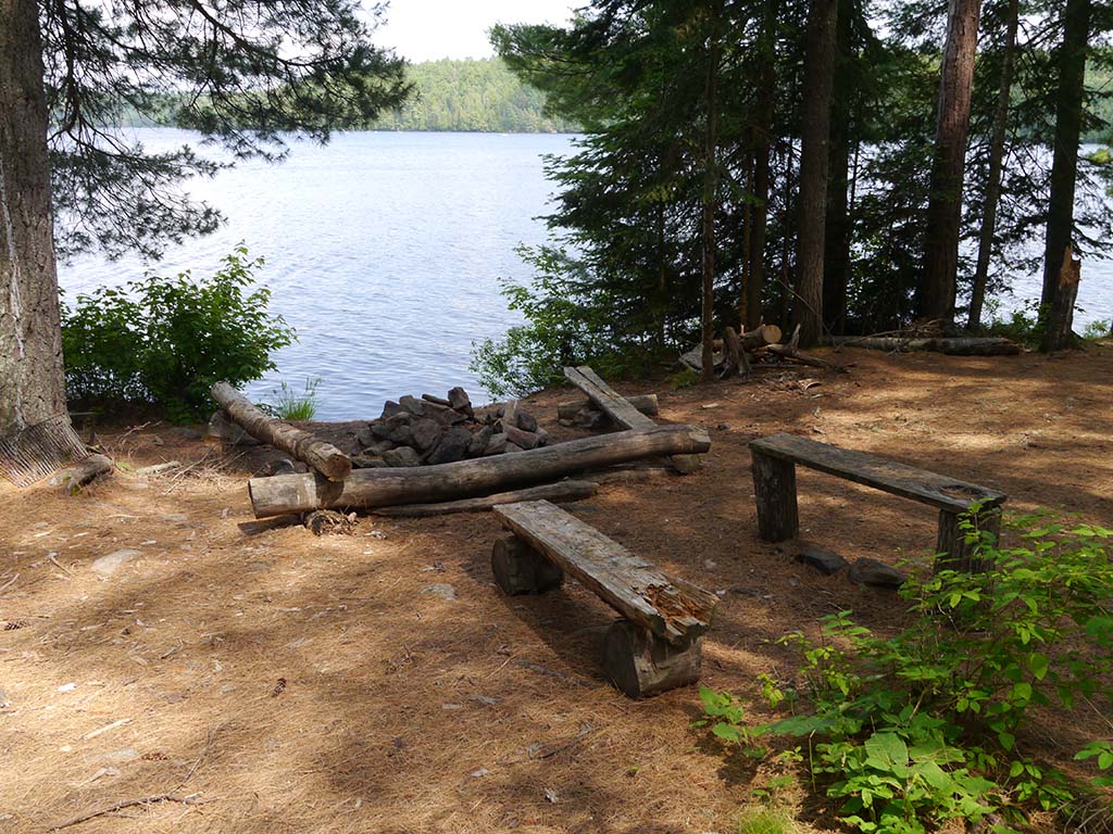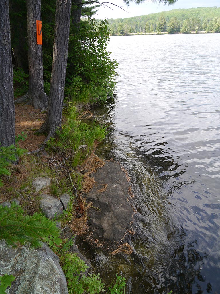 Landing Topography of under-water approach: Unimpeded approach to shoreline. Impediments to disembarking from and/or unloading a canoe: Southmost landing (by the campsite sign) has deep water up to sloped rock, where one should exercise caution stepping out. Further north (in front of the firepit) the landing is less abrupt. In both landing areas, unloading benefits from two people. Topography to tent sites: A rising trail through open forest leads SSE to the campsite. Southmost landing requires care on sloped rock shoreline ... Campsite Regular or low-maintenance: Regular Size of open area: Approx. 6 by 20 meters, parallel to shoreline. Extent of tree cover: Light canopy of pine trees over most of campsite. Degree of levelness: Generally smooth surface with a gentle slope toward the shoreline. Number of level tent sites: 5+ tent sites. Looking south past the firepit .. with tent sites on either side ... Looking north past the firepit ... Looking east .. the firepit benches have a view of the lake ... Sunrise view from the firepit ... North exposure: Pine forest. East exposure: Row of shoreline trees and lake. South exposure: Pine forest. West exposure: Forested upgrade, with thin canopy which allows mid-afternoon sun to hit the campsite. General description: Spacious smooth campsite which offers protection from prevailing northwest winds. However, it lacks a sunny exposure or sunset view. And, its light forest canopy allows most rain to fall through unimpeded. Overall accessibility: Other than care being required at its landings, the actual campsite is quite accessible. ![]() Thanks to Jeffrey McMurtrie of Jeff'sMap for supplying the base-layer map component by Creative Commons licensing. Submitted by Barry Bridgeford .. September 2013 .. Visited June, 2013 |