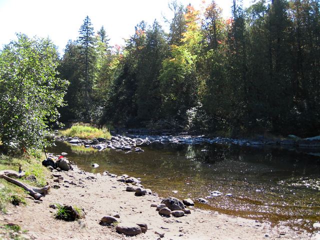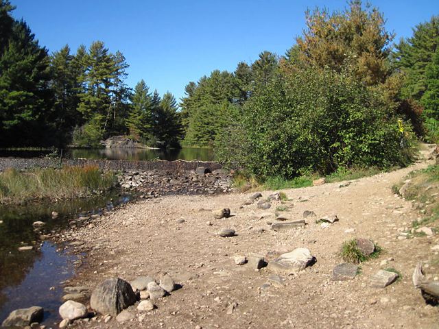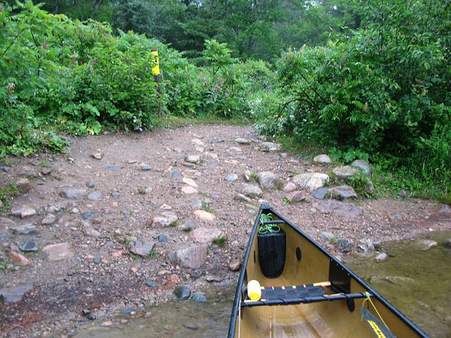 Portage Trail Length: according to CRAPP Map .. 50 meters Portage maintenance: regular Landing at Grand Lake .. Lat. N45 51 18.0 .. Long. W77 45 19.5 Landing at Stratton Lake .. Lat: N45 51 16.7 .. Long W77 45 16.9 Elevation above Sea Level @ Grand Lake: 223.5 m Rise/Fall Overall: A mere 0.5 meters (at most) downriver to Stratton Lake side. Portage Trail general description: Short and straight, with very easy firm ground. Topographical impediments to traveling: None. Areas susceptible to impact by periods of rain or beaver flooding: Early spring typical conditions would be high water on landing areas. But don't expect any flooding along the portage itself. There are no low lying or earthy sections prone to flooding. The current will be stronger on the Stratton Lake side in spring. Landing at: Grand Lake (upstream) Topography of under-water approach: Small sandy beach landing. Available surface area for managing canoes: Room for at least 2 canoes + gear at a time if 1 is pulled up on shore. There is also a 2nd disembarking area closer to the spillway. And one also has the option to carry one's boat over the small dam/spillway. Impediments to disembarking from and/or unloading a canoe: None. Topography of the ascending grade: very little elevation grade. Impediments to moving gear to portage trail: None. There's adequate pack layout area. Canoe landing on Grand Lake side of portage to Stratton Lake (July 09) ... Landing at: Stratton Lake (downstream) Topography of under-water approach: Shallow rocky/sandy/pebbly river-side landing. There can also be some current present, depending on water levels. There's a 2nd landing for 1 canoe also available closer to dam. Available surface area for managing canoes: Depending on water levels, at least 3 canoes can be pulled up along the river's edge. One could also walk the boat up and over the dam/spillway, depending on flow levels Impediments to disembarking from and/or unloading a canoe: Possibility of strength to downriver current, depending on water level. Impediments to moving gear to portage trail: None Landing on Stratton Lake, looking southeast, downstream (Sept. ' 09). ... Landing at Stratton Lake, looking west, upsteam (Sept. '09). ![]() Thanks to Jeffrey McMurtrie of Jeff'sMap for supplying the base-layer map component by Creative Commons licensing. Submitted by Stephen Molson, October 6, 2009 |