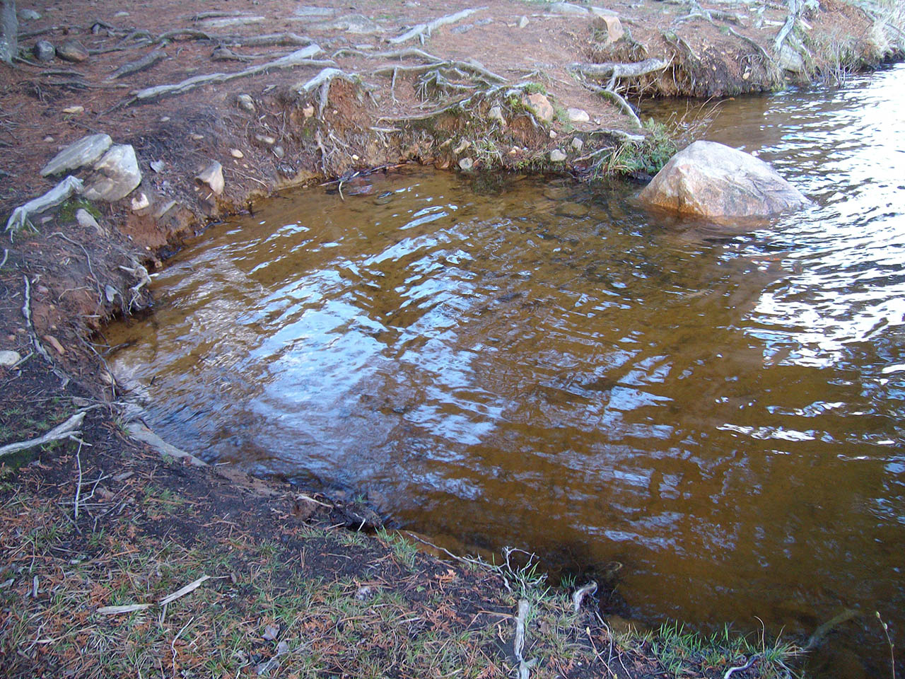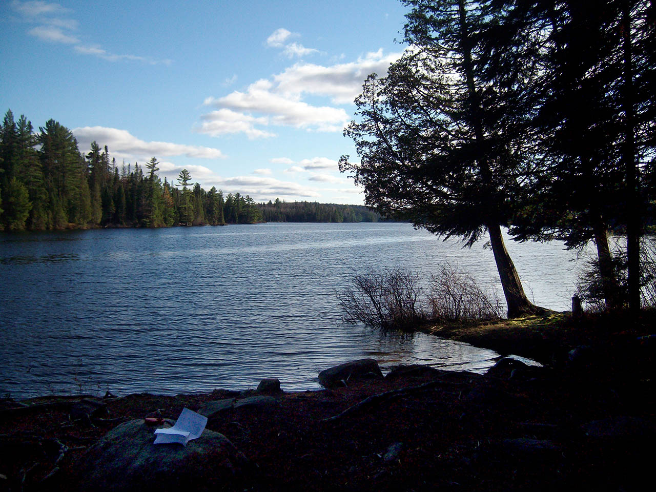 Note: The reservation sysytem distinguishes between "Joe & Western Narrows" and "Little Joe & East Arm" reservation zones. This campsite is #5 in "Little Joe & East Arm", which has a total of 9 campsites, of which 6 reservations are issued at any one time. Landing Topography of under-water approach: Sandy beach underwater, with a large rock to the right. Shallow water 1 feet deep (in May) Impediments to disembarking from and/or unloading a canoe: Roughly a 1-foot step up onto flat surface of the campground grass/dirt area. Topography to tent sites: Once you're on the campsite area, there are small roots and rocks near the landing clearing .. with dirt and grass near the fire pit .. and grass near the water's edge. Campsite's open ground area ... Campsite Campsite maintenance: regular Size of open area: 20 x 45 ft. Extent of tree cover: Trees near the shore and surrounding the site open in the middle. Degree of levelness: Fairly flat, with a few small roots and rocks. Number of level tent sites: 4.