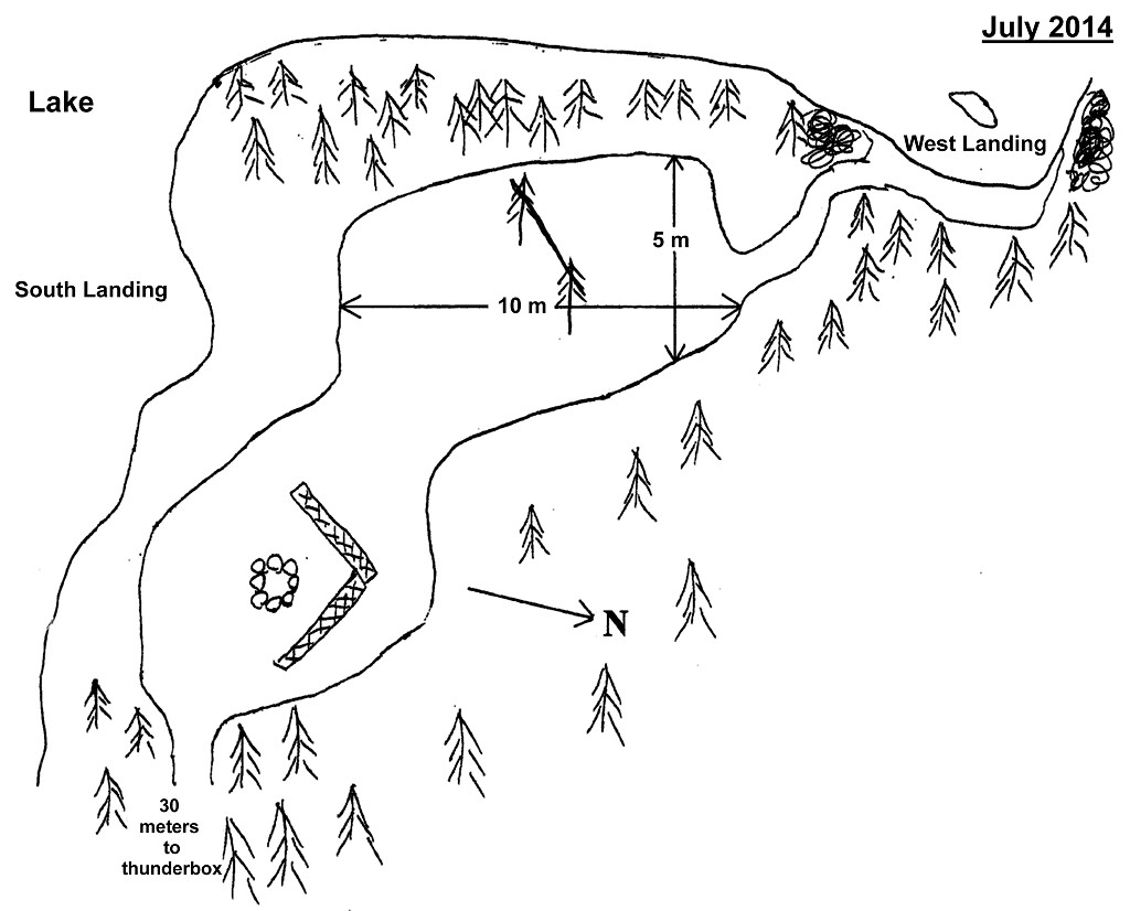 Landing Topography of under-water approach: South landing has gravel with a quick drop-off. West landing is gravel with some rocks and a fairly shallow approach. Impediments to disembarking from and/or unloading a canoe: None at either landing. South landing is good for one canoe at a time and is well protected from the predominant west wind. Topography leading to tent sites: Less than a 1 meter rise to site. There is a short rocky section leading in from the west landing. Landing at south shore near firepit ... Landing on western side of site ... Path leading to western landing ... Campsite Regular or low-maintenance: Regular. Size of open ground area: see sketch. Extent of tree cover: 40%. Degree of levelness: very level. Number of tent sites: Numerous. North exposure: Trees. East exposure: Trees. South exposure: Open view of lake and island to south. West exposure: Open only at western landing. There's a path that leads to a new thunderbox ... Looking toward the west landing ... Looking at the south landing from path to west landing ... General description: This site was visited in mid-July and there wasn't any sign that this site had been used during the year. This site is open to the sky as most of the trees are on the perimeter. It is well protected from all wind except a wind from the south. A very level site, with numerous tent placement options, though it was hard to tell due to the long grasses growing. There are also potential tent pads just to the north of the firepit, as this area is sparsely treed and fairly level. Overall accessibility: Very accessible. Landing on the south shore is only a couple of meters from the site. Landing on the west shore is a bit further, but very level walk.