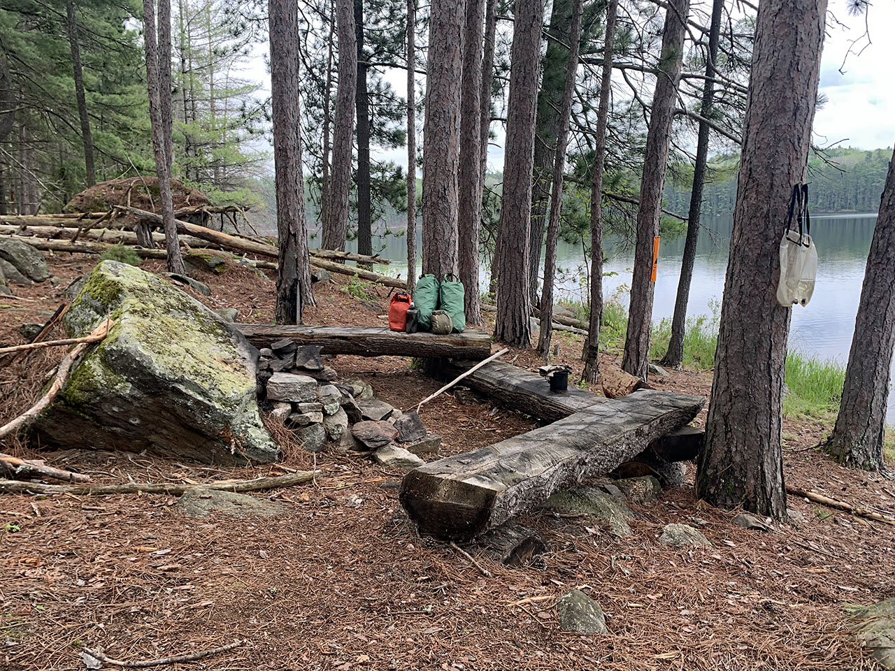 Landing Topography of under-water approach: Under water is soft swampy mud. Impediments to disembarking from and/or unloading a canoe: There is room for a few canoes/kayaks.. Topography leading to tent sites: Landing is a large grassy shore. View from the campsite and canoe landing ... Campsite Regular or low-maintenance: Regular.. Size of open ground area: Smaller campsite that is sloped, very rocky with deadfall found all over the campsite. Extent of tree cover: Most of tree cover is made up of small pine trees. Campsite would not be protected from southerly winds. Degree of levelness: Entire campsite is sloped and littered with downed trees. Topography to tent sites: Could not find any actual tent site. Could not find any place to setup a tent. It was difficult to find two trees to hang a hammock. Many of the trees were to small or to close together to hang a hammock. Number of level tent sites: 0. Small firepit and seating area, with no problem finding firewood ... Looking east toward the firepit ... Overall accessibility: Had to climb over deadfall to get to the thunderbox which is behind the campsite in thick bush.
