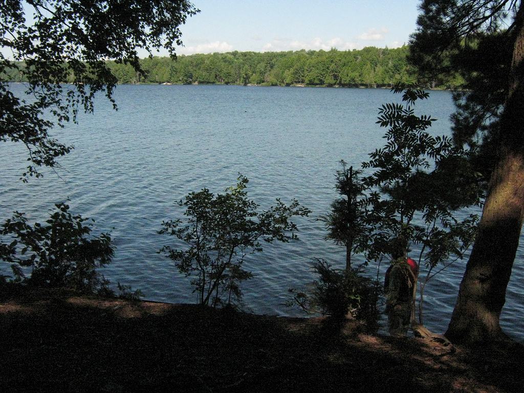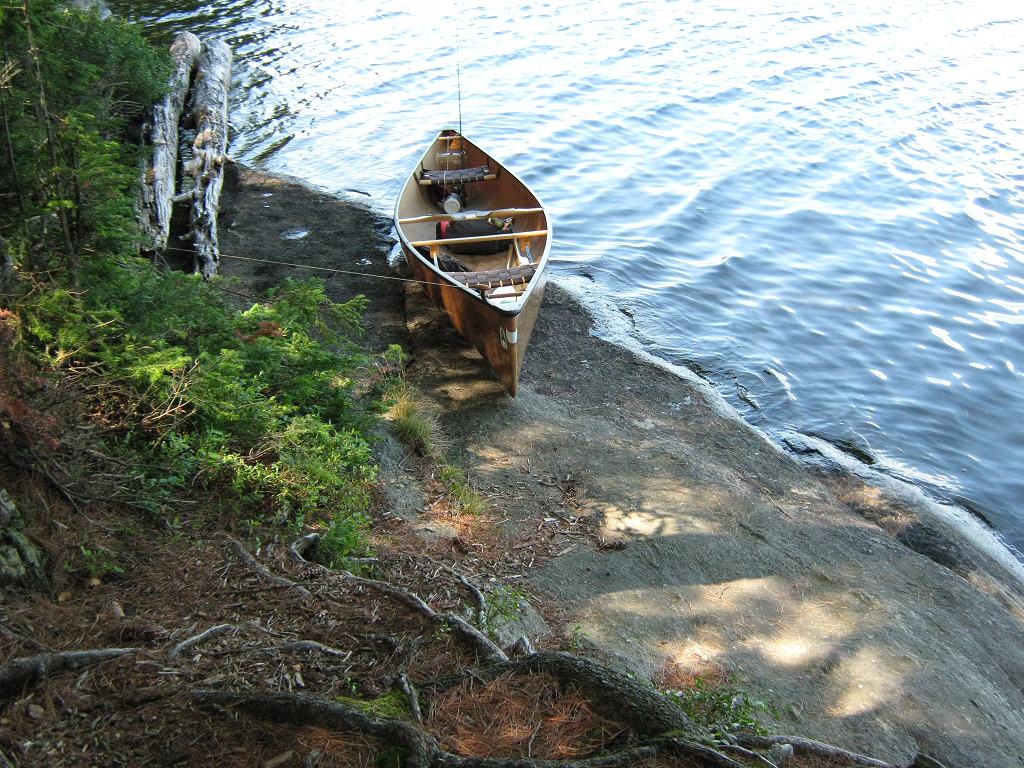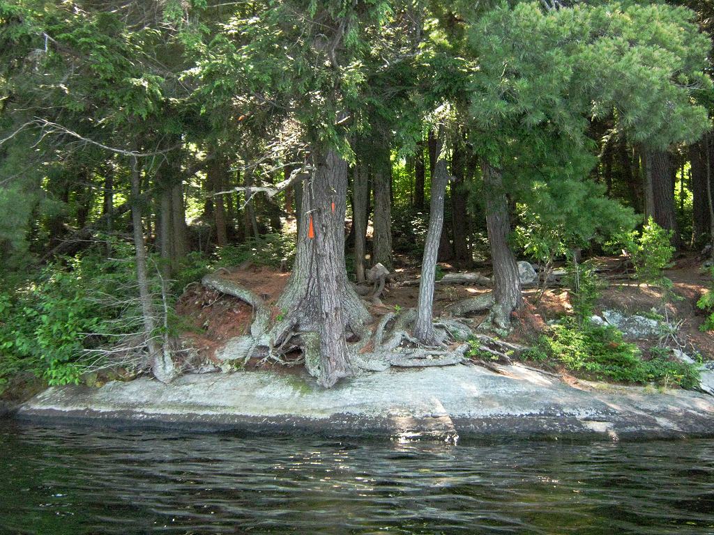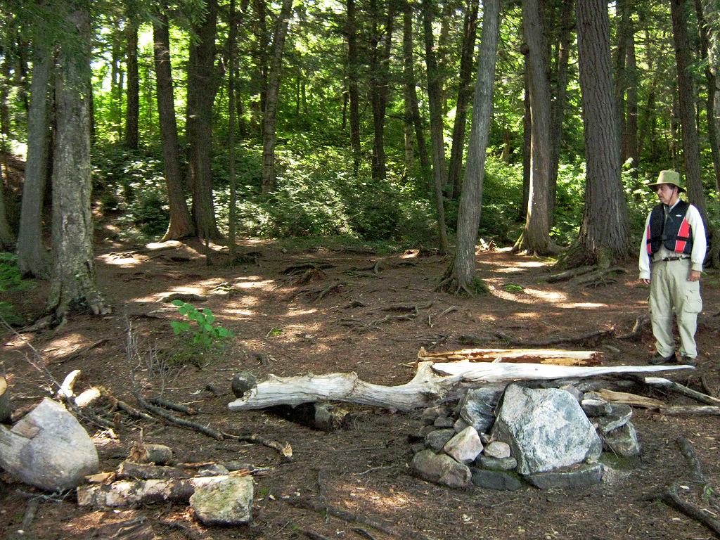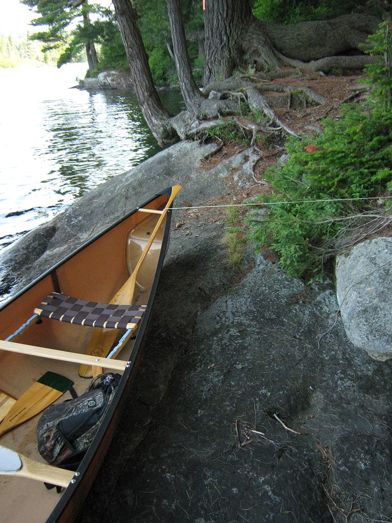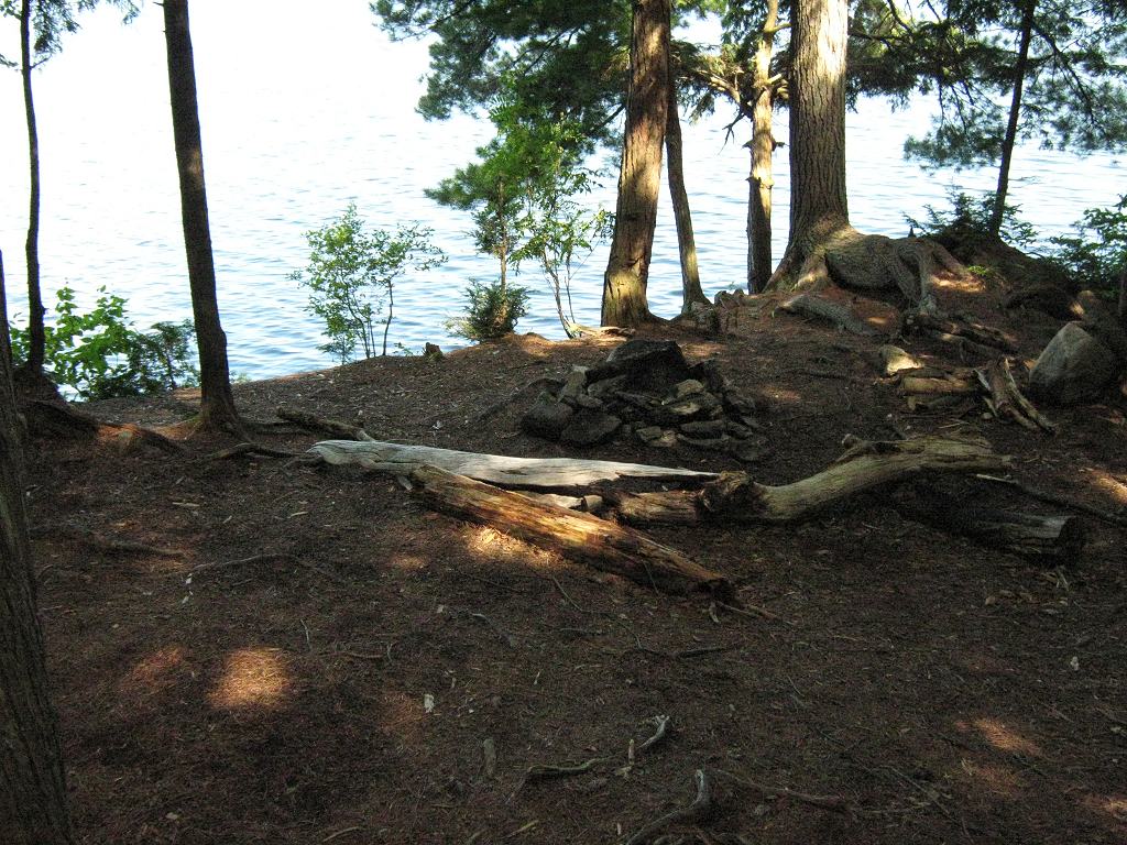 Landing Canoe hauled up on the shoreline slab of rock ... Looking up shoreline slab of rock, toward rise to tentsites ... Topography of under-water approach: Slab of rock rises up from depths. Impediments to disembarking from and/or unloading a canoe: Slab of rock provides place to step out onto. However, it could be slippery whwn wet. Tight confines would require first canoe to be repositioned prior to landing second one. First canoe would have to be hauled further up the slope to allow second one to land and unload. Topography to tent sites: Approximately 10 foot rise at 45 degrees to get to tent sites. There's a fair rise to get to the thunderbox. Campsite from water .. rock slab's lower landing is further to the right ... Campsite Regular or low-maintenance: Regular Size of open ground area: 30 x 40 feet. Firepit and tentsite area, limited flat areas .. for 3 small tents ... Extent of tree cover: 80% Degree of levelness: Besides the firepit is level, but there are only small level areas for 3 small tents. Number of level tent sites: 3 small. Looking outward from tentsites to firepit ... North exposure: Open to north wind .. with a view across east bay to north shore. East exposure: Forested shoreline South exposure: Forest. West exposure: Forested shoreline. View looking NNW from firepit area ... General description: Confined under tree cover, yet quite open to north wind. Overall accessibility: Only fair accessibility from the water .. limited to one canoe at a time. ![]() Thanks to Jeffrey McMurtrie of Jeff'sMap for supplying the base-layer map component by Creative Commons licensing. Submitted by Barry Bridgeford .. December 30, 2011 .. visited July, 2010 |