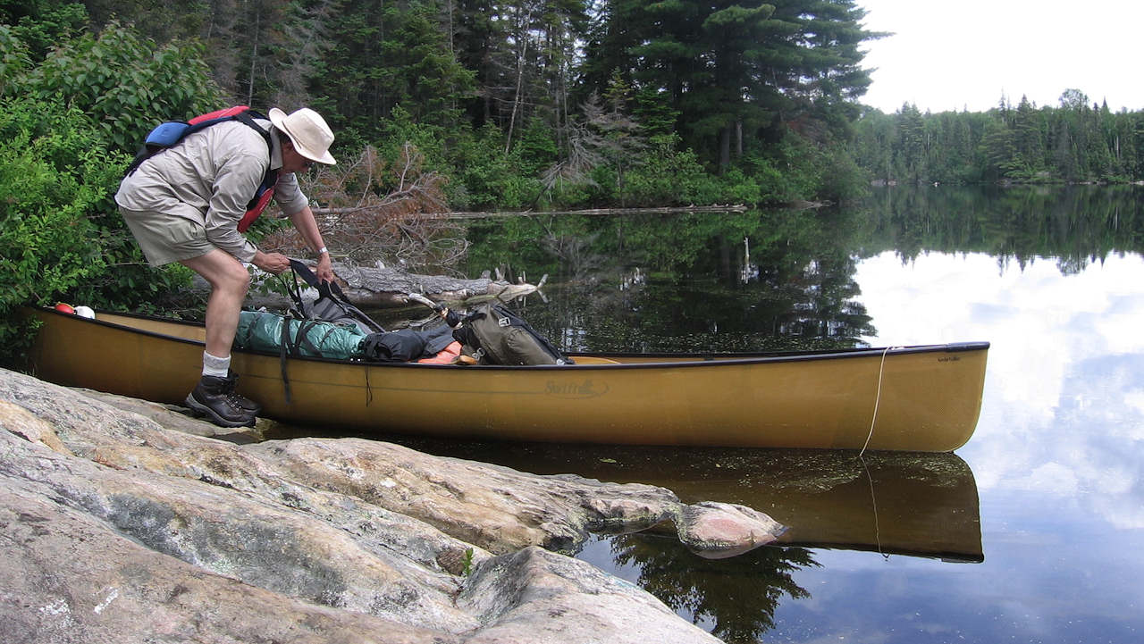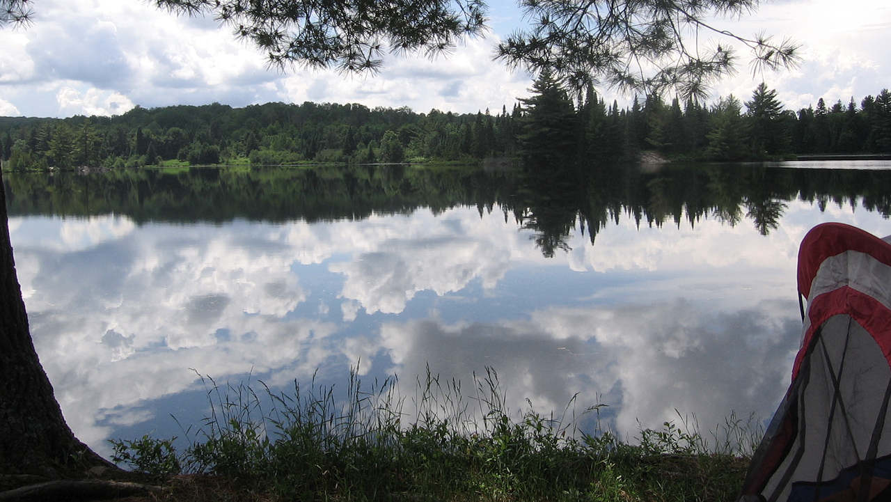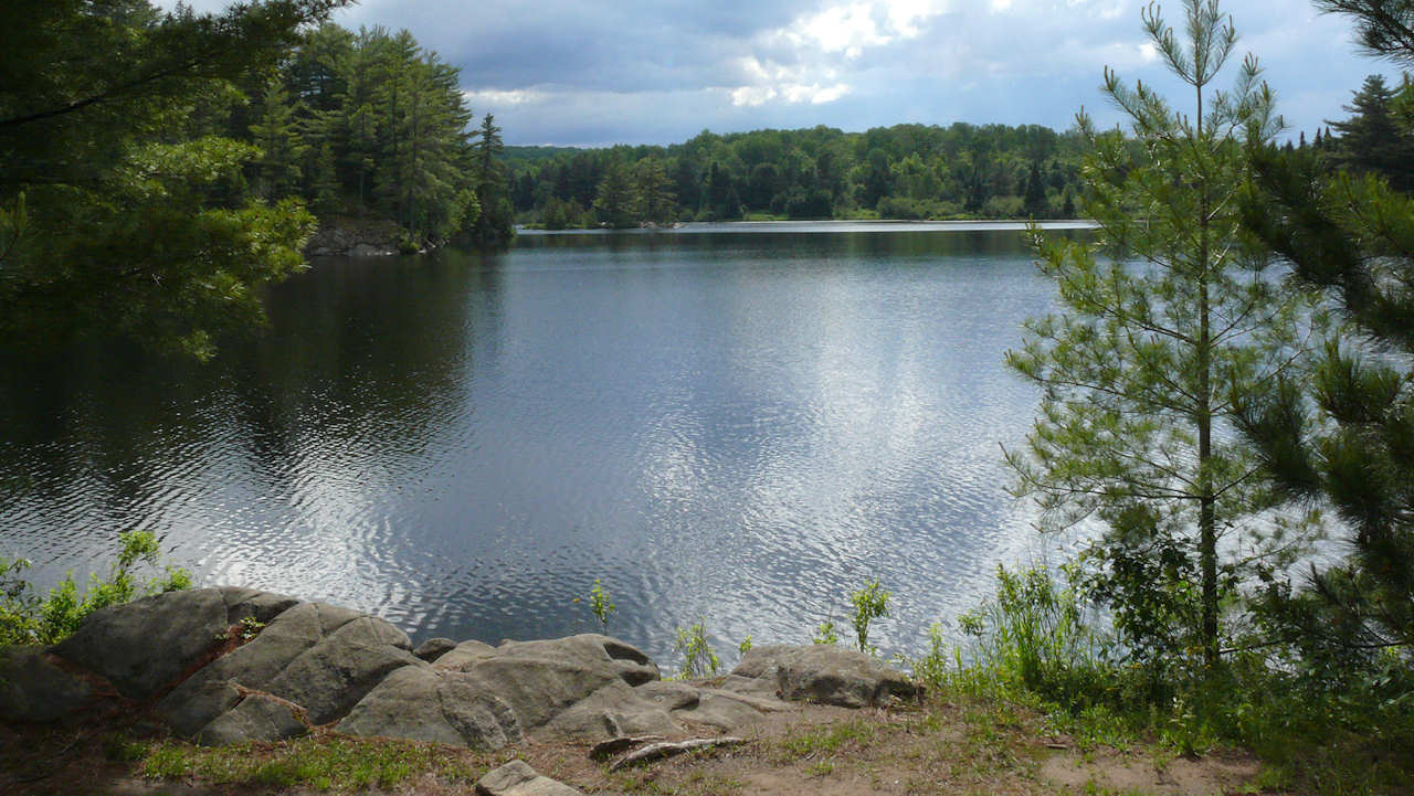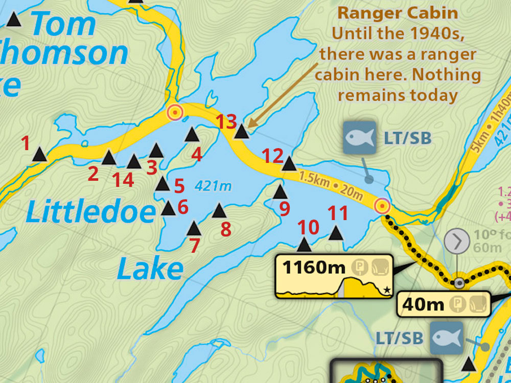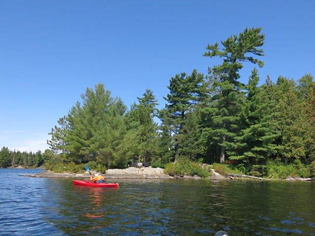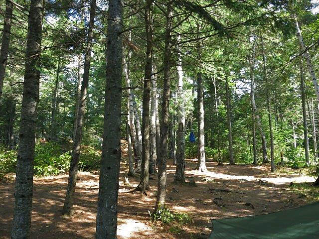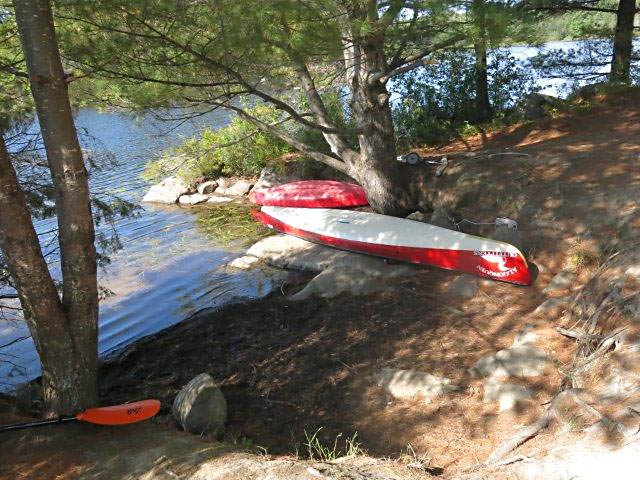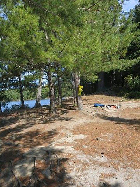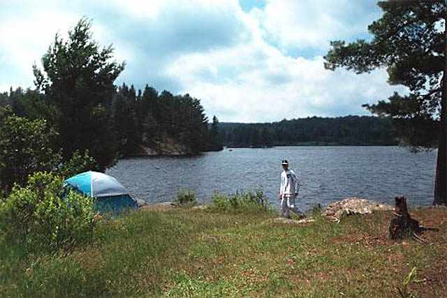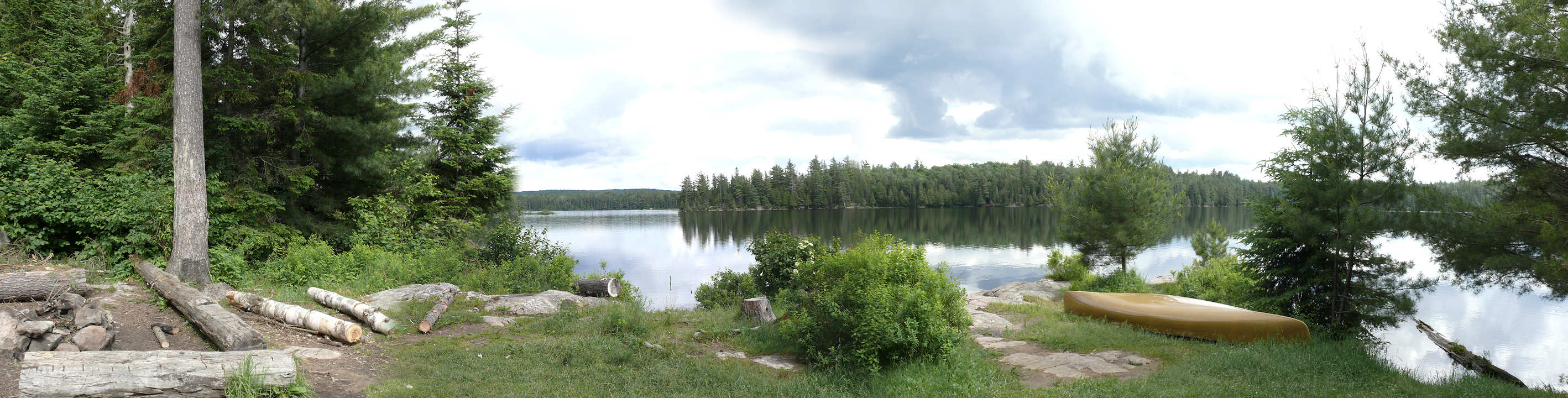 Landing Topography of under-water approach: At the east side of the campsite's point, an area of smooth granite provides an opportunity to step out of a canoe one at a time. Impediments to disembarking from and/or unloading a canoe: Once the canoe is held tight to the rock landing, gear can be unloaded on to the same rock area relatively easily. Topography to tent sites: The majority of the campsite is level with its landing area. A large bit of bedrock on the east side of the point provides a good landing and unloading area ... Looking across the east half of the campsite, with firepit to the left and landing area to the right ... Campsite Campsite maintenance: regular Size of open area: Large open area is exposed to the weather. Extent of tree cover: Forest edge to the north provides a couple of small semi-sheltered areas. Degree of levelness: Mostly quite level. Somewhat irregular into the rear wooded area. Number of level tent sites: Easily nine freestanding solo tent sites, or less larger ones. North exposure: Totally blocked from the north wind by the forest. East exposure: Quite open to the east wind. South exposure: Quite open to the south wind. West exposure: Quite open to the west wind and sunset view. A large grass area provides sites for freestanding tents ... The southwest view .. toward the channel from Fawn Lake ... The west view .. toward an island and the channel to Tom Thomson Lake ... General description: This campsite is a grassy point, exposed to the sun and wind on three sides. In good weather, its a wonderful site. However, in windy and/or wet conditions it offers little protection or opportunities to string up tarps. Overall accessibility: As long as one is sure-footed when coming ashore to the rock landing, the site is quite accessible. This campsite could serve as an OK one-night stopover as long as bad weather wasn't expected. However, its lack of protection from the elements is a serious drawback. Note: In February of 2020, Wanda Spruyt submitted a PCI report of this campsite, clearly showing some changed conditions between June of 2008 and September of 2019. The trees along the shore have undergone some serious growth. In so doing, they cast more shade upon the point's shoreline and open area. The open area was lush with green springtime grass in the earlier visit. After 11 years of continued use, more shade and summertime dryness .. the open area definitely appears "less green". Over those same 11 years, the inland trees have developed a denser canopy, which along with continued use has shaded the forest floor and helped in reducing ground-level growth. Following are Wanda's photos of conditions existing in September of 2019, plus a photo from a 1994 canoe trip when much of the point was covered in small pines and deciduous bushes. Collectively. this report's photos illustrate the pronounced changes in vegetation possible over a quarter century! 2019 view of the campsite from off-shore. All the trees are now much fuller! ... 2019 - Shoreline pines have grown and lost their ground-level branches, revealing a sandy beach landing ... 2019 - More shade from the shoreline pines has reduced a once grassy area ... 2019 - Inland trees have developed a denser canopy and a more open under-story ... 1994 - The SW view a quarter century ago, much of the point was covered in small pines, bushes and grass ...