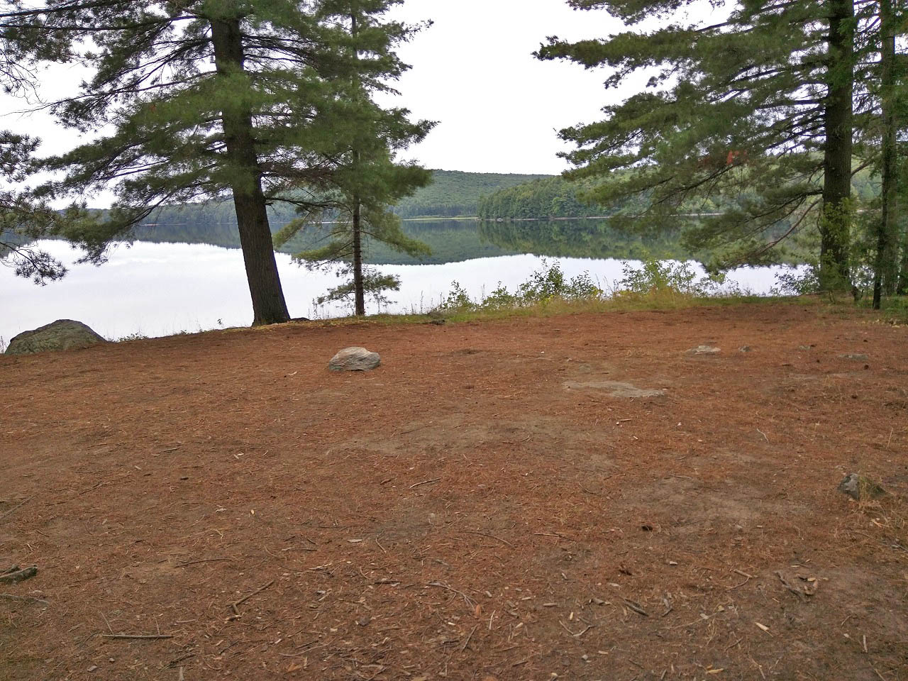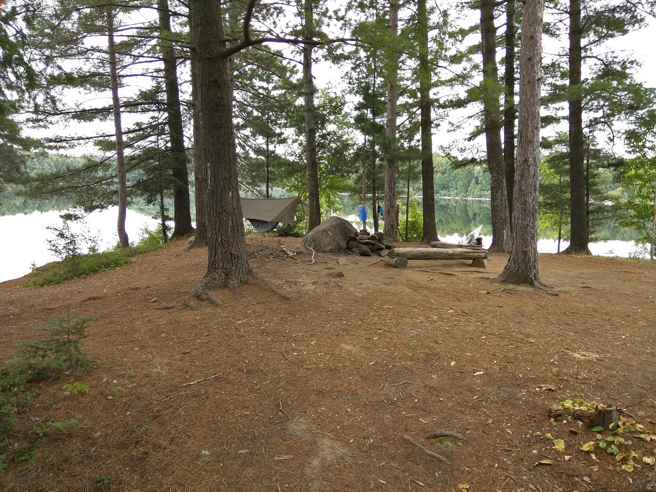 Landing Topography of under-water approach: No problems. Impediments to disembarking from and/or unloading a canoe: Small beach at NW corner of island. Topography leading to tent sites: Fairly flat trail Campsite Regular or low-maintenance: Regular. Size of open ground area: 15 m x 15 m. Extent of tree cover: Limited. Degree of levelness: Very flat Number of tent sites: Numerous. Open exposure all directions except NW General description: Very small island, very flat. The island has a small tail to it with a sheltered thunder box. Heron nest on the island. Good fire pit with large rock. Overall accessibility: Good.