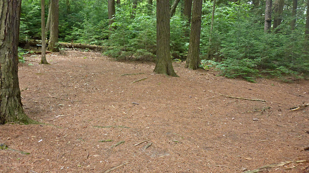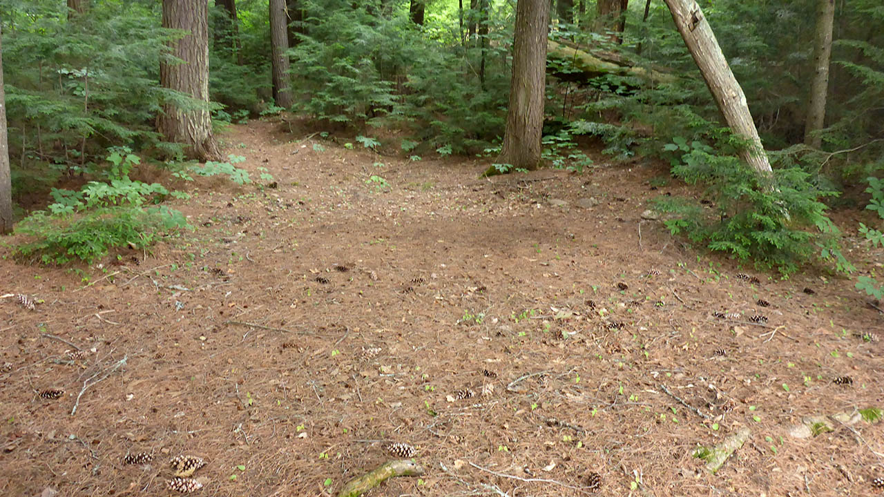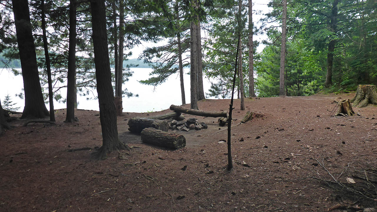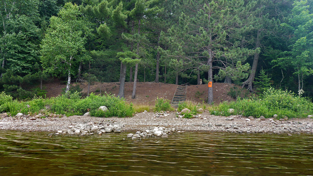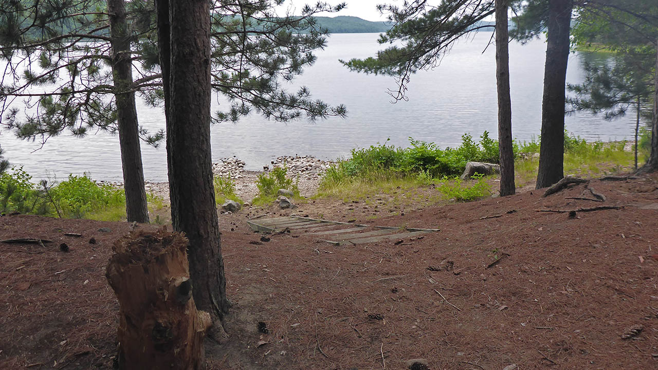 Landing Topography of under-water approach: Gravel close to shore, sand just further out. Impediments to disembarking from and/or unloading a canoe: None. Topography leading to tent sites: Approximately a 3 meter climb using stairs. View of the campsite from the lake ... Landing as seen from the front of the site ... Campsite Regular or low-maintenance: Regular Size of open ground area: 10 x 8 meters. Extent of tree cover: 20% heavily treed perimeter from southeast to west, quite open above site proper. Degree of levelness: Level. Number of tent sites: 3+. North exposure: Trees. East exposure: Trees. South exposure: View of lake. West exposure: Partial view of lake. General description: The front of the site offers a nice view of the lake. It is level and able to accommodate 3 tents, and a further 15 meters to the east, there's another area where a tent could be pitched that would offer some privacy. A 5 meter band of gravel extends from the treeline out into the lake where it changes to a sandy bottom. Overall accessibility: No accessibility issues. Looking west across the site to a tentpad ... Tentpad on the eastern side of the point ... ![]() Thanks to Jeffrey McMurtrie of Jeff'sMap for the base-layer map component by Creative Commons licensing. Submitted by: Chris Taylor .. Visited July, 2018 .. Submission December 1, 2018 |