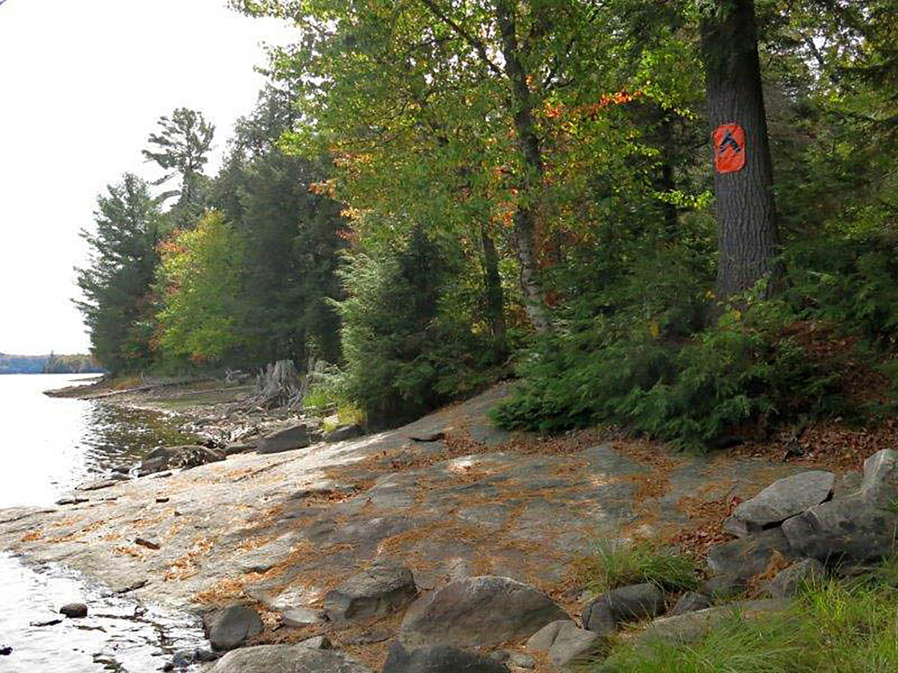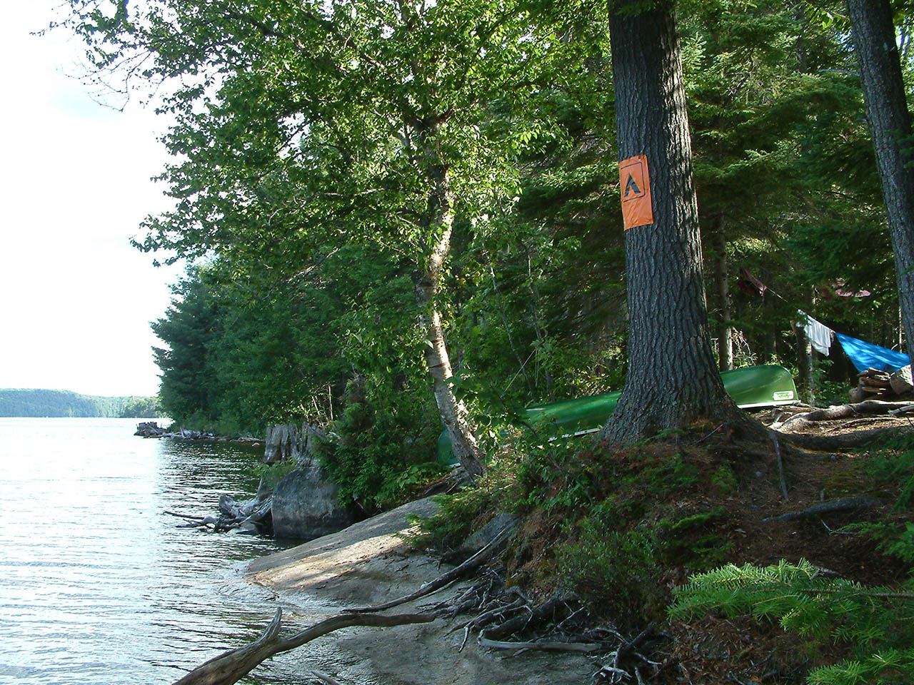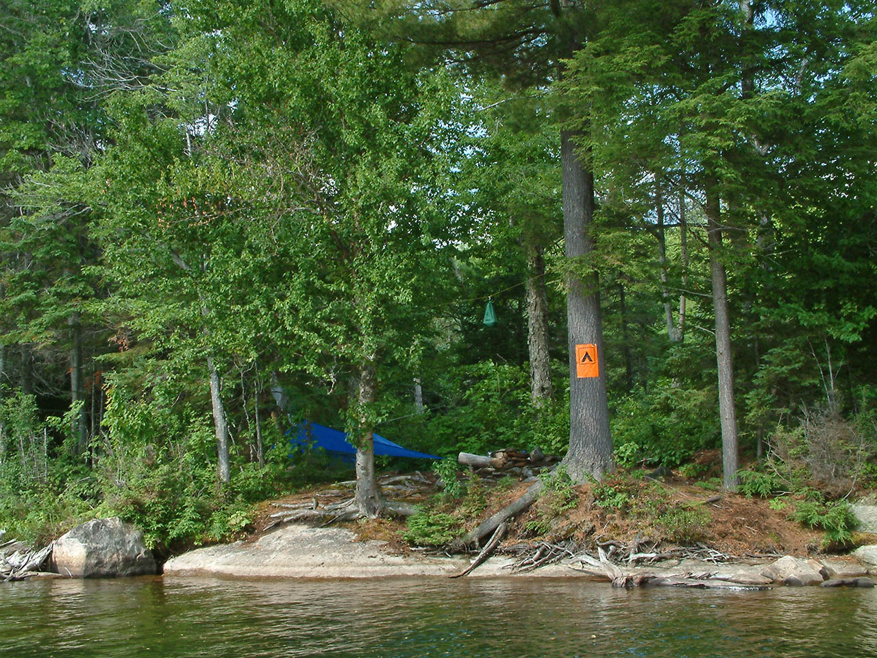 This PCI record is comprised of photos taken by Barry Bridgeford in 2005 (during July high water) and by Wanda Spruyt in 2019 (during late September low water). While the earlier photos are potentially outdated, they do illustrate the impact of the passage of 14 years and the effect of lowered water levels. McCraney Lake has a run-off control dam at its outflow, which is capable of lowering levels in preparation of storing spring run-off water volumes. Landing Topography of under-water approach: South part of waterfront is a large sloped rock. North part of waterfront is comprised of numerous irregular rocks. Impediments to disembarking from and/or unloading a canoe: Steep slope requires special care. Topography to tent sites: Once the rock slope has been climbed, the campsite is generally flat except for pronounced tree roots criss-crossing a large part of it. Campsite seen from the water in 2005 (photo by Barry) ... Sloped rock landing during high water in 2005 (photo by Barry) ... Same sloped rock landing during low water in 2019 (photo by Wanda) ... Campsite Campsite maintenance: Regular. Size of open area: Approx. 40ft x 40ft. Degree of levelness: Bumpy network of tree roots over 1/3 south and west of the firepit. Otherwise level. Number of level tent sites: 2. North exposure: Trees. East exposure: Lake. South exposure: Shoreline and trees. West exposure: Small trees and a buggy bay to the northwest. General description: A small campsite without the benefit of a point, afternoon sun or sunset view. Overall accessibility: Not ideal. One of the tentsites is at the rear, 2005 (photo by Barry) ... Over fourteen years, the soil has compacted and the roots are 'worse' (photo by Wanda) ... There's room for a second tentsite closer to the firepit (photo by Wanda) ... This is the view of the lake from behind the firepit, 2005 (photo by Barry) ... Looking across the firepit to the northeast, 2019 (photo by Wanda) ... Down on the low-water beach, looking north, 2019 (photo by Wanda) ... ![]() Thanks to Jeffrey McMurtrie of Jeff'sMap for supplying the base-layer map component by Creative Commons licensing. Joint report courtesy of Wanda Spruyt and Barry Bridgeford .. Visited 2005 and 2019 .. Submission Dec. 4th, 2019 |