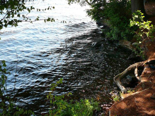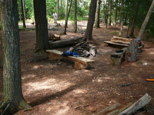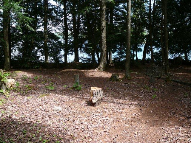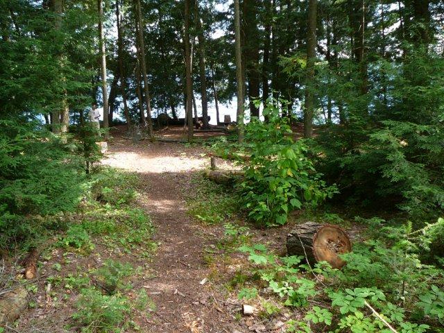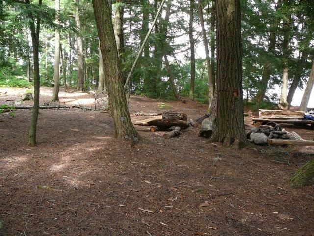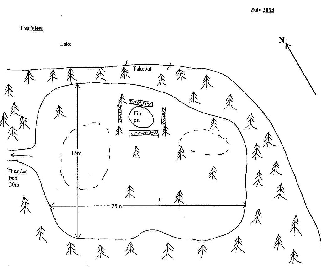 Landing Topography of under-water approach: Rock and gravel. Impediments to disembarking from and/or unloading a canoe: Could only find one spot (high winds) that was sheltered enough to allow for an easy disembark. There were some rocks and exposed roots at the water's edge that could be used to stand on. And the under-water bed was level enough on this rocky approach. It was much easier to stand in slightly more than ankle deep water to unload the canoe. The lift and climb on to the site was slightly more than 1 meter. Topography to tent sites: On site as soon as you make a 1 meter climb. Risky takeout if you don't want to stand in water ... Campsite Regular or low-maintenance: Regular Size of open area: 25 meters x 15 meters. Extent of tree cover: Extensive. Degree of levelness: Good. Number of level tent sites: 4+. North exposure: Trees, slight view of lake. East exposure: Trees, slight view of lake South exposure: Trees. West exposure: Trees. General description: Big site, ground is level but "lumpy". Lots of trees and fallen trees on site to limit useable area. Well protected from the wind. Not a lot of sun. Overall accessibility: Could be a challenge at the takeout if you don't want to stand in the water. There are other places that could be used, but each presents its own challenge. Firepit looking west ... Looking north from the southern side of the site ... Coming down trail from thunderbox, lots of trees break up site ... Looking east from western side of site ...