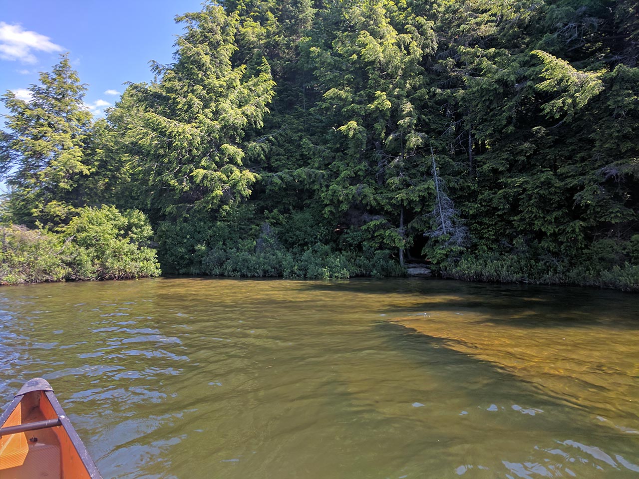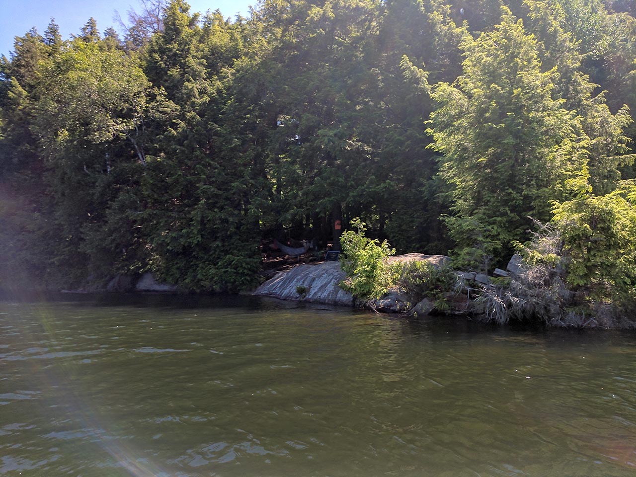 Landing Topography of under-water approach: Sandy beach with a couple of rocks. Water levels were high when I was there, so may be more beach evident at other times. Impediments to disembarking from and/or unloading a canoe: None - Site is hard to see from south and and has a narrow gap in trees but easy to manage. Topography to tent sites: Flat.