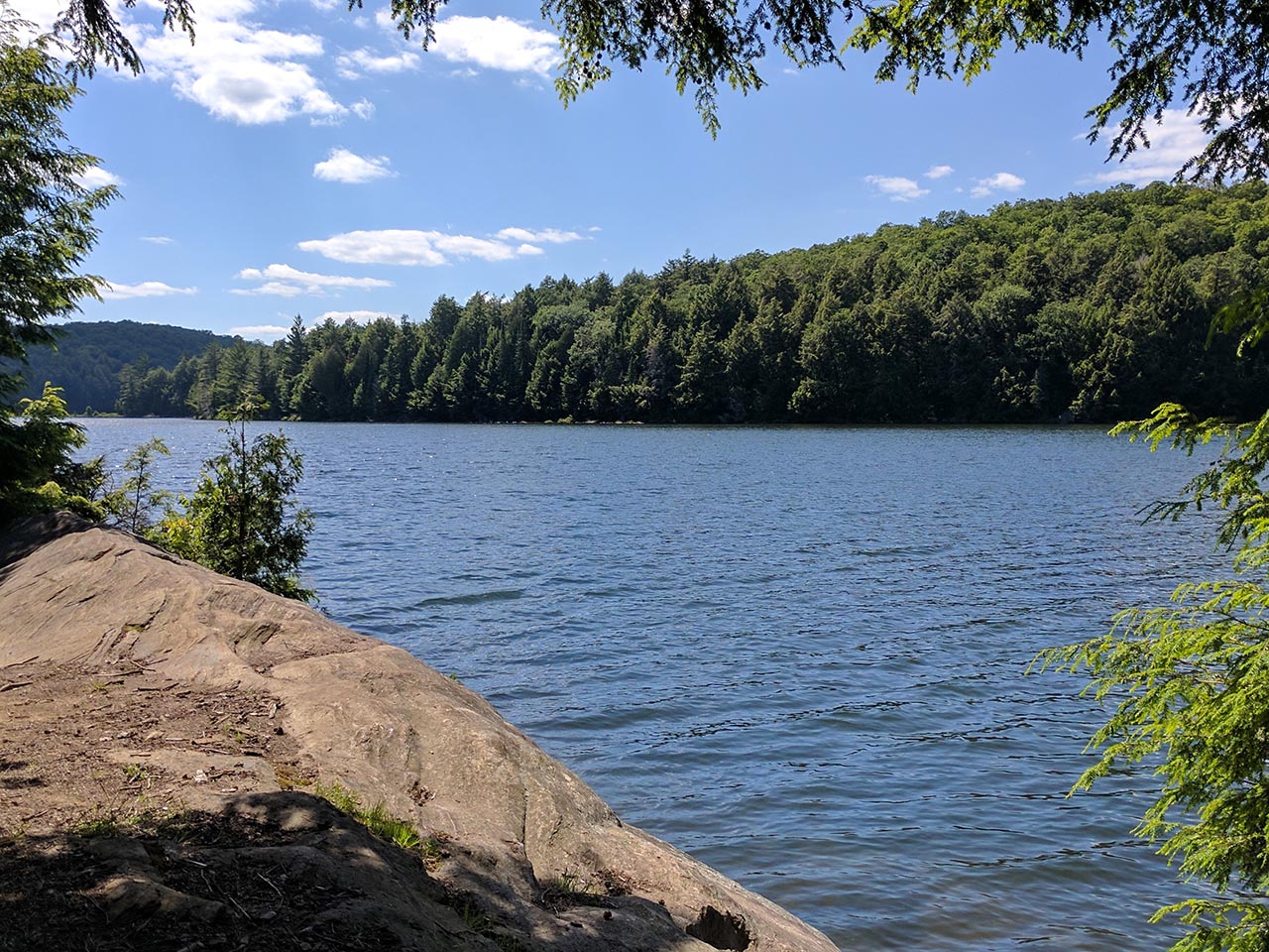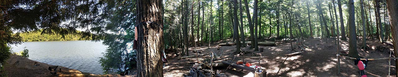 Campsite Campsite maintenance: Regular Open ground area: 20 m by 30 m. Extent of tree cover: Mainly covered. Open area beside water. Degree of levelness: Slightly bumpy. Number of tent sites: One small tent site, one larger site. A third could be used beside fire pit. Other areas are manageable but not ideal. North/West exposure is the across lake. The other exposures are into the forest.