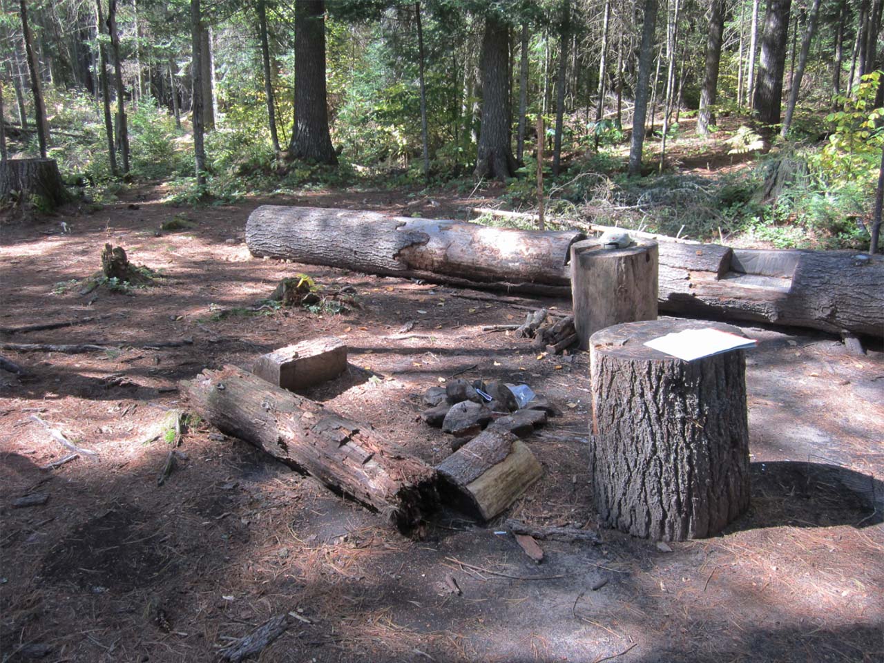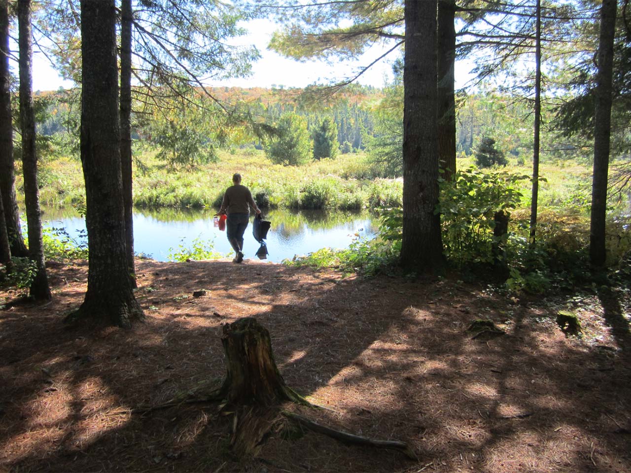 Extent of tree cover: Roughly 60-70%, with some dappled sunlight making it through the canopy. Degree of levelness: Quite level. Number of tent sites: One good one, a couple other options. North exposure: Protected by forest. East exposure: Exposed to winds from over the river meadow. South exposure: Somewhat protected. West exposure: Fully protected by forest behind. View out from the firepit .. over the river and to the distant hillside ... Single large tenting spot .. with other tent sites being feasible around the area. ... General description: A pleasant site for a stop, but not one that offers much of interest in the immediate vicinity. You can fish from the front steps and enjoy a shore lunch from the spectacular view of the broad river valley. However, the remainder of the site shows remnants of tree-fall damage and has a haphazard feel. The thunderbox is a short walk west into the woods. Two unique seats are carved into the trunk of an enormous white pine that was brought down right across the site. Overall accessibility: Beyond the rise up from the river, good. View from the porch .. showing the spectacular view out the front door. Likely trout infested waters. ... Long Marsh Reservation Area (#518) ... Submitted by Joe Zaleski, October, 2013 .. visited October, 2013. |