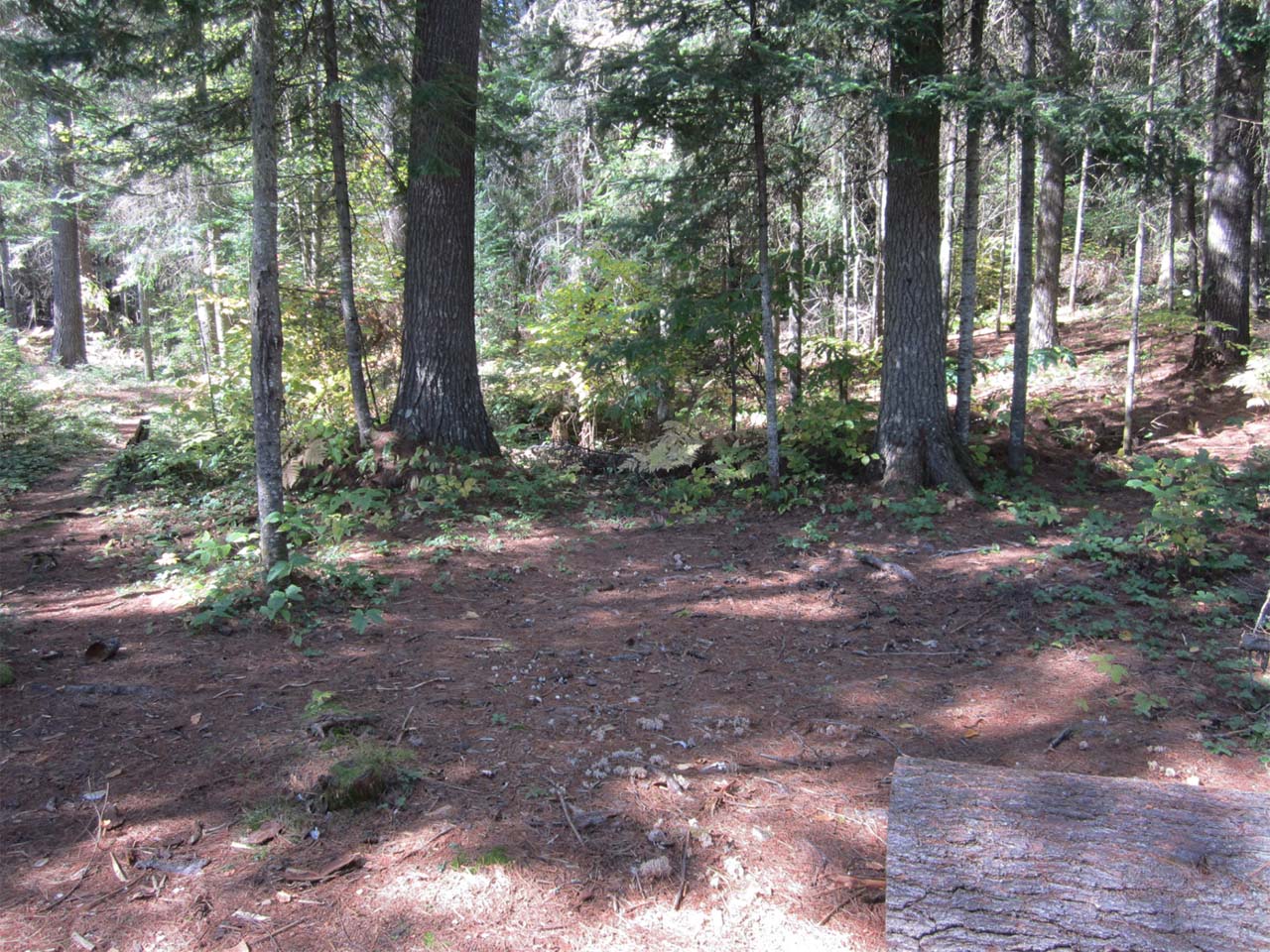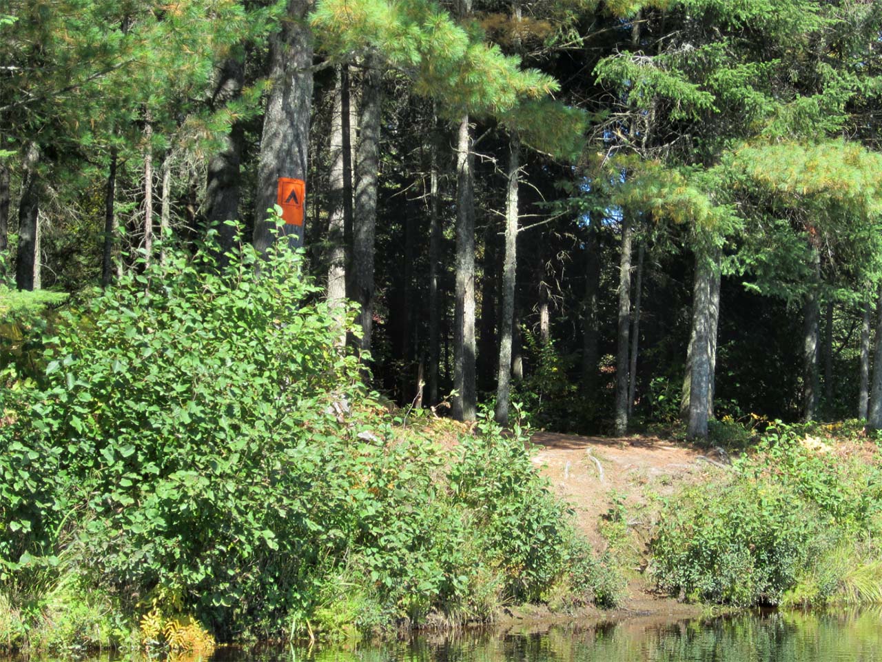 Landing Topography of under-water approach: Gradual gradient from deep to shallow. Impediments to disembarking from and/or unloading a canoe: None, although it is a confined landing. Topography to tent sites: Short, steep riverbank of perhaps 2-3 meters in height with good footing. Approaching from upstream, showing the site as you round the bend in the river approaching from upstream ... This shows the small landing site and the short bank to ascend to the campsite above ... Campsite Regular or low-maintenance: Regular Size of open area: Approximately 8 meters by 10 meters, kidney shaped.