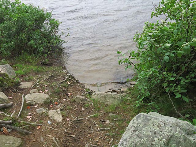 Landing Topography of under-water approach: Small area of sand. Impediments to disembarking from and/or unloading a canoe: Not much space to unload. Topography to tent sites: 4 foot rise up to actual campsite.