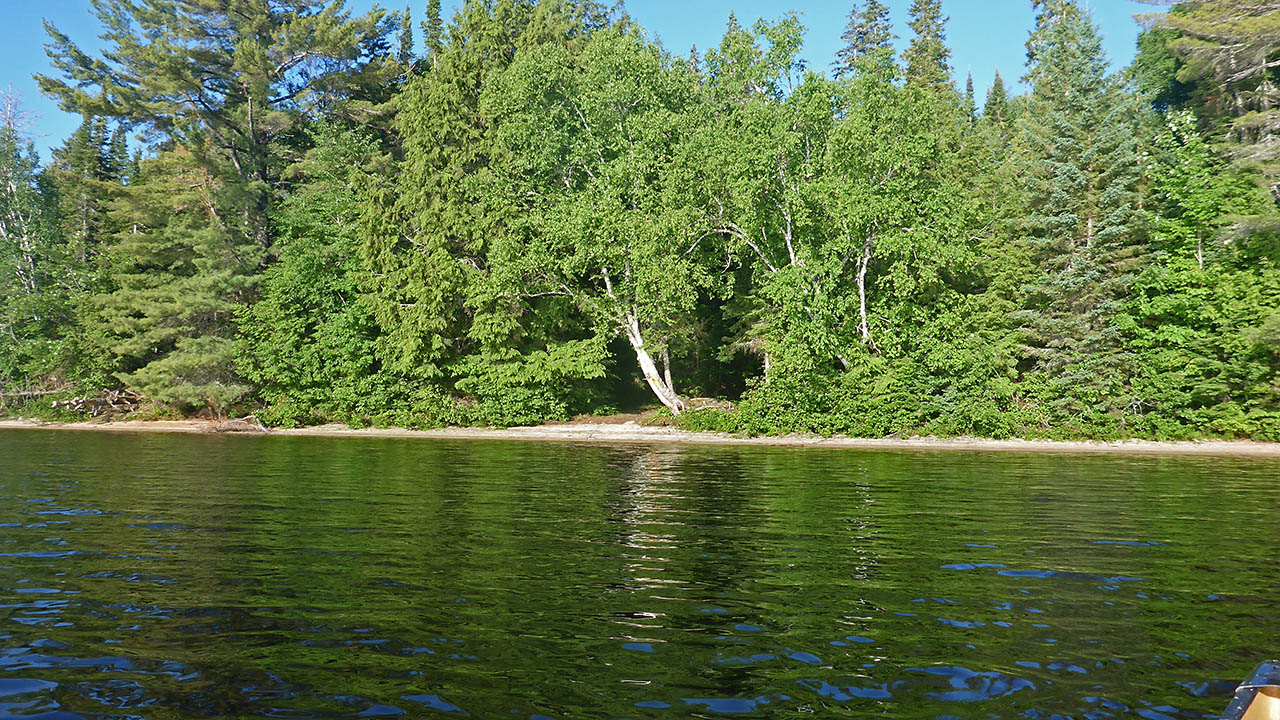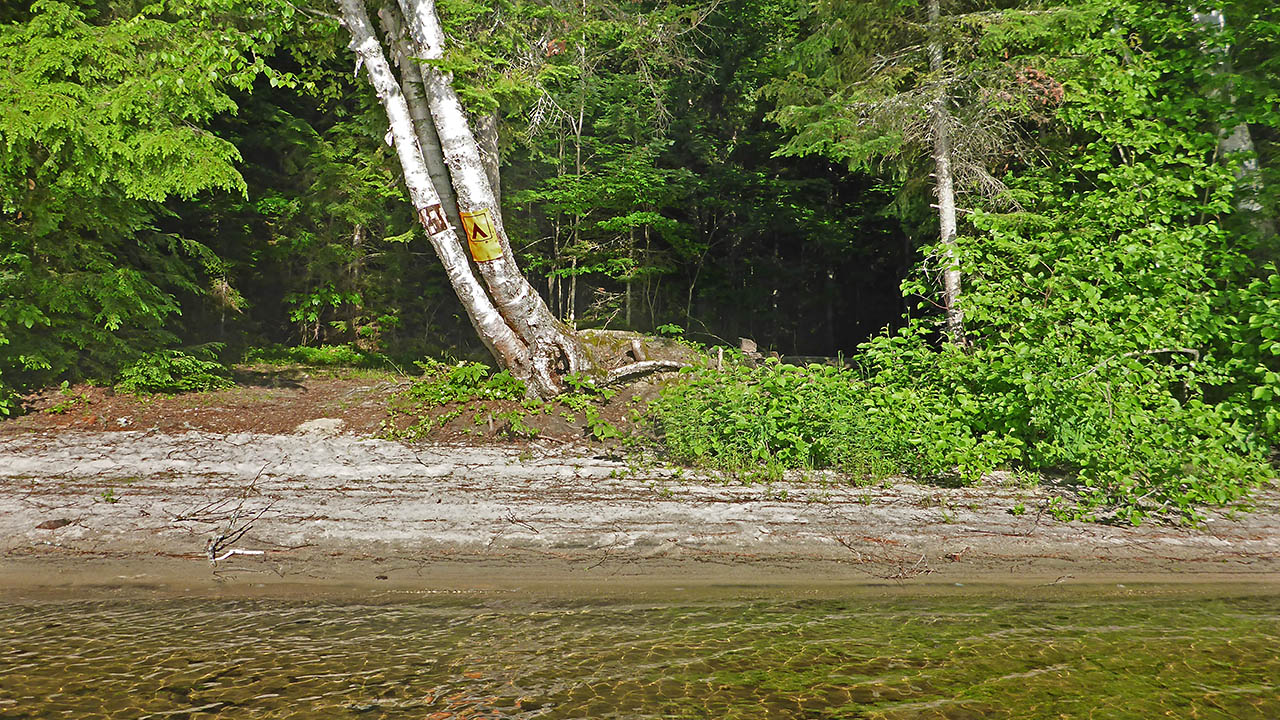 Landing Topography of under-water approach: Sandy beach. Impediments to disembarking from and/or unloading a canoe: None. Topography leading to tent sites: short, smooth rise to site.
