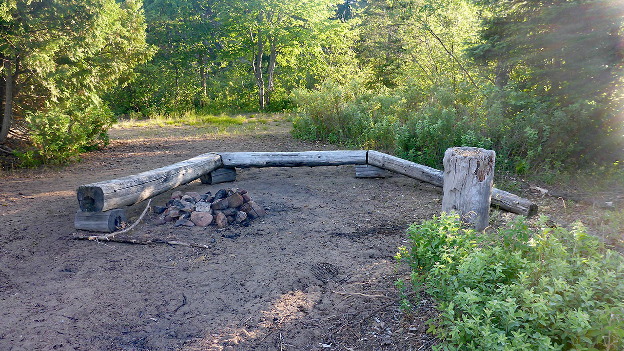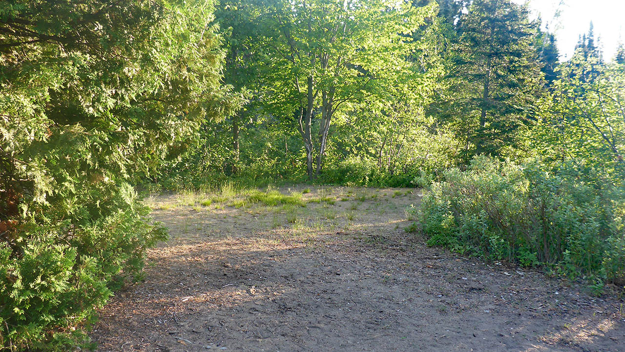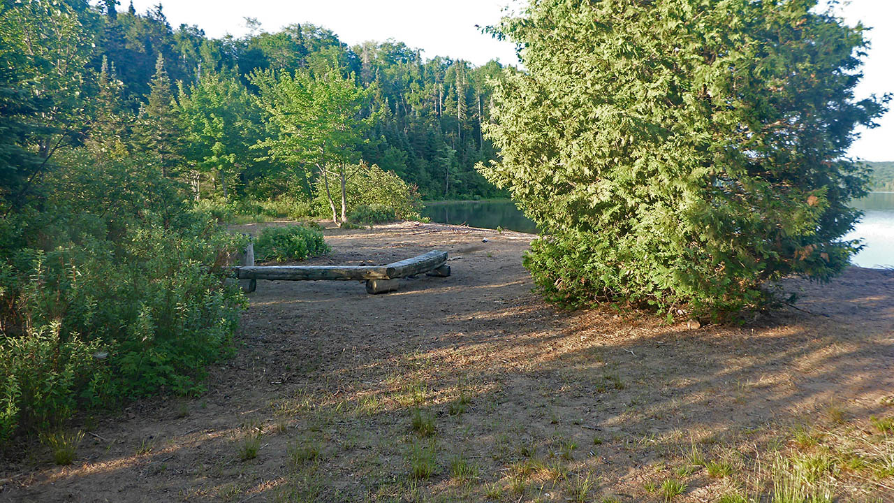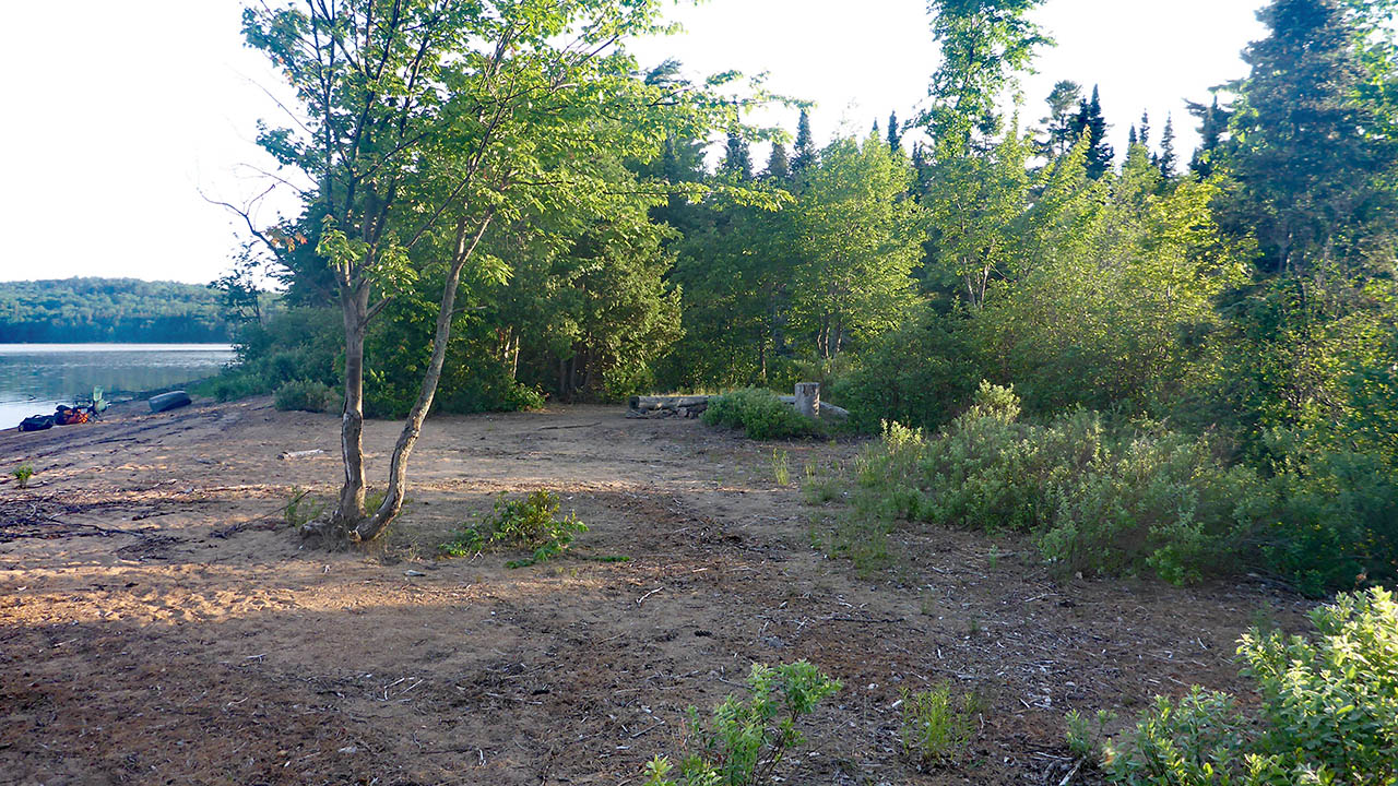Campsite Campsite maintenance: Regular. Size of open area: 20m x 8m. Extent of tree cover: 2%. Degree of levelness: flat and level. Number of level tent sites: maximum. North exposure: trees. East exposure: small trees and wetlands. South exposure: beach and wetlands. West exposure: North Tea Lake. General description: This campsite is exposed! There is zero protection from any wind, and escape from the sun only if one is willing to play "chase the shade". There is a small clump of trees between the firepit and the beach that provides this service.The beach that fronts the campsite is a combination sand and fine gravel, that has unobstructed sunset view. The length of this site is approx. 20 meters, however, there are numerous areas along the beach where a tent could be pitched. Overall accessibility: No issues.