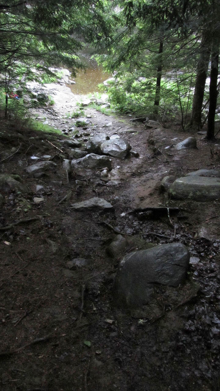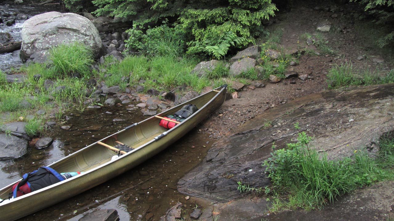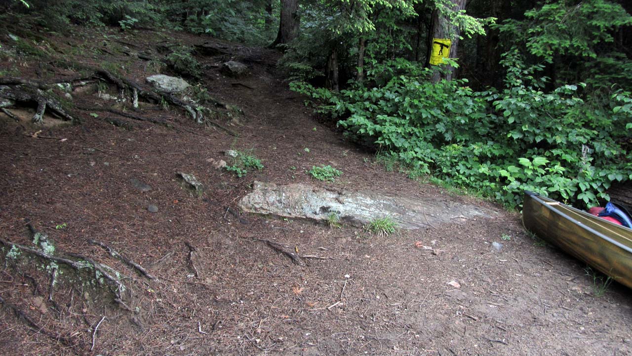 Length of portage: 275m Portage maintenance regular or low: Regular. Elevation above Sea Level @ Pen Lake is 403 meters. Elevation above Sea Level @ Clydegale Lake is 412 meters. Difference in elevation: 9 meters. Elevation of highest point: 416 meters. Overall rise/fall: 13 meters. Landing at Pen Lake Topography of under-water approach: large visible rocks to be navigated around. Impediments to disembarking from and/or unloading a canoe: Large rocks, disembarke carefully or wear water shoes for ease of loading/unloading the boat. Topography of the ascending grade: Steep and rough. Impediments to moving gear to portage trail: narrow and rocky. Narrow landing between sloped and rough rocks ... (photo - B. Bridgeford)![]() ![]() Portage Trail General description: A few ups and downs but nothing too challenging; a few areas with large root obstructions; watch your feet to avoid a twisted ankle. Topographical impediments to travelling: none .. the beginning has an eroded ascent, particularly rough when wet. Areas susceptible to impact by periods of rain or beaver flooding: none. Eroded section rising from Pen Lake ... (photo - B. Bridgeford)![]() Landing at Pen Lake Topography of under-water approach: sandy, with a few visible large rocks further out. Impediments to disembarking from and/or unloading a canoe: none .. there's a small dock to pull alongside when water levels are adequate. Topography of the ascending grade: roots and rocks .. with an uphill haul for for the first 8 meters. Impediments to moving gear to portage trail: None. Smooth grade down from portage to landing ... (photo - Bridgeford)![]() ![]() ![]() Thanks to Jeffrey McMurtrie of Jeff'sMap for supplying the base-layer map component by Creative Commons licensing. Submitted by Claire Cowan, visited August 2013, submitted August 2013 Photos by B. Bridgeford |