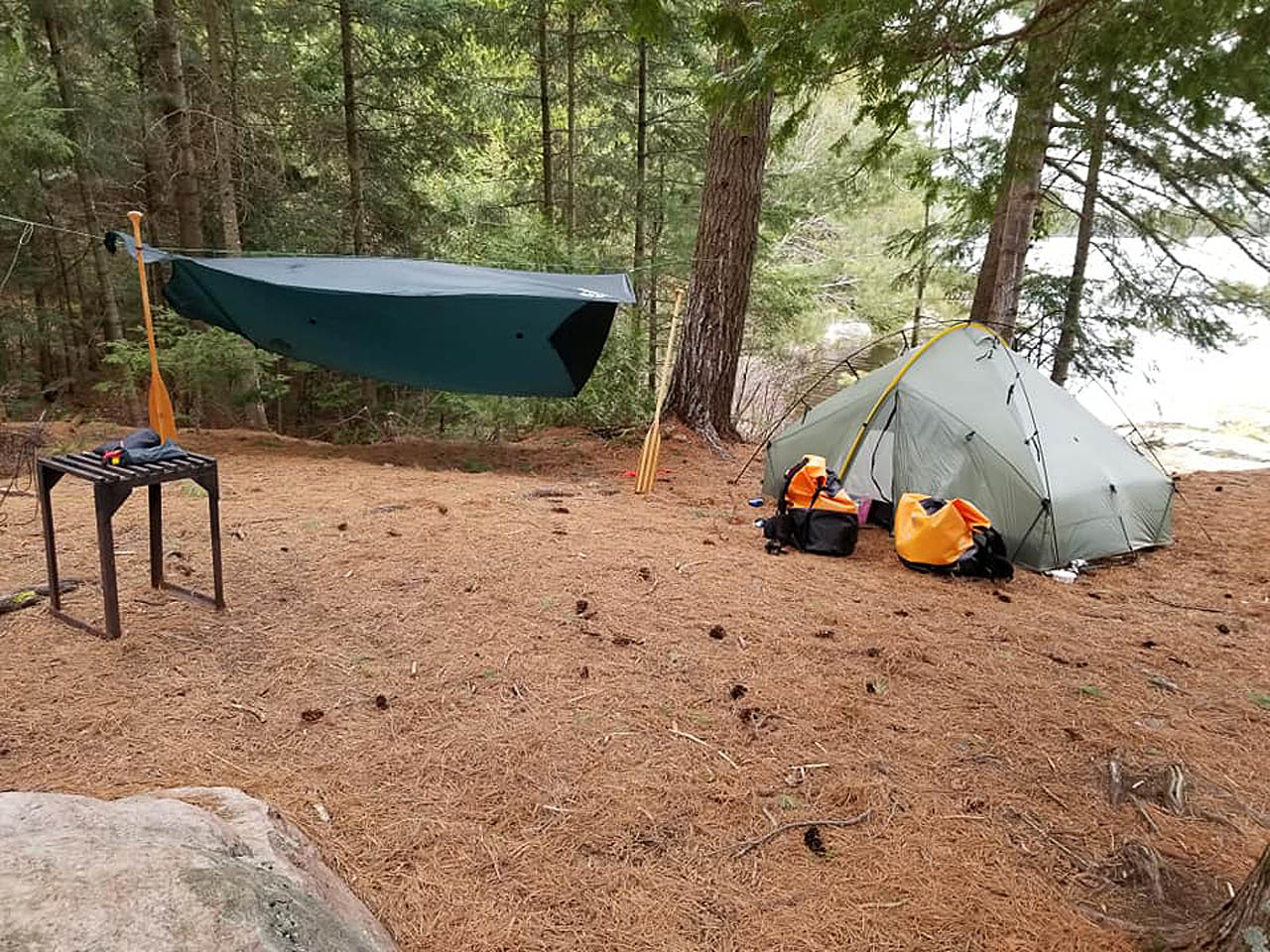Landing Topography of under-water approach: Shallow and gently sloped. Impediments to disembarking from and/or unloading a canoe: None. Topography to tent sites: A very easy slope up to the campsite. South into Pen Lake, landing is to the left ... Campsite Campsite maintenance: Regular. Size of open area: Quite large. Extent of tree cover: Moderate. Degree of levelness: Poor. Number of level tent sites: Three small ones. North exposure: Exposed rock. East exposure: Forest. South exposure: A few trees block the lake. West exposure: Clear view of the Pen-Rock portage. Very small semi-level tentsite right next to the landing, with southern exposure to Pen Lake ... General description: Pros: Easy landing; rock formations make great tables/counters; quick access to Pen Falls; relatively short paddle to Rock Lake. Cons: We visited in early Spring which meant that a good portion of the level tent sites were situated in wet-boggy ground. As such, we were relegated to one of the three "passable" alternate tent sites. The thunderbox is far and difficult to locate .. to the northeastt up two definite changes in elevation. Due to the remoteness of the thunderbox and the site's location relative to the portage trail, human waste abounds behind every potential cover. Avoid this campsite! ![]() Thanks to Jeffrey McMurtrie of Jeff'sMap for supplying the base-layer map component by Creative Commons licensing. Submitted by Paolo Benvenuti .. Visited May 22nd 2019 .. Submission May 31, 2019 |