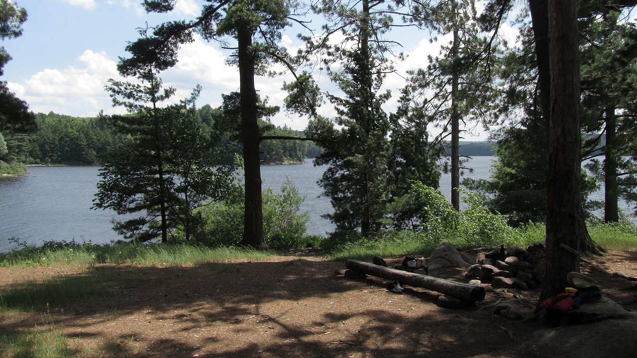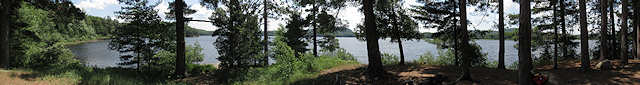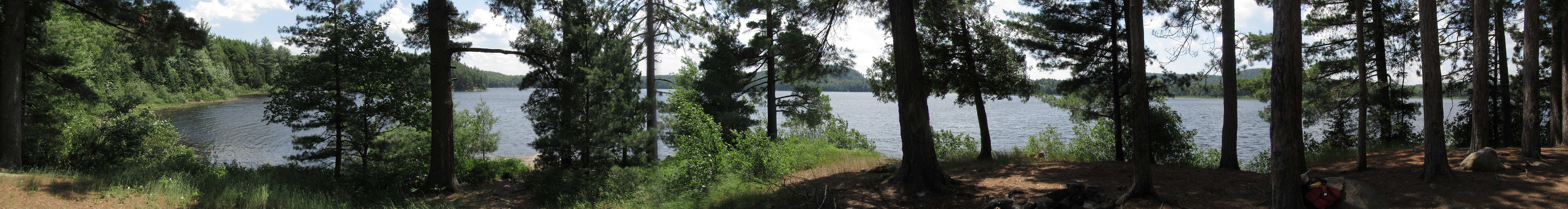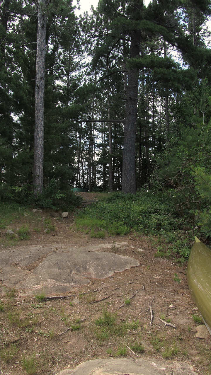 Landing Topography of under-water approach: The steep parts of the rock point are unsuitable for landing. However, by paddling around to the east part of its south side, one can come ashore at a gentle sloped area amongst weeds and some small rocks. Impediments to disembarking from and/or unloading a canoe: While there's only room to beach one canoe at a time, there's plenty of room to unload gear and to pull out canoes. Topography to tent sites: A moderate slope and a short trail leads up to the campsite. Looking due west across the point to the west shore of the lake. The better landing area is to the right of the rock slabs ... Looking down, toward the better landing area ... Looking up the short trail, toward the campsite ... Campsite Campsite maintenance: regular Size of open area: 70' x 90'. Extent of tree cover: Tall pines provide substantial shade to the campsite. However, they have few lower branches, leaving the quite 'open' at ground level. Degree of levelness: Very level over a large area. Number of level tent sites: Ample area for many tents. North exposure: Pines block the north wind pretty well. East exposure: Dense forest effectively blocks east winds. South exposure: A few trees break-up the south view from the actual campsite. However, closer to the lake, the rock point provides a great open exposure West exposure: A line of trees block the view, but do little to block the west wind. In order to be able to benefit from west-wind-blocking tarps, this tent had to be located to the rear of the site, where the trees are spaced closer together ... The firepit is located near the top of the trail from the landing ... A panoramic view looking south and west from northeast of the firepit ... If you have binoculars or a telephoto camera, you stand a good chance of seeing moose across the lake in the morning and evening ... General description: Good for large group, with ample area for many tents. Overall accessibility: Easy to unload at southside beach, with an easy grade up to the actual campsite.