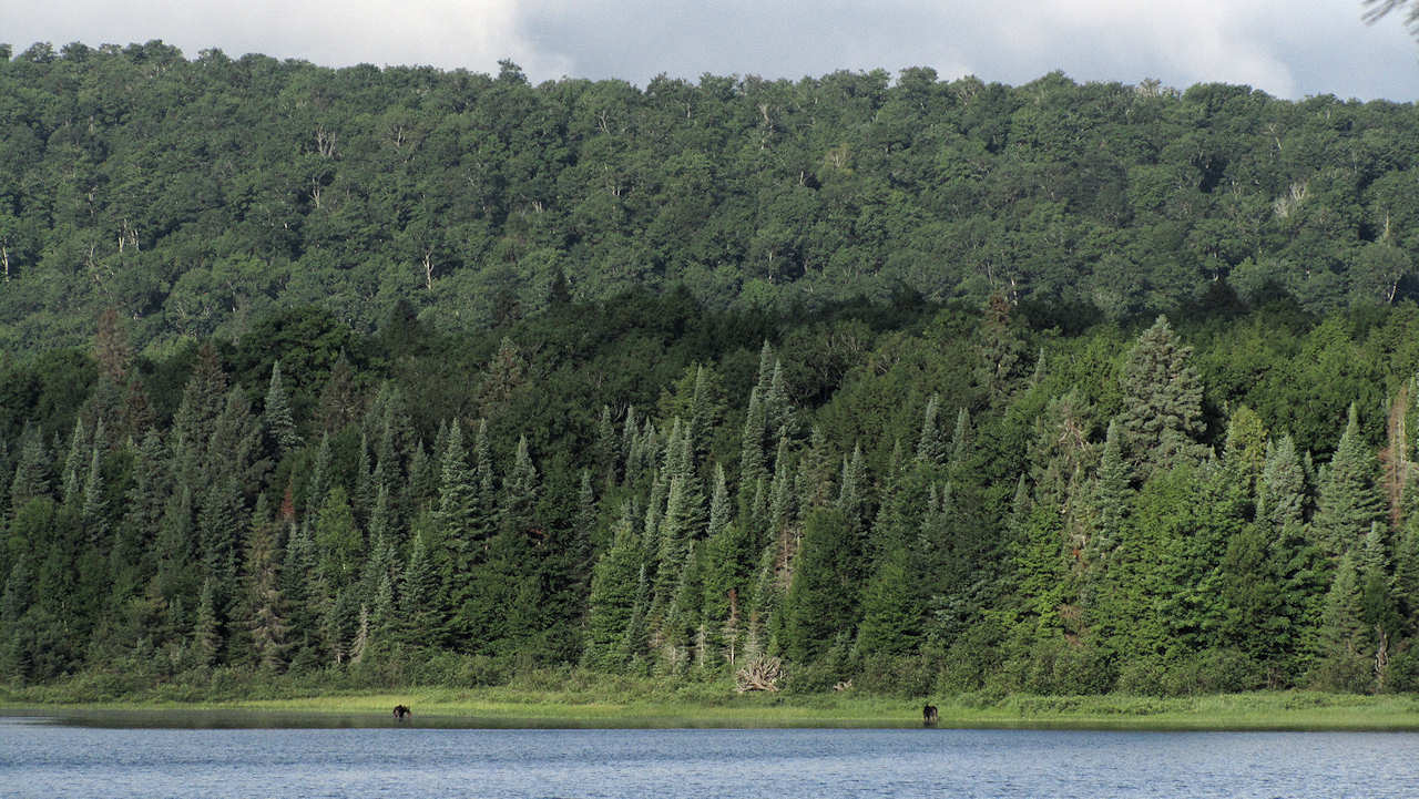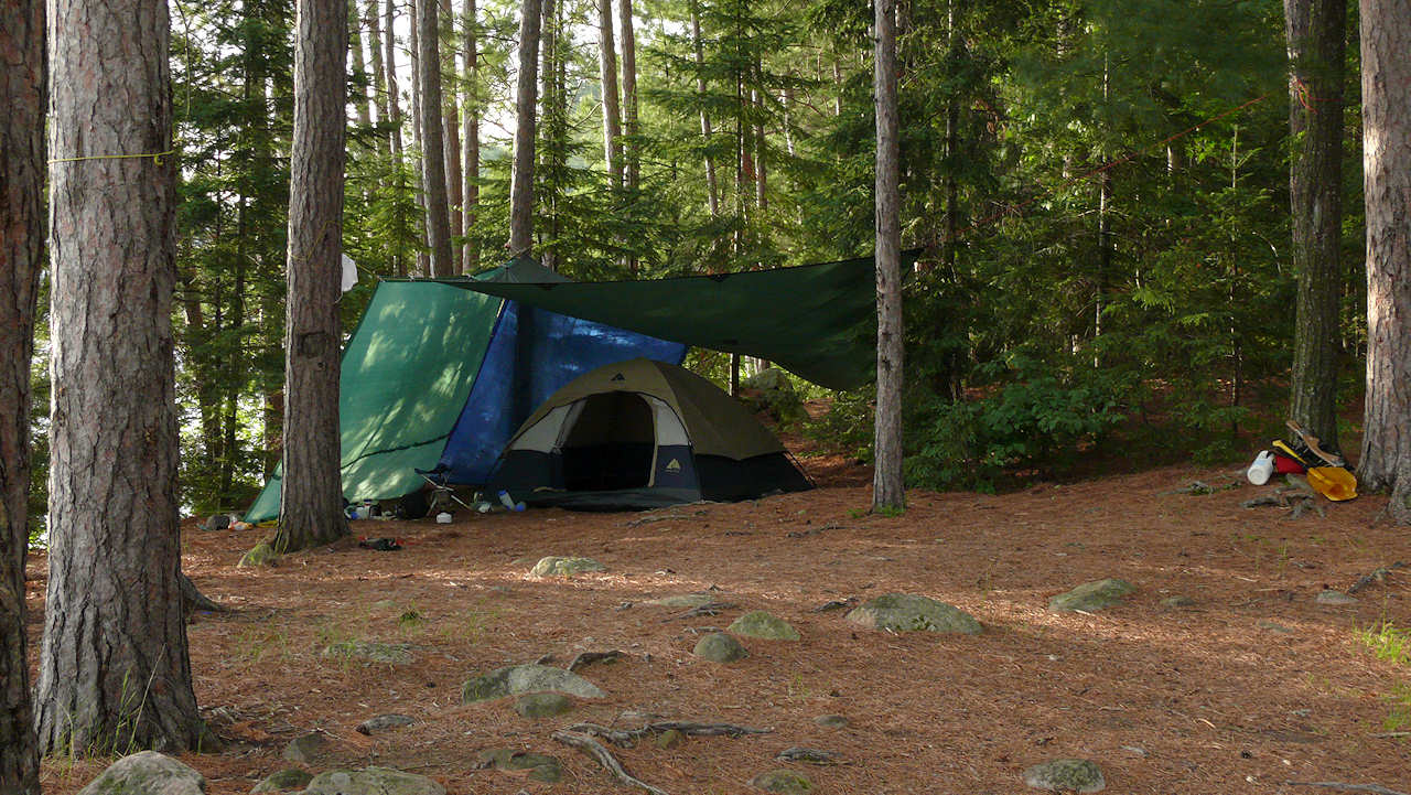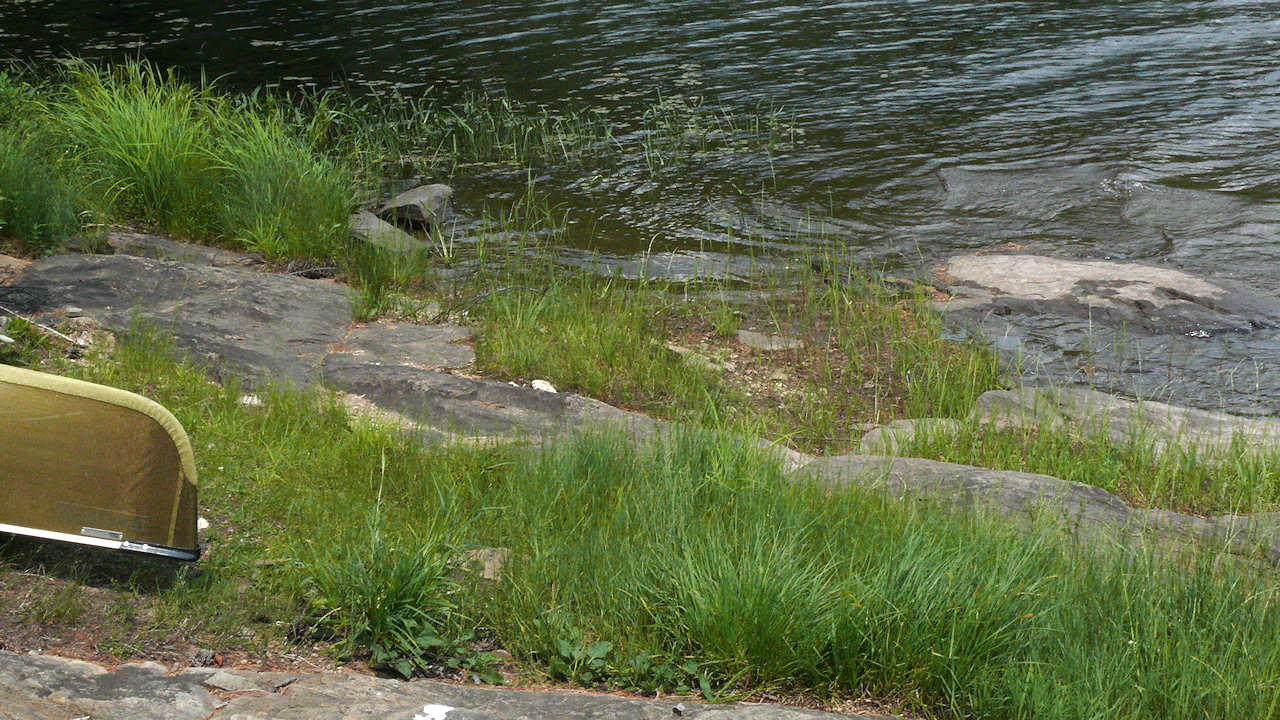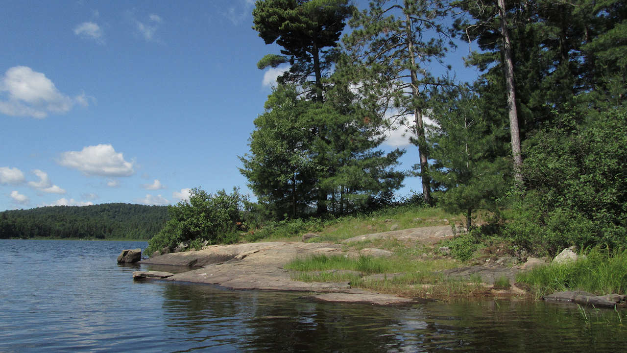 Landing Topography of under-water approach: The steep parts of the rock point are unsuitable for landing. However, by paddling around to the east part of its south side, one can come ashore at a gentle sloped area amongst weeds and some small rocks. Impediments to disembarking from and/or unloading a canoe: While there's only room to beach one canoe at a time, there's plenty of room to unload gear and to pull out canoes. Topography to tent sites: A moderate slope and a short trail leads up to the campsite. Looking due west across the point to the west shore of the lake. The better landing area is to the right of the rock slabs ... Looking down, toward the better landing area ... Looking up the short trail, toward the campsite ... Campsite Campsite maintenance: regular Size of open area: 70' x 90'. Extent of tree cover: Tall pines provide substantial shade to the campsite. However, they have few lower branches, leaving the quite 'open' at ground level. Degree of levelness: Very level over a large area. Number of level tent sites: Ample area for many tents. North exposure: Pines block the north wind pretty well. East exposure: Dense forest effectively blocks east winds. South exposure: A few trees break-up the south view from the actual campsite. However, closer to the lake, the rock point provides a great open exposure West exposure: A line of trees block the view, but do little to block the west wind. In order to be able to benefit from west-wind-blocking tarps, this tent had to be located to the rear of the site, where the trees are spaced closer together ... The firepit is located near the top of the trail from the landing ... A panoramic view looking south and west from northeast of the firepit ... If you have binoculars or a telephoto camera, you stand a good chance of seeing moose across the lake in the morning and evening ... General description: Good for large group, with ample area for many tents. Overall accessibility: Easy to unload at southside beach, with an easy grade up to the actual campsite.