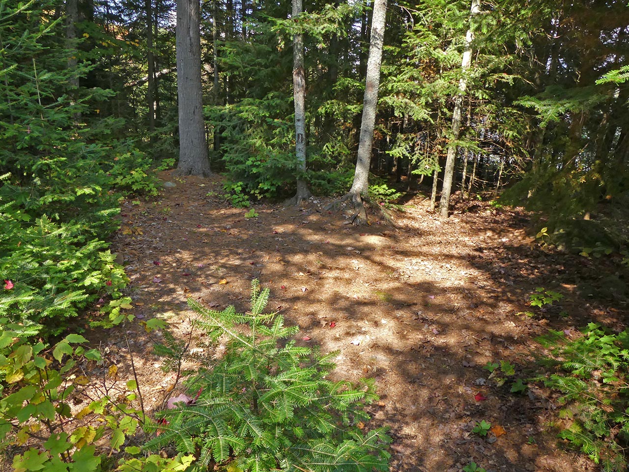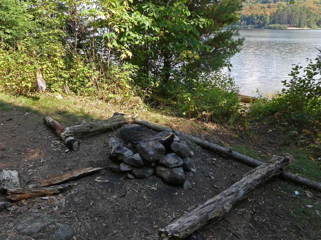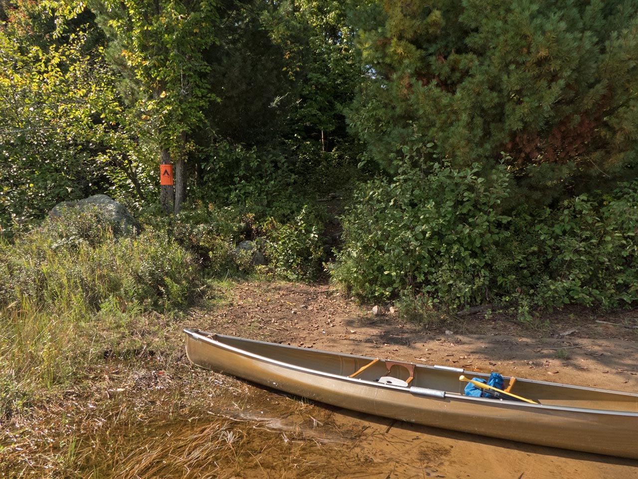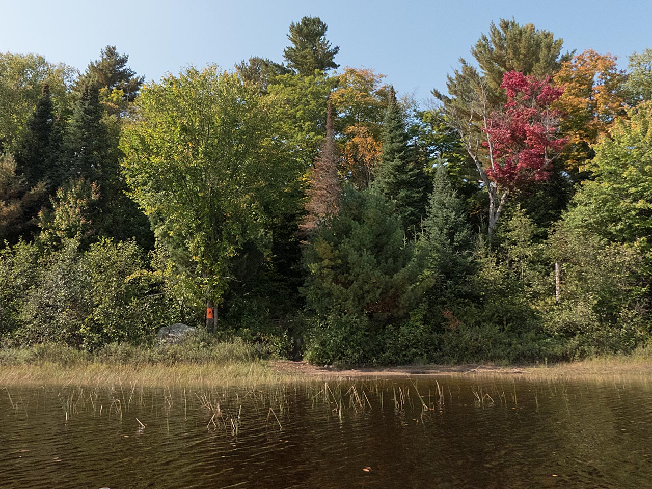 Landing Topography of under-water approach: Shallow sandy approach. Impediments to disembarking from and/or unloading a canoe: None. Topography to tent sites: 10 foot moderate incline to tentsites. Shallow sandy beach in front of campsite ... A slight incline leads to the campsite ... Campsite Campsite maintenance: Regular. Size of open area: 10 x 20 feet. Extent of tree cover: 80%. Degree of levelness: Slight slope toward lake. Number of level tent sites: two. North exposure: Trees. East exposure: Trees and lake to the southeast. South exposure: Trees. West exposure: Forest. Looking down the slope from the campsite to the landing, and across the lake ... The firepit is right at the top of the incline from the landing ... This tentsite is close to the firepit ... This smaller tentsite is back in the trees ... Looking northeast up the lake from beside the landing ... General description: The only view from the firepit area is a narrow one, to the southeast between the trees. No breeze gets into the tentsite area. The shoreline south of the landing is a grassy marsh area with moose footprints at the time of visit. Overall accessibility: Easy. ![]() Thanks to Jeffrey McMurtrie of Jeff'sMap for supplying the base-layer map component by Creative Commons licensing. Submitted by Barry Bridgeford .. Visited Sept. 2017 .. Submission Oct. 2017 |