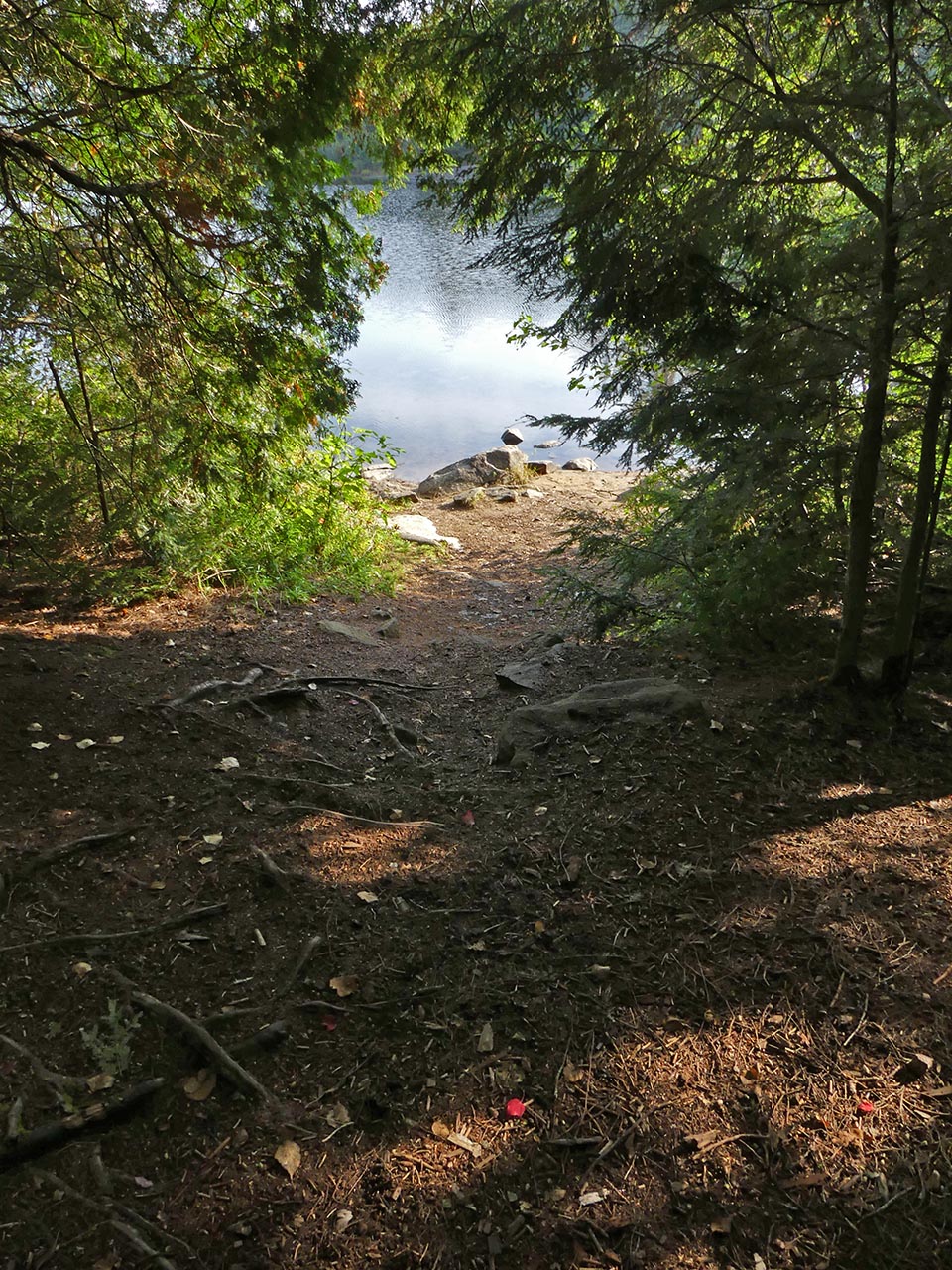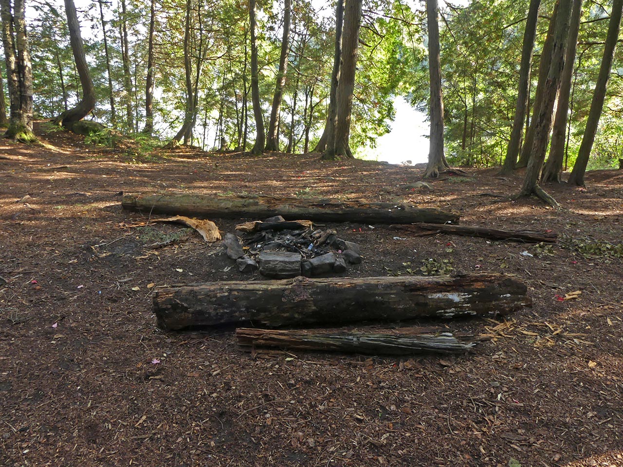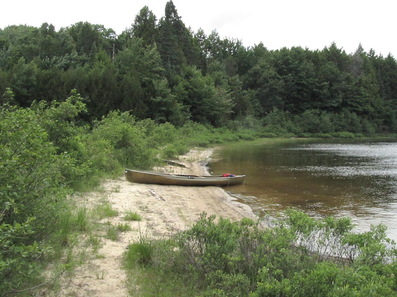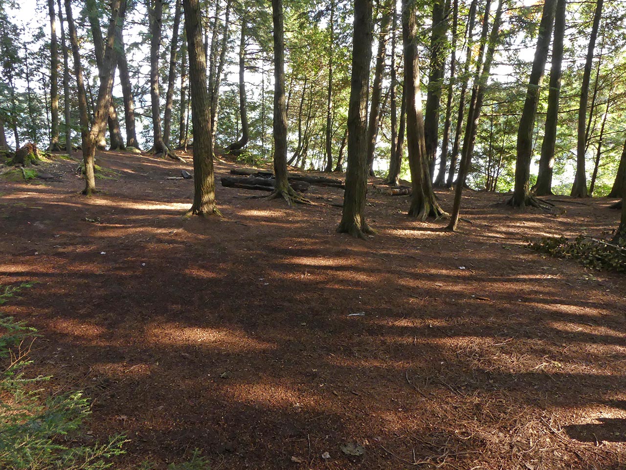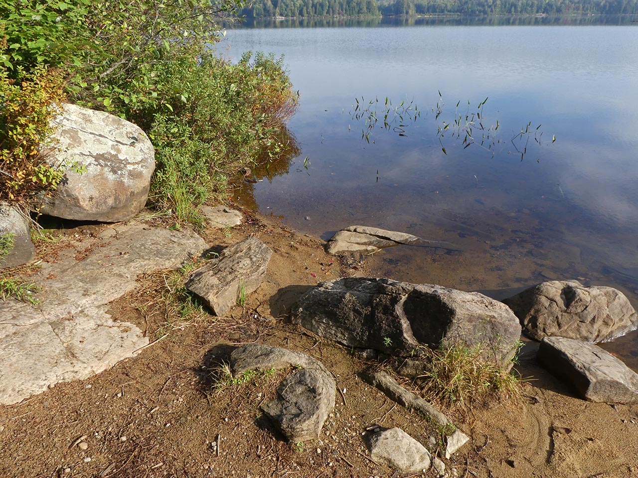 Landing Topography of under-water approach: Shallow sand beach with scattered rocks. Impediments to disembarking from and/or unloading a canoe: None. Topography to tent sites: Gentle 10 foot grade up to campsite. Sandy beach landing amidst some large rocks, with view of the north bay ... Looking down from the campsite to the landing ... Campsite Campsite maintenance: Regular. Size of open area: Entire north end of island is open under canopy of mature trees. Trunks of these trees grow spaced about. Extent of tree cover: 100%. Degree of levelness: Large areas are level. Number of level tent sites: Many. North exposure: Shoreline trees and shrubs. East exposure: Shoreline trees and shrubs. South exposure: Mature tree trunks and canopy. West exposure: Shoreline trees and shrubs. Firepit with the gap in the trees beyond, leading down to the landing ... Looking over the tentsite area, past the firepit toward the shoreline trees ... Someone has equipped the outhouse with a secure modern seat and lid ... The campsite's 'island' is connected to the mainland (where firewood can be gathered) by this north-facing beach (photo 2012) ... General description: The campsite is encircled by deciduous shoreline shrubs and trees. It's canopy of tree-tops extends to the south end of the 'island' where another campsite is located, from which privacy is provided by the distance between them. However, these campsites are served by a pair of 'outhouses' which are located somewhat close together. Overall accessibility: OK. ![]() Thanks to Jeffrey McMurtrie of Jeff'sMap for supplying the base-layer map component by Creative Commons licensing. Submitted by Barry Bridgeford .. Visited Sept. 2017 .. Submission Oct. 2017 |