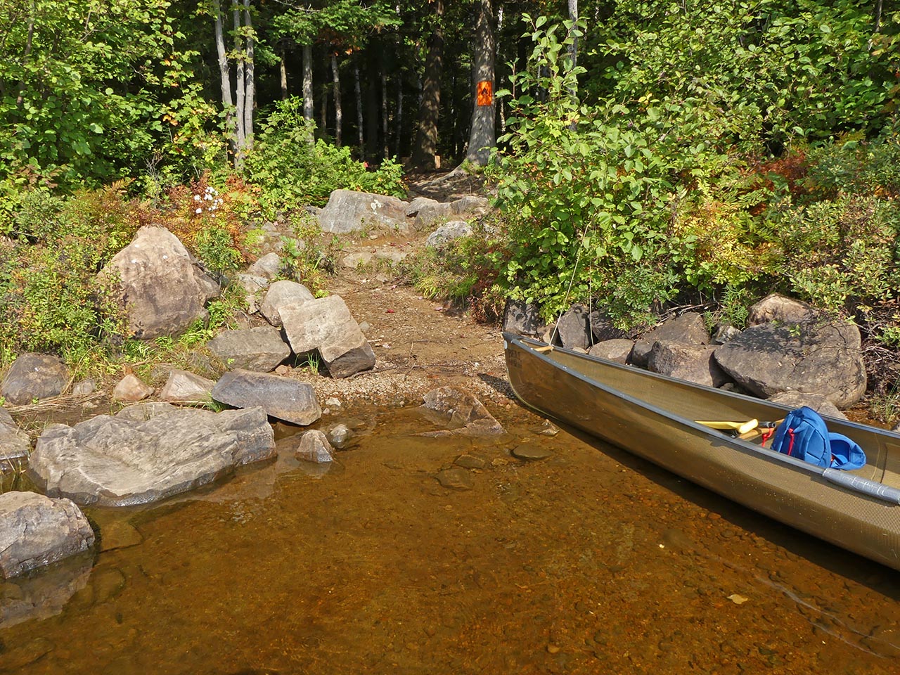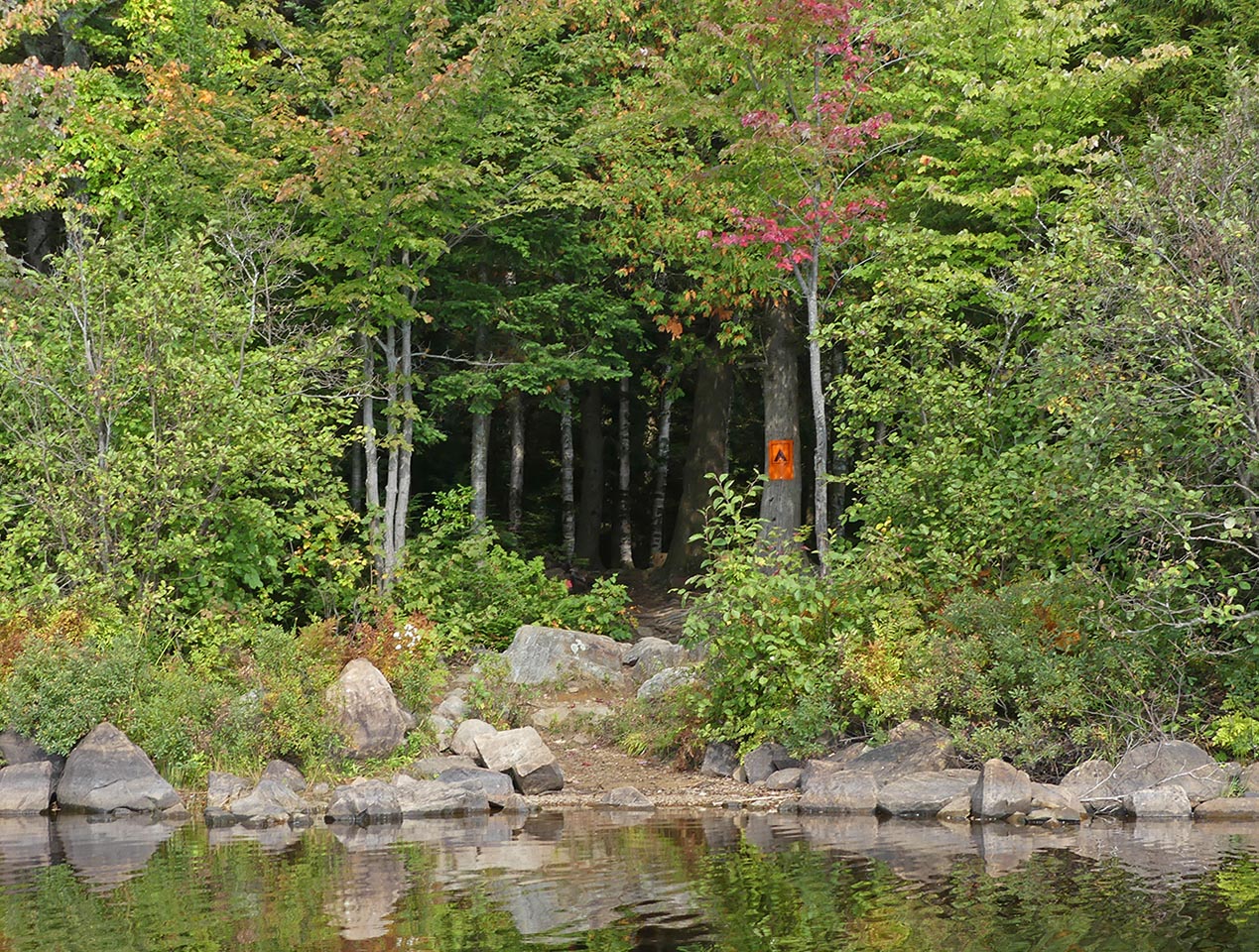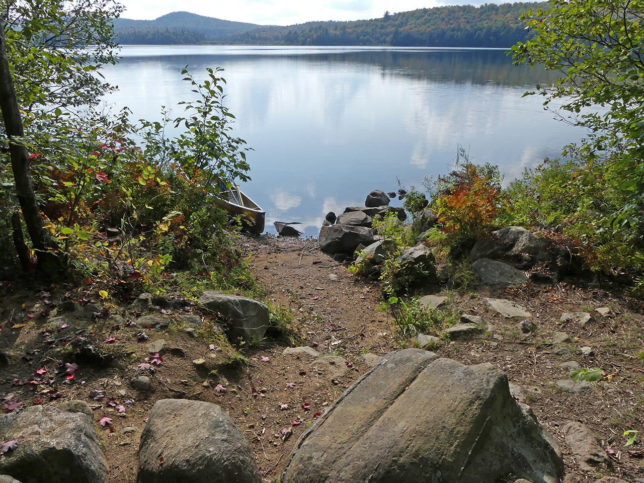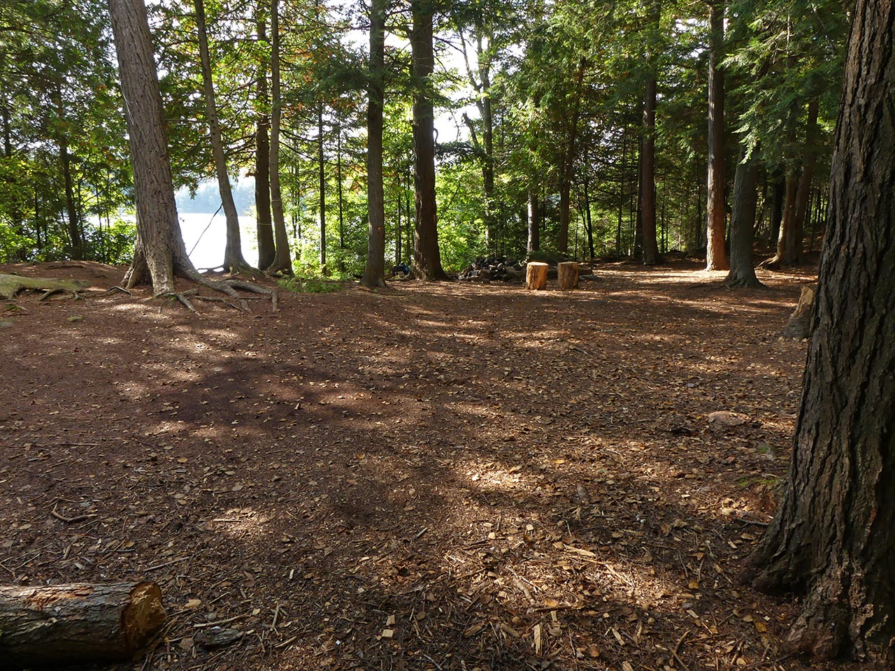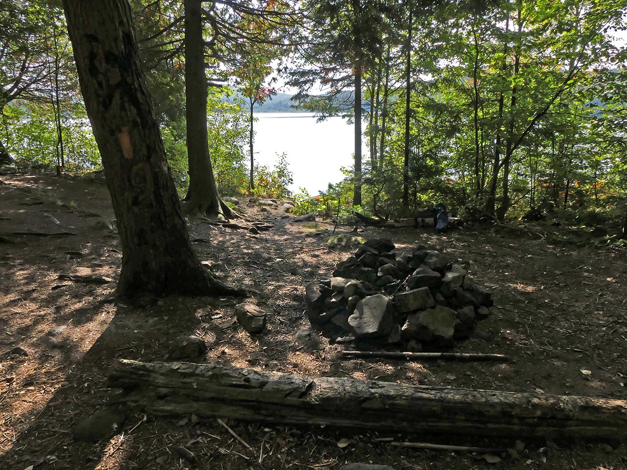 Landing Topography of under-water approach: Shallow sand with some rocks. Impediments to disembarking from and/or unloading a canoe: None. Topography to tent sites: Moderate rocky approx. 6 foot rise to campsite. Landing and rise to campsite as seen from on the water ... A moderate incline leads to the campsite ... Campsite Campsite maintenance: Regular. Size of open area: Minimal. Extent of tree cover: 100%. Degree of levelness: Level. Number of level tent sites: Three. North exposure: Forest. East exposure: Trees. South exposure: Lake and trees. West exposure: Trees. Looking down from the edge of the campsite to the landing, and southwest across the lake ... The firepit has full tree cover and only a narrow view of the lake ... The tentsites are grouped together, east of the firepit ... General description: The firepit area has only a narrow view, to the southwest between the trees. Little sunshine and no breeze gets into the tentsite area. Overall accessibility: Easy. ![]() Thanks to Jeffrey McMurtrie of Jeff'sMap for supplying the base-layer map component by Creative Commons licensing. Submitted by Barry Bridgeford .. Visited Sept. 2017 .. Submission Oct. 2017 |