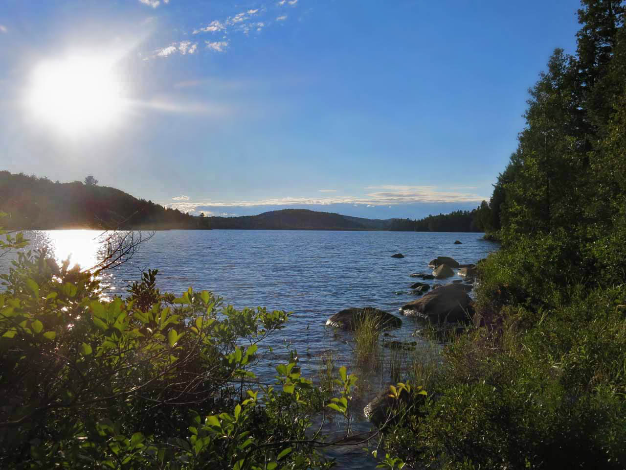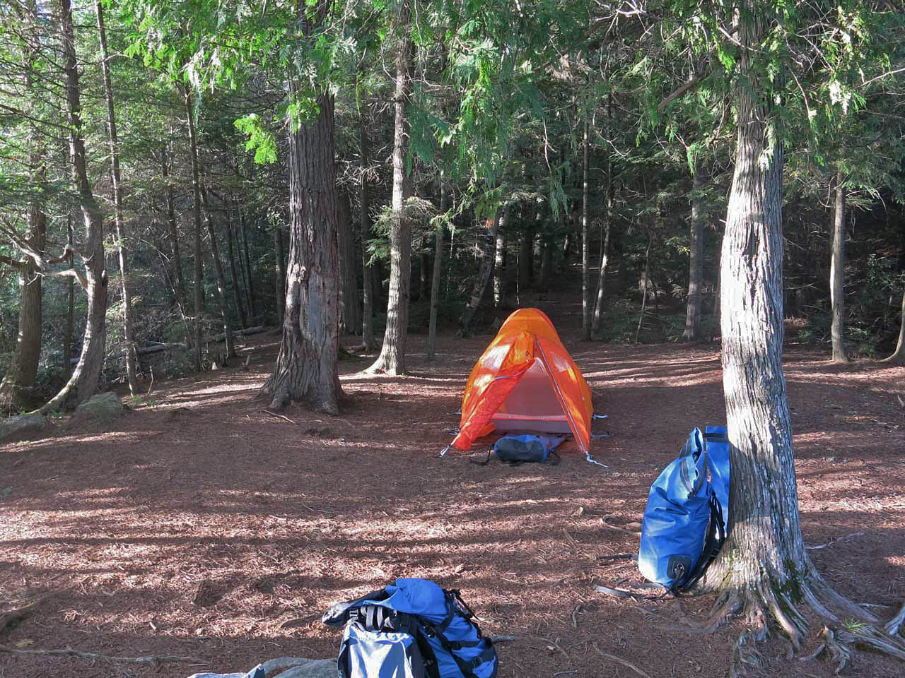 Campsite Campsite maintenance: regular Open ground area: None open to the sky. Extent of tree cover: 100%. Degree of levelness: Level tent pads. Number of level tent sites: 2. North exposure: Trees, can see lake. East exposure: Trees. South exposure: Trees, can see bay. West exposure: Trees, can see lake.
