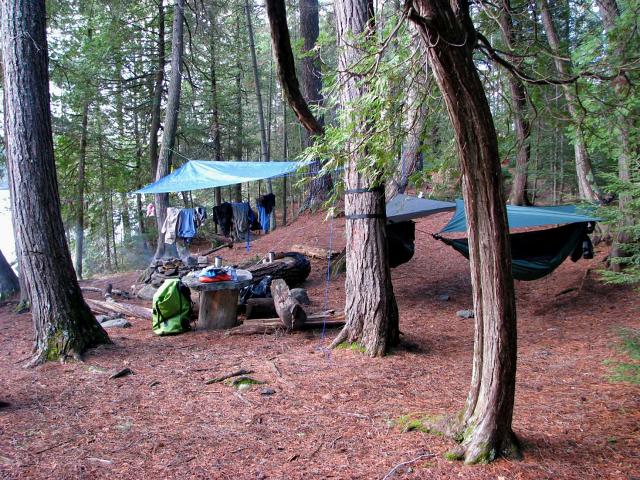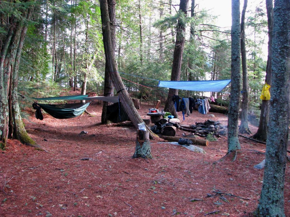 Landing Topography of under-water approach: Deep water just off shore Impediments to disembarking from and/or unloading a canoe: A few sloped, flat shield rocks both on shore and just offshore partially submerged. Topography leading to tent sites: brief steep bank could be slippery when wet, then gentle grade to site. Perhaps 8 vertical difference from water level. View of the gently sloping rock surfaces. Campsite Regular or low-maintenance: regular Size of open area: approximately 60 X 60 Extent of tree cover: 86% Degree of levelness: gentle saddle with a couple tent areas that are mostly flat. Number of tent sites: two suitable for three man tents, perhaps an extra site to the northeast of the clearing. North exposure: protected East exposure: light protection from east winds. Good views of sunrise over Redpine Bay South exposure: protected West exposure: protected good view on the other side of the island General description: A beautiful setting for a campsite I give it a grade of A. Adequate tenting area for 2-3 tents, sound firepit with two large log benches and one stone slab table in the kitchen area. Canopy allows a dappling of sunlight through but generally protected and covered. Views out the front and back are beautiful (weather permitting). Average site for star gazing, below average for swimming. A pretty site with mature conifers throughout and a comfortable layout. Small-ish but could support a group of 5 or 6 comfortably. Overall accessibility: good. View of the kitchen and tenting area facing south. View of the kitchen and tenting area facing north. ![]() Thanks to Jeffrey McMurtrie of Jeff'sMap for supplying the base-layer map component by Creative Commons licensing. Submitted by Joe Zaleski, January 2011 .. visited May 2010. |