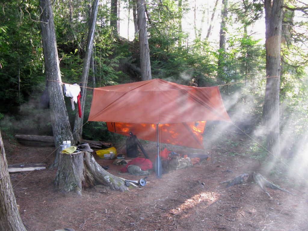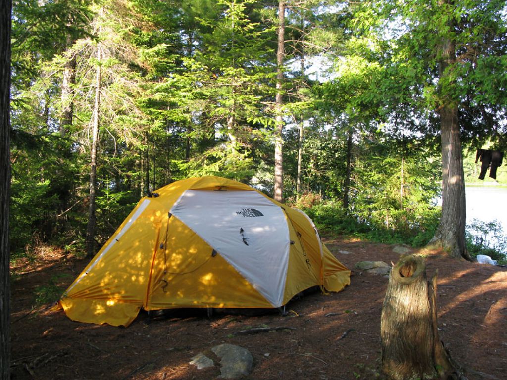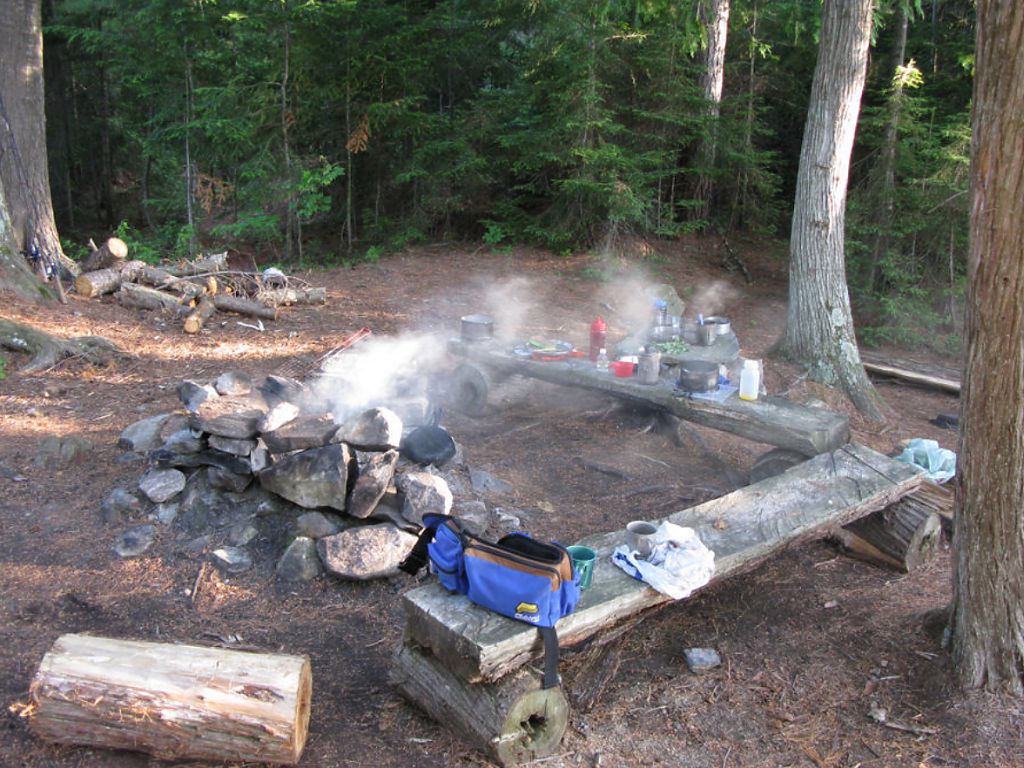 Landing Topography of under-water approach: Two possible landings ... The primary landing is west facing, and it's a small shallow sandy beach with a few foot-long boulders scattered below the surface. The point is surrounded by deeper water in the 40' range just beyond the beach. There's a 2nd smaller landing on the east side, again a sandy landing with a few weeds. No obstructions to landing from either access. Impediments to disembarking from and/or unloading a canoe: None at normal to low water levels. High Spring water levels may push the landing into the shrub-lined (east) or dirt-banked shoreline (west). Should still not impede access to any great degree however. Topography to tent sites: 1.5 meter vertical rise to the tenting/camping area from the canoe landing from either shore. Main tenting/firepit area is within 10 meters of either landing. Campsite itself with generally all flat topography. Landing area, view is west back towards the channel to the Petawawa R. ... View of tarp setup south-west of the firepit ... Campsite Campsite maintenance: regular Size of open area: 120' x 120'. Extent of tree cover: 75% canopied over tent/kitchen area. Degree of levelness: Relatively flat around firepit and tenting area, a very slight grade sloping eastward. Number of level tent sites: At least 3 flat sites adequate for3-4 man sized tents. North exposure: Well protected from the north as the point which this site is nestled on was thickly forested in that direction. East exposure: Eastern canoe landing is exposed to the east winds – which would make it a 2nd choice to launch/land from during strong easterlies. South exposure: Campsite bordered on its south by thick evergreen forest. West exposure: Western landing is nestled in a small islet with some northern protection provided by a cusp jutting out from that point Nice small sandy beach with late afternoon sun exposure – good sunset view. General description: Nice well used campsite with a protected tenting and cooking area. Large in-ground 3’ high straight cut stumps made some ok tables and the flat cut benches provided comfy seating around firepit. One grill present. Thunder box located south of campsite. No issues with firewood – lots to go around. Limited sun exposure within campsite – early morning sun along east canoe landing and late afternoon sun on the west shore. Others just dappled during the day on main campsite Overall accessibility: Great. One of the 3 tent sites .. 2 others nestled privately amongst forest 20 meters to the north .. looking north. ... Campfire area and 2 cut saw log benches.. looking south. ... ![]() Thanks to Jeffrey McMurtrie of Jeff'sMap for supplying the base-layer map component by Creative Commons licensing. Submitted by Stephen Molson, November 2009 .. visited July 2009. |