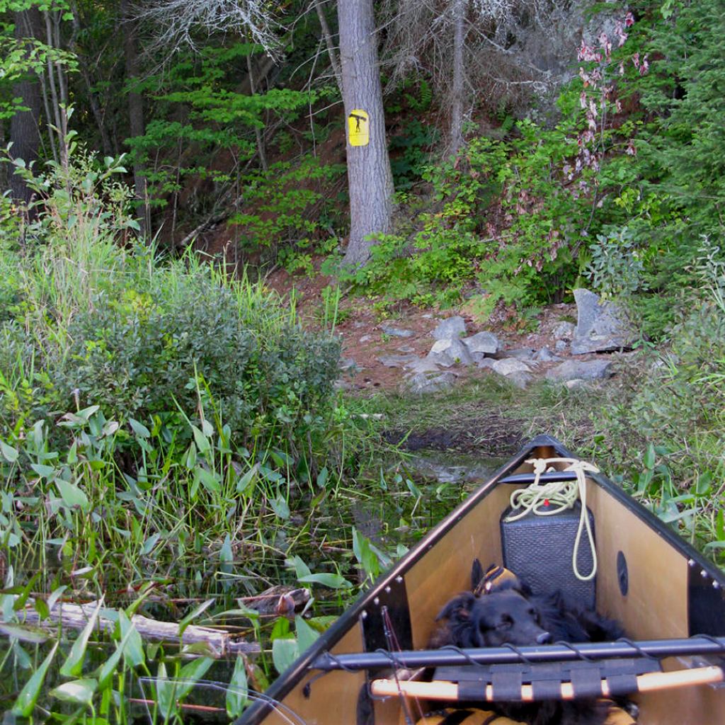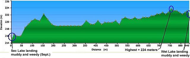Length of portage: 890m Portage maintenance regular or low: Low. Landing at Sec Lake: N45 49 25.6 W77 33 29.5 Elevation above Sea Level: ~215 m Landing at Wet Lake: N45 49 39.6 W77 33 52.2 Elevation above Sea Level: ~222 m Rise/Fall Overall: 7 meter rise from Sec Lake to Wet Lake. Highest elevation was 224 meters Cross Section of portage elevation changes ...![]() Landing at: Sec Lake Lake (downstream) Topography of under-water approach: Shallow muddy weedy area on landing with shrubs/emergent Pickerel Weed straddling the shore makes footing cumbersome. Available area for managing canoes: Room for 2 canoes, with one pulled up on shore. Adequate gear storing/management areas up on bank. Impediments to disembarking from and/or unloading a canoe: Small, weedy (in summer) and narrow landing. Emergent Pickerel Weed plants and shrubs along shore to walk over. High water levels may put the landing closer to the tree line but no emergent weeds. Below water the ground is soft sinking mud. Impediments to moving gear to portage trail: Narrow and emergent weed lined landings (depending on time of year) made gear management tight, but adequate space for storage and movement. Canoe landing on Sec Lake looking east ...![]() ![]() Portage Trail General description: Well trodden portage, good dry footing throughout, some boulder and root sections where the forests narrows closer to the Wet Lake end. No wet areas encountered other than at landings. Topographical impediments to traveling: None. Areas susceptible to impact by periods of rain or beaver flooding: Early spring typical conditions would be high water on landing areas and potential muddy footing at start/end. Mid-way along the portage the trail could experience lite flooding in early Spring on account of marsh proximity to the east but no flooding section encountered during hat trip. Topography of the ascending grade: Topography of landing and subsequent ascending grade on the Sec side is relatively flat. An initial slow taper rise of 4 meters over 100 m ground distance, a total elevation change of only 7 meters over its entire length. No steep climbs anywhere along the portage Wet lake landing is generally flat and portage sufficiently wide through the majority of the walk. One angled tree forced an easy 4 meter detour onto a secondary trail. Footing is firm throughout, no flooding or wet sections encountered. Landing at: Wet Lake (upstream) Topography of under-water approach: weedy with emergent plants, an emergent log framing the landing that juts out into the water makes for an adequate pier for boat loading. Available area for managing canoes: Depending on water levels 2 canoes, one being in the water with adequate gear storage. Impediments to disembarking from and/or unloading a canoe: Small, weedy (in summer) and narrow landing. Emergent Pickerel Weed plants and shrubs along shore to walk over. High water levels may put the landing closer to the tree line but no emergent weeds. Portage landing at Wet Lake ...![]() ![]() ![]() Thanks to Jeffrey McMurtrie of Jeff'sMap for supplying the base-layer map component by Creative Commons licensing. Submitted by Stephen Molson ... January, 2010 |