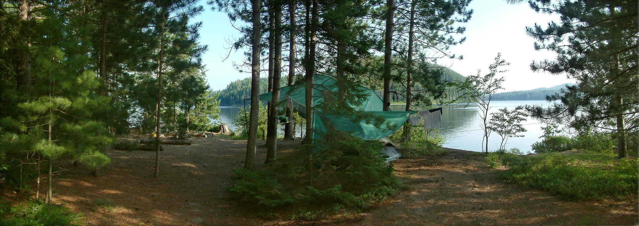 Landing Topography of under-water approach: Sand beach. Impediments to disembarking from and/or unloading a canoe: None. Topography to tent sites: Substantial sandy rise. The sand beach landing is north of the tentsites ... Park staff coming ashore at the landing (photo by Bill Warren) ... Campsite Campsite maintenance: regular Size of open area: Large open flat area is partly under pine trees and partly without tree cover. Extent of tree cover: 50%. Degree of levelness: All on one flat level. Number of level tent sites: Room for plenty of tents. North exposure: Pines block the view and most of the wind. East exposure: Forest. South exposure: Trees and bushes block some of the view and wind. West exposure: Open to view and weather. Looking north across firepit to tentsites ... Looking south from tentsites and across firepit ... Panorama looking southwest through tentsites and firepit area ... To the northeast in the forest is another flat area with more possible tentsites ... General description: This campsite has a great view and sandy beach. However, it would benefit from protective tarps if weather blows in from the west. Also, there's a logging dorm-camp and a truck road located a short distance to the east, so some sounds could carry over. Overall accessibility: This campsite is quite accessible.