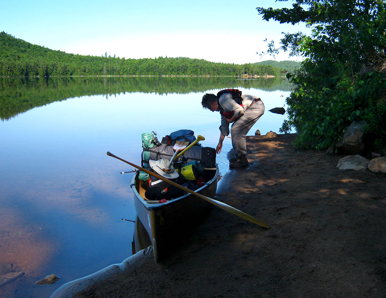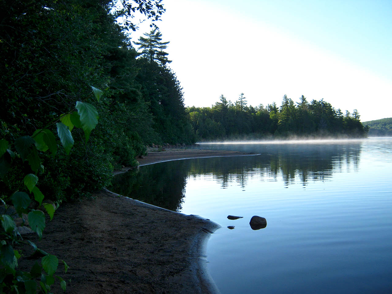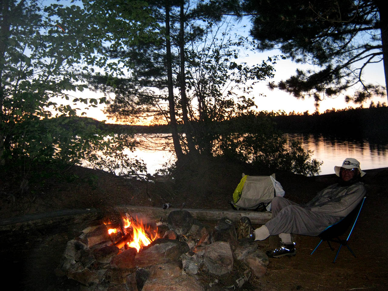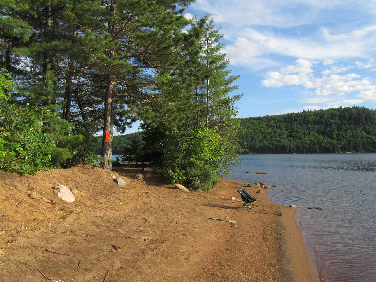 Landing Topography of under-water approach: Sandy beach to the south and a sand-and-gravel beach to the north. Impediments to disembarking from and/or unloading a canoe: This campsite is on a small point with a beach approach on both sides. Topography to tent sites: Very short low grade. South beach landing ... North beach landing and scenic view area... Campsite Campsite maintenance: regular Size of open area: Somewhat open over the firepit area, which is only sheltered from the lake by a line of bushes. The tentsites are covered by pines, but are open to winds off the lake. Extent of tree cover: 75%. Degree of levelness: Level, with a moderate grade inland. Number of level tent sites: Room for 3 tents. North exposure: View north up the lake and exposed to wind. East exposure: Forest. South exposure: Trees and bushes block most of the view and wind, unless one steps out onto the beach. West exposure: Line of bushes blocks the view and some of the wind, unless one steps out onto the beach. Looking west from tentsite area toward firepit area and lake ... Looking northwest from behind tentsite area ... Looking northwest across the firepit ... Early morning view down the south beach ... General description: This campsite has a great view, a smooth shoreline and is quite open to the breezes off the lake. Its north beach offeres a great views and beach walk. Overall accessibility: This campsite's accessibility is easy.